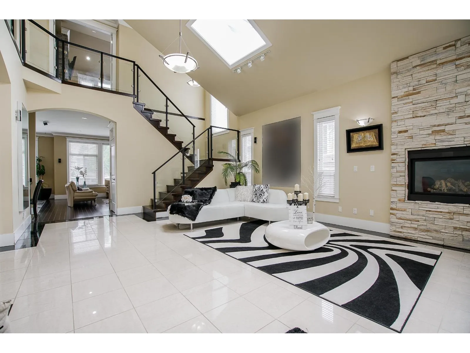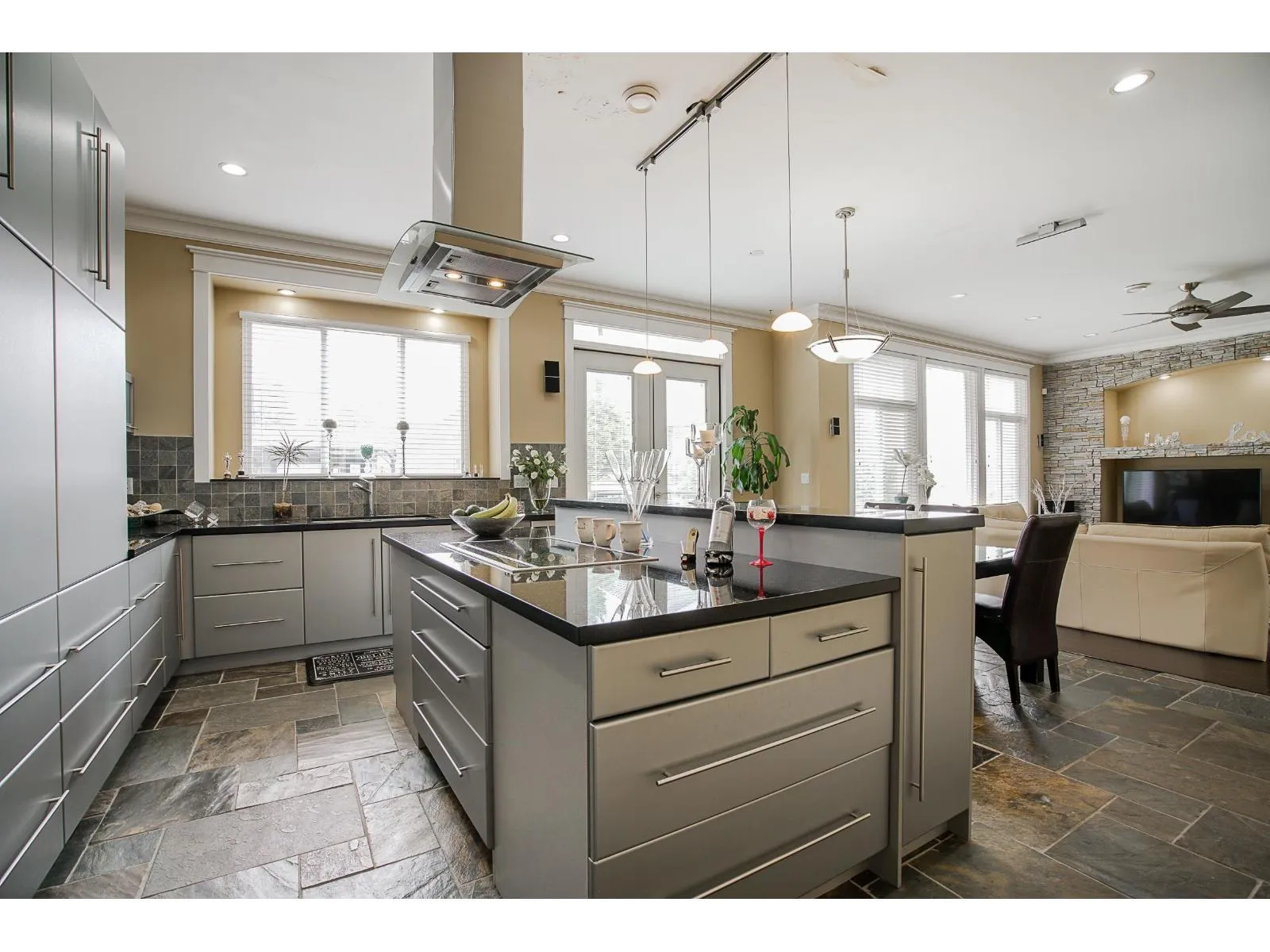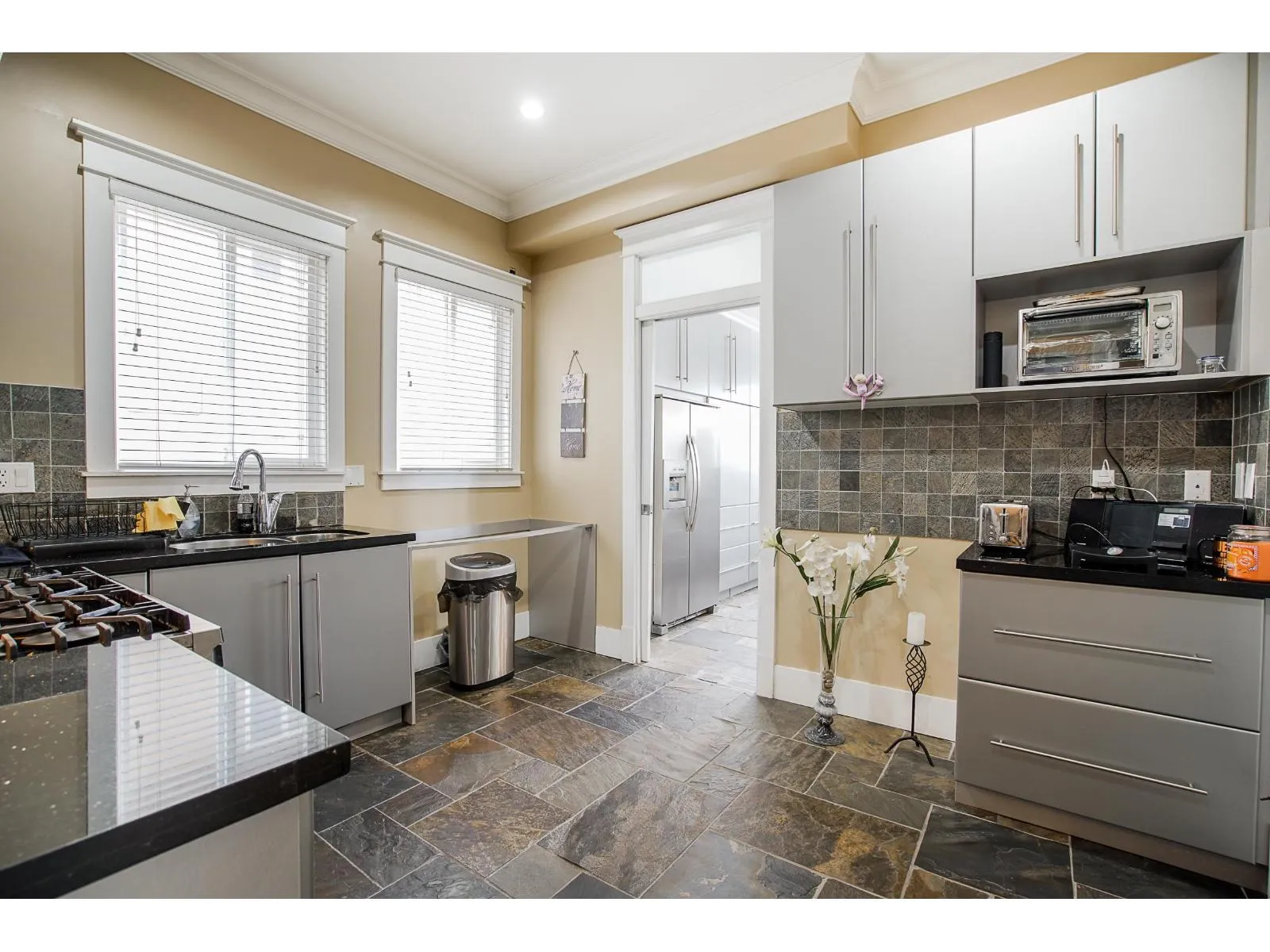 Welcome to this beautifully custom-built home in a quiet neighbourhood, offering almost 4,800 sq ft of luxury living. Designed with quality craftsmanship, it features an open-concept layout with soaring ceilings, oversized tiles, hardwood flooring, and elegant finishes throughout. The European-style main kitchen and separate spice kitchen include soft-closing drawers and Black Galaxy granite countertops. Radiant in-floor heating spans all three levels, along with 4x4 skylights, tile roof, Hardyplank siding, central A/C, and built-in vacuum. Upstairs offers 4 bedrooms and 3 baths, including two primary bedrooms with ensuites and jacuzzi tubs. Two 2-bedroom suites provide excellent rental income potential. (id:27476)