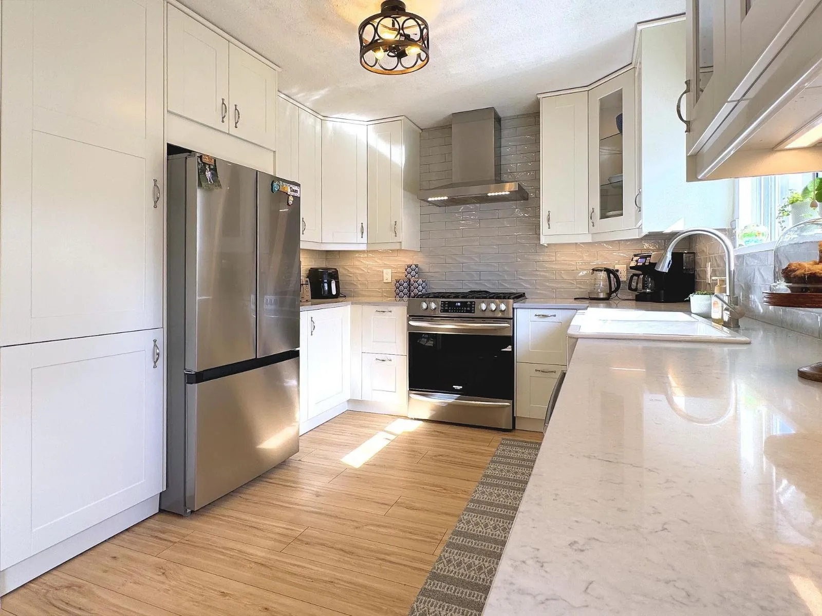 Sparkling and reliable. This nicely updated 3 bedrm, side-split home has been much improved by the owners. All plumbing is now Pex and to the road. A new high-eff furnace in 2022 incl central air con. Roof is just 12 years old. Inside, renovations incl a new full height kitchen, with subway tile backsplash, over-counter lighting, glass display doors and quartz counters around a farmhouse sink, + new appliances 2022 and 2026. There's farmhouse style bathrms with subway tiles and free-standing vanities. The main bedrm ensuite with frameless glass shower, no-fog mirror, and w/i closet. It's updated flooring, paint and lighting throughout. Outside the patio roof cover stays and provides rain shelter for BC bbq days (note the n/gas outlet). It's a wonderful family home to buy with confidence. (id:27476)