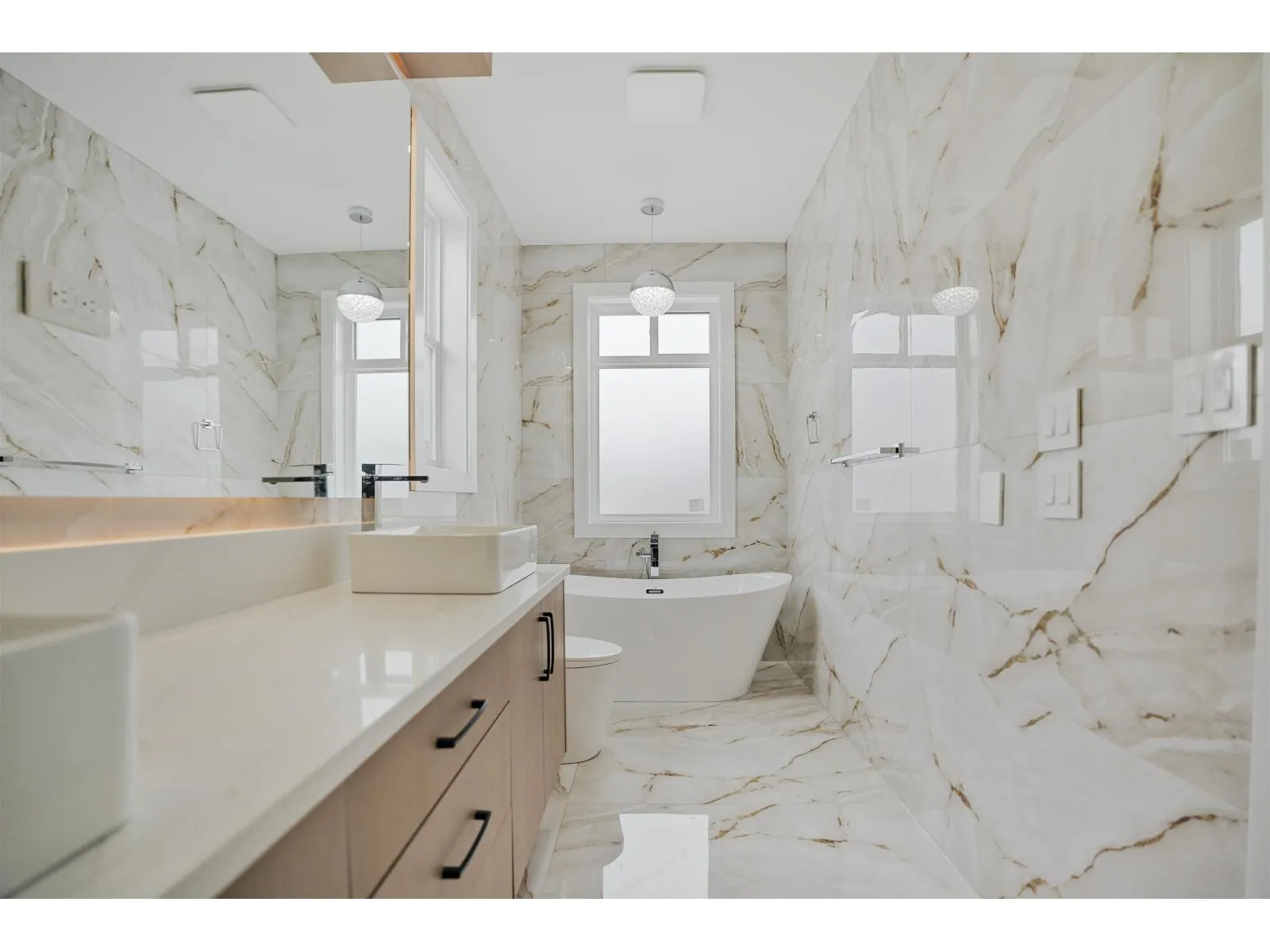 Experience modern luxury in this brand new Grandview Heights duplex! Boasting 7 bedrooms and 5 bathrooms, the main floor features a spacious open-concept family and dining area, spice kitchen, and large patio perfect for entertaining. A main floor bedroom and full bath add flexibility for guests or multi-generational living. Upstairs offers a beautiful primary bedroom with a luxurious ensuite, plus three additional bedrooms. A legal 2-bedroom above-ground suite provides rental income potential. Conveniently located near a golf course, shopping centers, highways, and just minutes from the U.S. border. (id:27476)