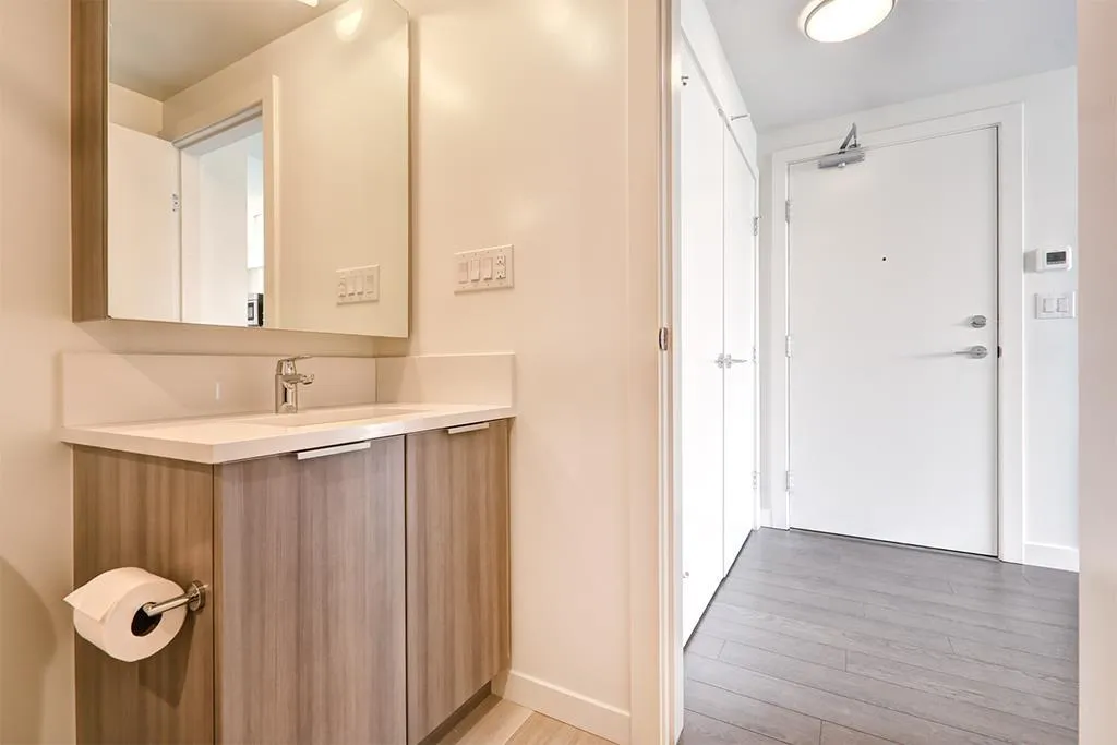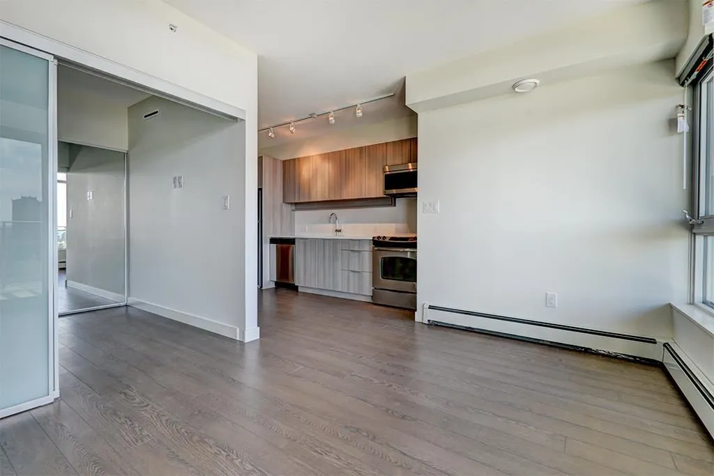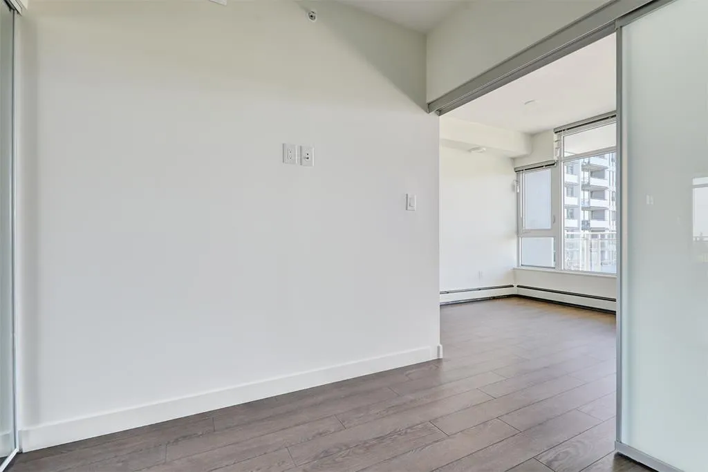 This is a very functionally designed 452sf, 1 bedroom, 1 bathroom condo with a huge covered view balcony. The foyer has access to the laundry closet and the 4 pcs bathroom. The kitchen has one row of veneer cabinets, stainless steel appliances, engineered stone countertops, and fully tiled backsplash. The bright living room has one whole side of wall-to-wall, floor-to-ceiling glass wall with glass sliding doors to the view balcony. The adjacent bedroom has sliding doors and a closet with mirrored doors. The 4 pcs bathroom features classy tiled floors, tub surround, veneer vanity, engineered stone countertop w/ an under-mount sink. Rent includes 1 parking stall and 1 locker. (id:27476)