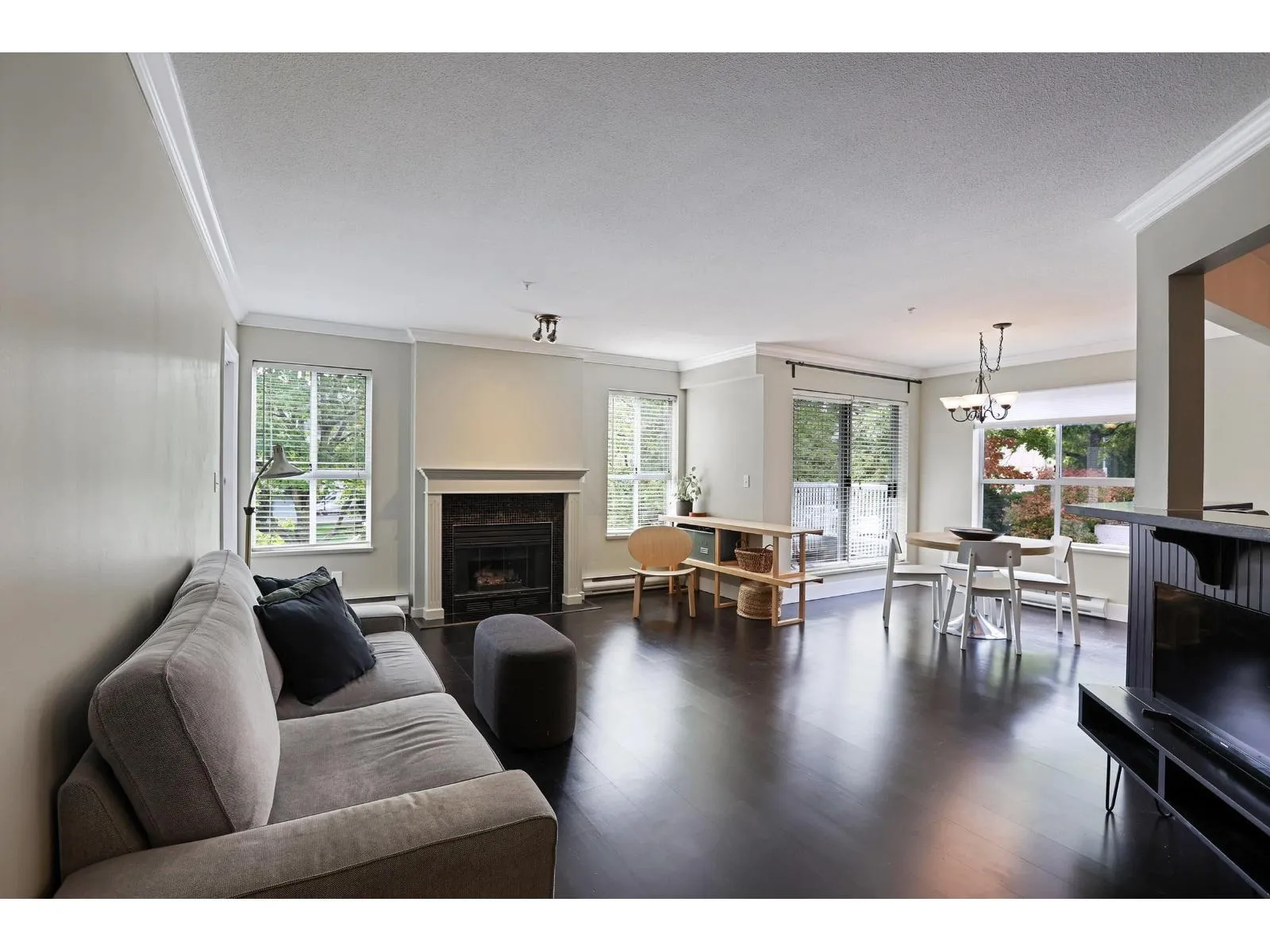 BRIGHT SW CORNER UNIT at Windsor Court! This best price per sq ft SUNNY 2 bed, 2 bath upper condo offers 1,148 sq ft of spacious open-concept living. Features include updated kitchen cabinetry, stainless steel appliances, pantry, and laminate flooring throughout. Cozy gas fireplace and two private balconies to enjoy all-day sun. Quietly positioned on the desirable 19th Avenue side with added street parking. Beautiful inner courtyard gardens in a friendly, well-maintained complex. Includes 1 underground parking stall and storage locker. Prime South Surrey location close to schools, shopping, restaurants, parks, and transit! Quick close possible! (id:27476)