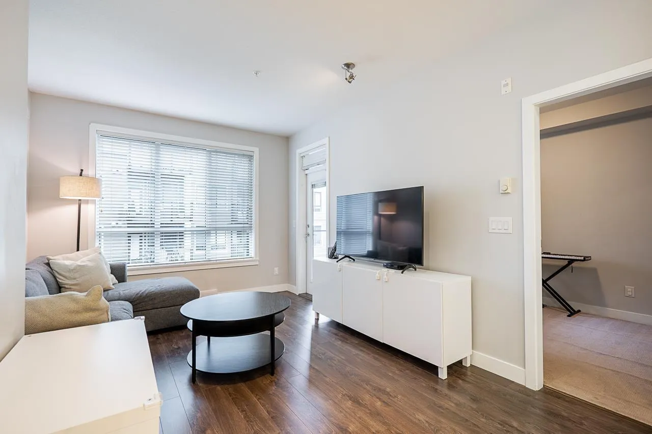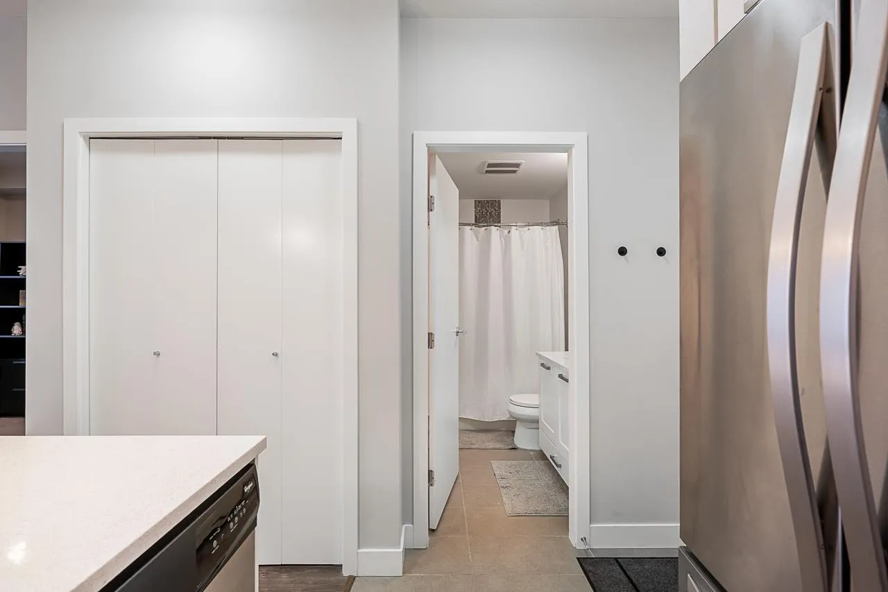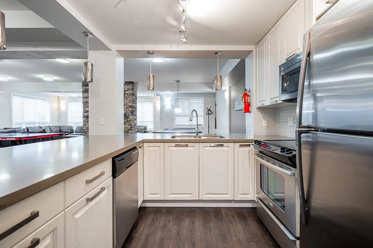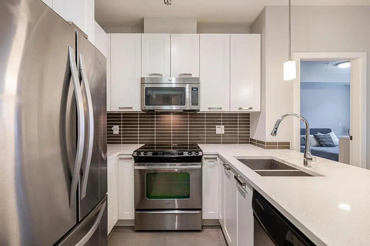 Welcome to G3 Residence - a beautifully maintained, bright corner 2-bed, 2-bath home on the 2nd floor with 9-ft ceilings and expansive windows that flood the space with natural light. The thoughtful layout places the primary bedroom with ensuite and walk-in closet on one side and the second bedroom on the opposite side for privacy. Enjoy an open gourmet kitchen with quartz counters, stainless steel appliances and shaker cabinetry, in-suite laundry, a covered deck, and one parking stall. Relax in the serene private courtyard with a bridge and water features, or take advantage of exceptional building amenities including a large clubhouse with kitchen, gym, ping-pong, billiards, guest suite, lush gardens and a playground. Perfectly located steps from restaurants, schools and more. Book now! (id:27476)