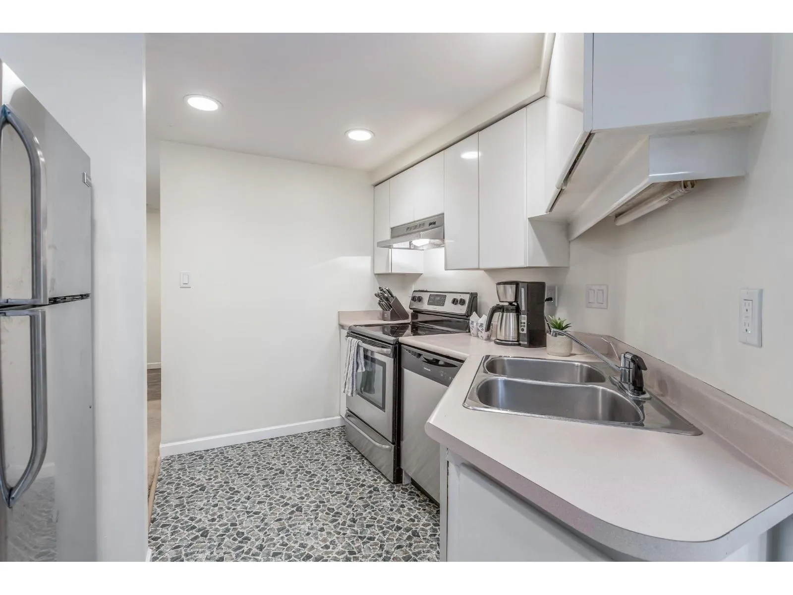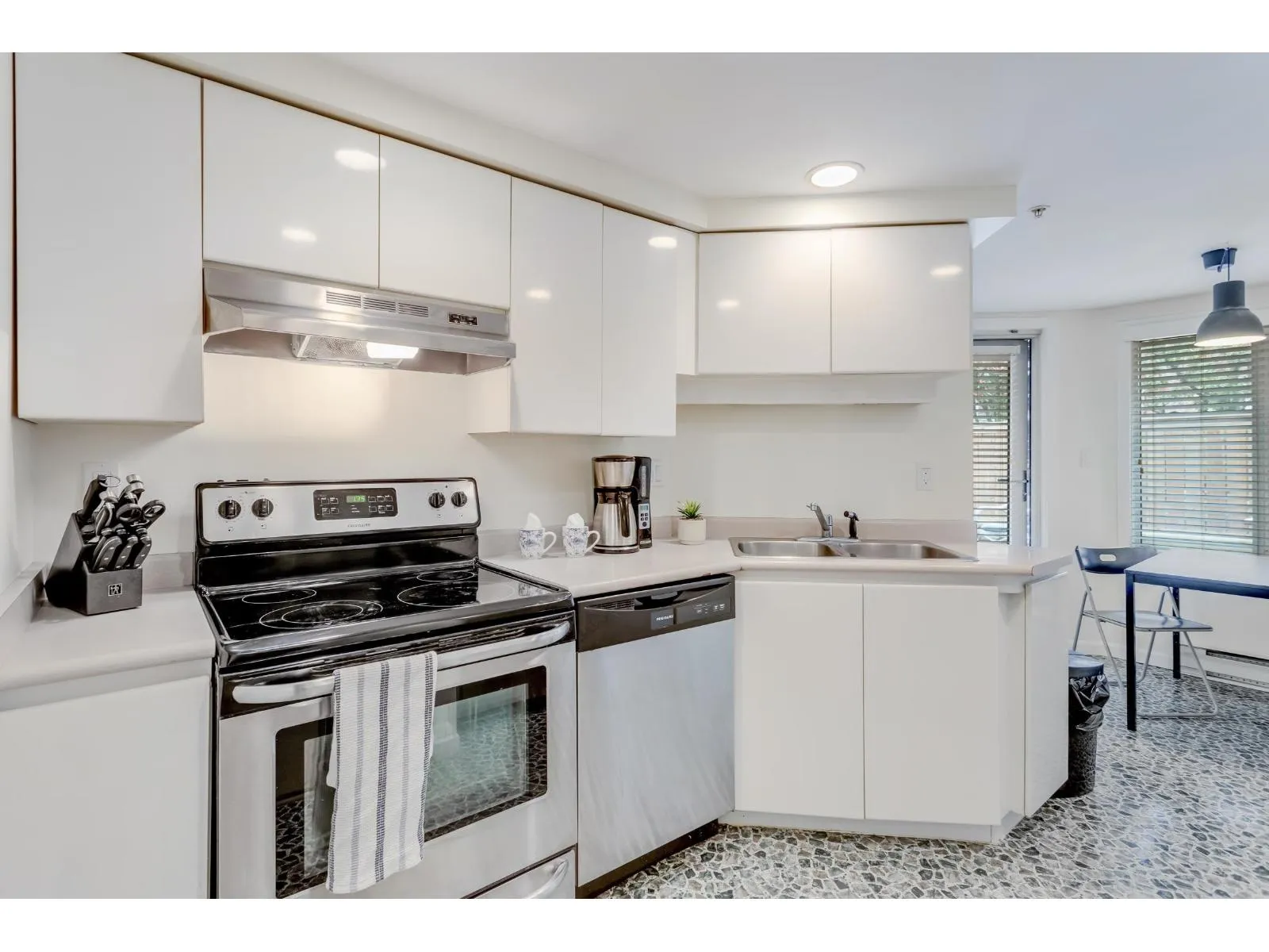 Welcome to Highpoint Garden, a meticulously upgraded concrete building with a fully renewed exterior, complete rain-screening, and a new roof. This bright and inviting ground-floor end unit features 2 bedrooms and 2 bathrooms, complemented by a spacious wraparound patio. Thoughtfully updated with elegant 2" white faux wood blinds, fresh paint, stainless steel appliances. Residents enjoy premium amenities including an outdoor pool, Year Round Hot tub and fitness centre. Ideally situated near Green Timbers Park, Guildford Mall, recreation facilities, shopping, dining, and transit just steps away. ** Secondary parking stall easy to get** (id:27476)
