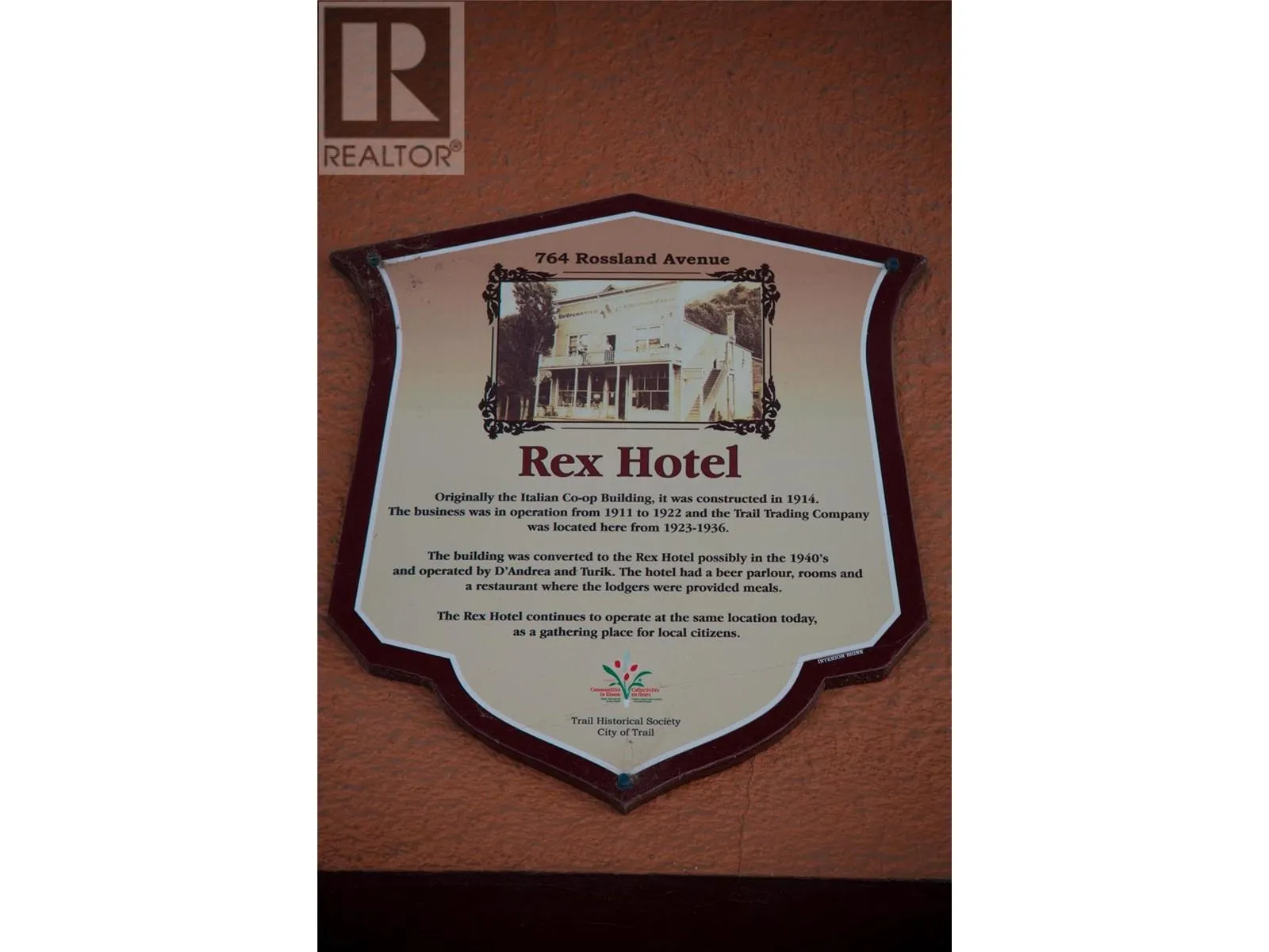 Don't miss this outstanding owner/operator opportunity in the heart of Trail! The Rex Hotel at 764 Rossland Avenue is a high-potential commercial property offering restaurant, bar, and rental income possibilities. Whether youâre looking to run a popular sports bar, a full-service restaurant, or a profitable hotel, this property is ready for its next chapter. The main floor features a lively sports bar with pool tables, darts, foosball, and shuffleboard, creating an inviting space where patrons can enjoy great food, drinks, and live sports on multiple TVs. The fully equipped commercial kitchen is ideal for an owner-run restaurant or pub, offering a strong foundation for success. The highly desirable liquor license is a golden opportunity allowing service from 9 AM to 3 AM, maximizing revenue potential. Upstairs, the 12 rental rooms, 1 suite, and 3 shared bathrooms generate strong cash flow, with six units currently occupied and room for expansion. Whether you continue operating it as a hotel, transform it into a hostel, or offer long-term rentals, the options are endless. Located in a high-traffic area, this property ensures consistent demand and multiple income streams. This prime investment is close to downtown and packed with opportunityâcontact the Listing REALTOR® today for rental details and a private tour! (id:27476)