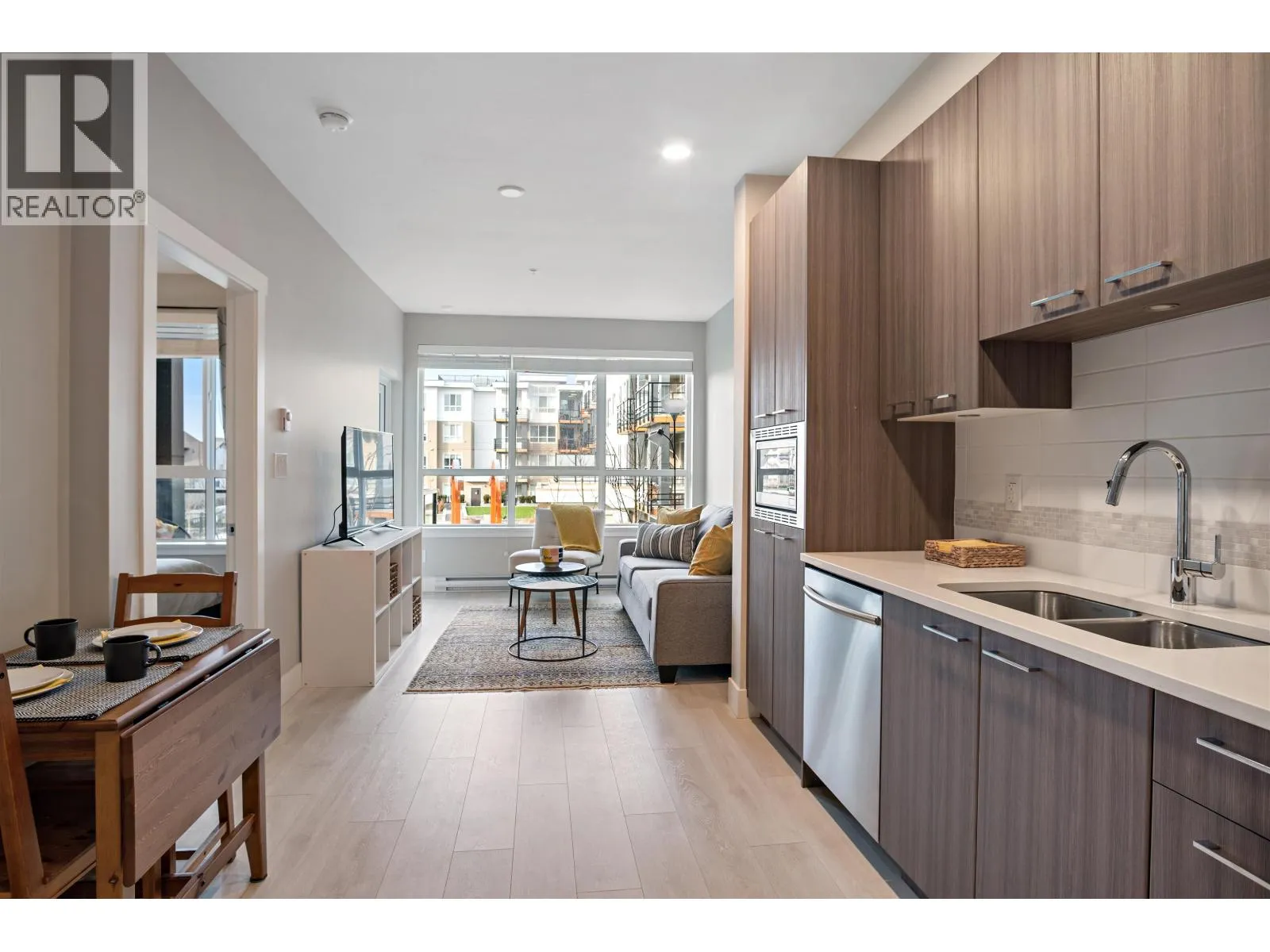 The perfect place to call home..... With an Unbeatable central location, this Fully Furnished, just over 5yr old, 508sf, modern 1 Bedroom (proper bedroom) and 1 Bath is for rent at the "Coast." This unit has a quiet peaceful outlook facing a beautifully landscaped courtyard. Fantastic open concept floor plan with good sized fully covered patio, Large bright windows to maximize natural light and peaceful living. Each room is a great size and space. Designer Paint with warm color scheme and wide plank laminate flooring, en-suite laundry, huge bedroom, and a large bathroom with soaker bathtub / shower, along with in-suite laundry. Nothing to do but move in and Enjoy! Fully Furnished Condo, comes with 1 underground parking stall and 1 storage locker. Fabulous location 5 minutes to Everything! (id:27476)