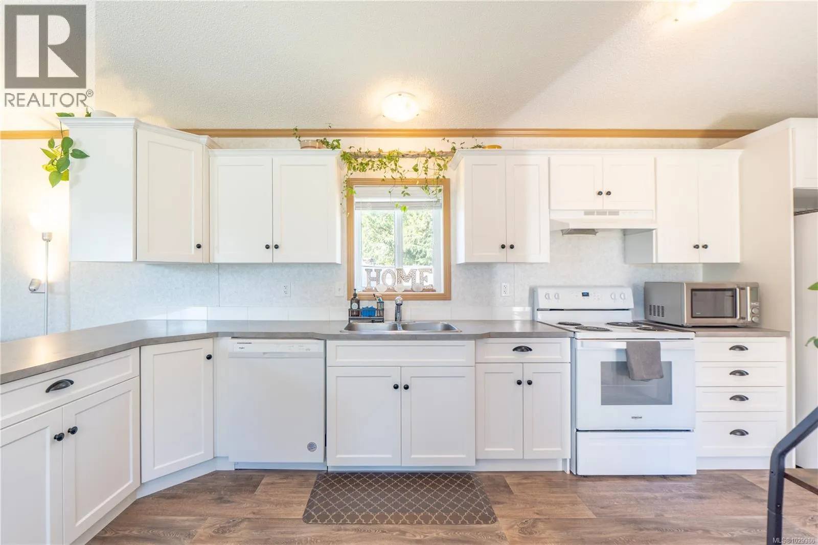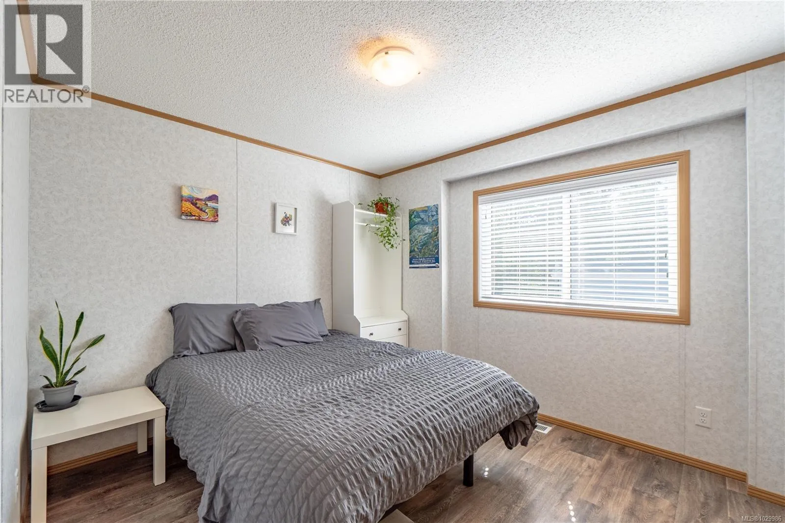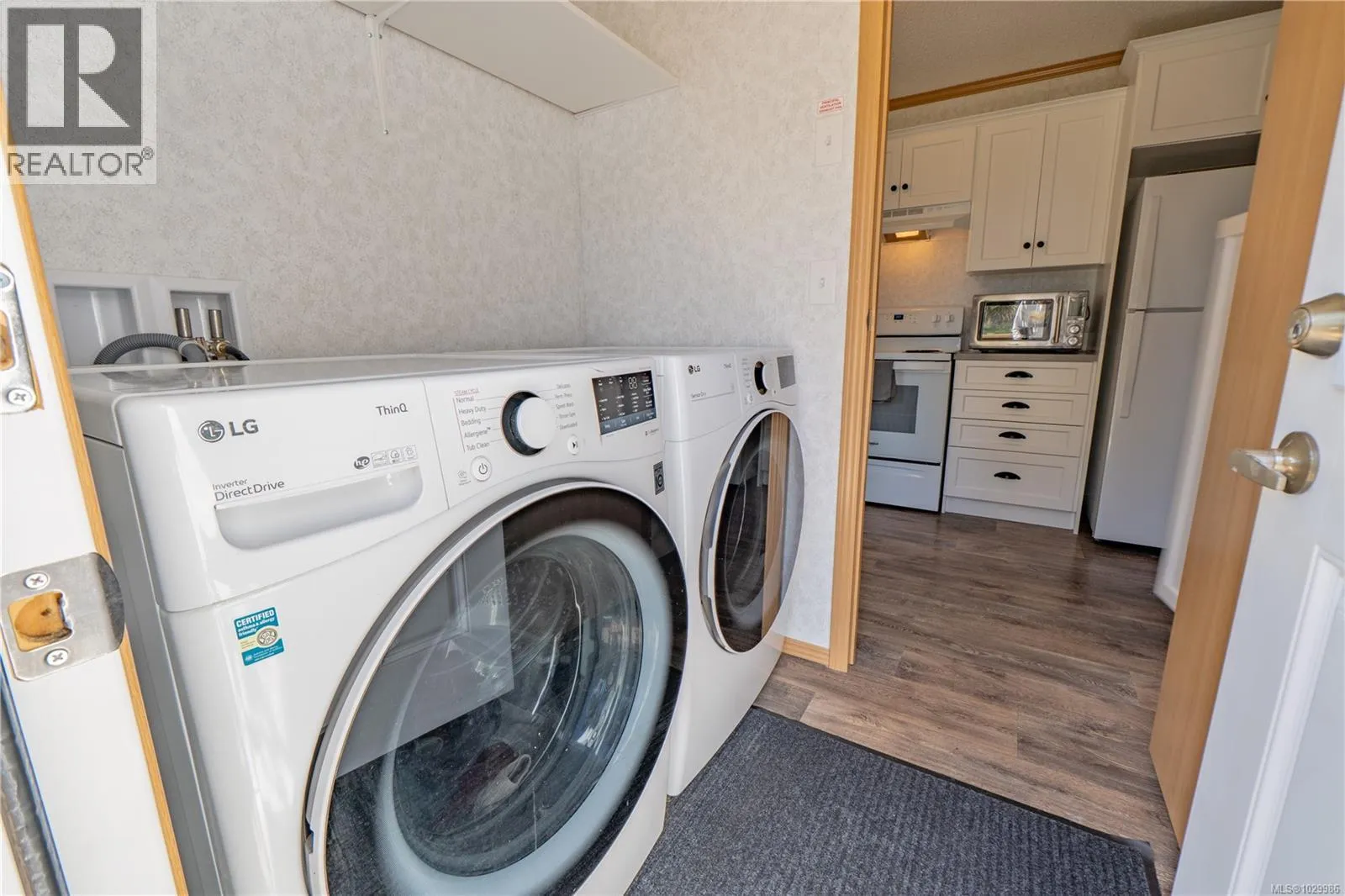 Like new modular home at Whispering Pines. Sunny 2-bedroom 2 bath home located at the end of a crescent. Most windows are south facing affording plenty of natural light in the open concept living areas with vaulted ceilings. Kitchen with L-shaped counter, pantry & plenty of cabinet space. Separate laundry room, accessed from kitchen, with secondary entry/exit & sunny deck. Main bedroom features large soaker tub & walk-in closet, second bedroom at opposite end of home with adjacent bathroom. Easy care linoleum flooring throughout & high efficiency electric furnace. Exterior entry crawl, plus shed on concrete pad provide extra storage room. Trail access across street to Marine Drive with proximity to Big Beach & Wild Pacific Trail. Excellent starter or retirement home, or this property also lends itself nicely to a roommate situation with space for parking on either side of home. Possibility for expanding yard/garden space with Manager approval. (id:27476)