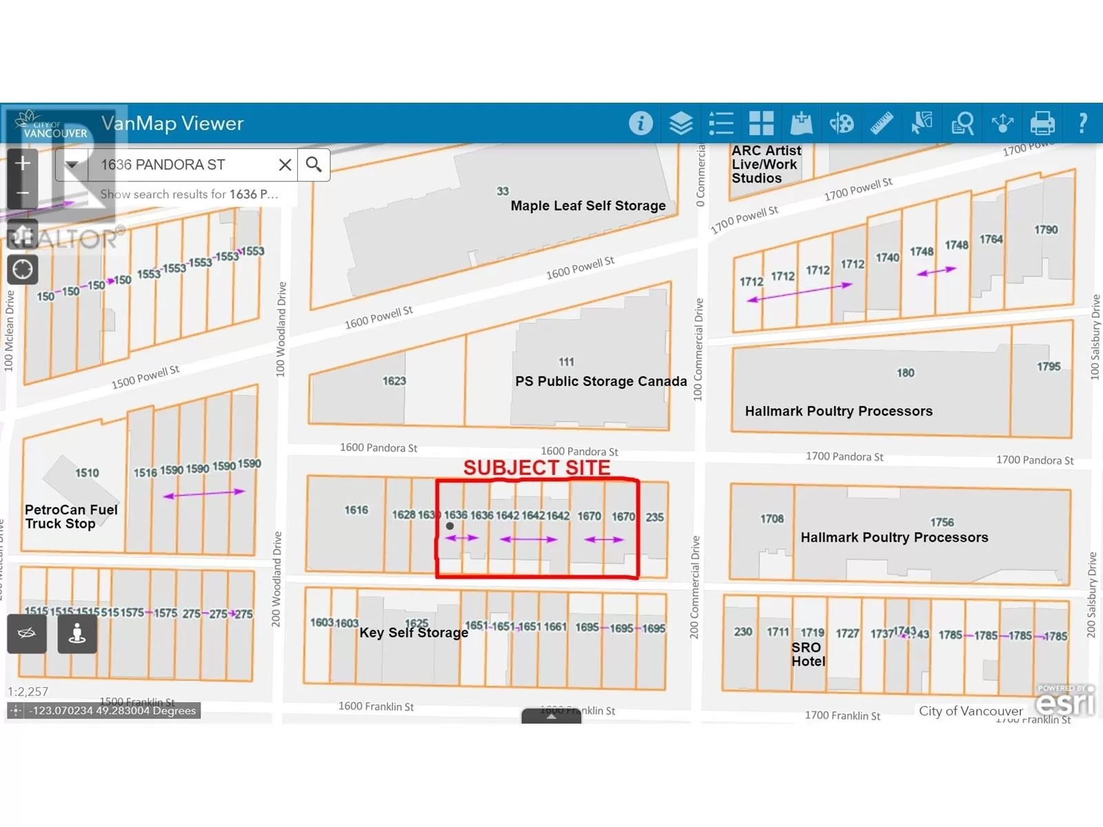 Modern & recent $350k renovation incl. new: windows, paint & carpets. Warehouse completely pressure washed, floor grinded & re-leveled w/ fresh concrete. Then passed COV safety inspections & issued new occupancy cert. 18 ft. ceiling. 7,257 SF of leaseable area. Recently vacant w/ mkt rents of $24 per SF Net = 3.9% cap rate. Adjacent bldgs same owner 1642 & 1670 Pandora also on MLS. Heavy Industrial redevelopment site. Site is 8,052 SQFT of land & 66 FT of frontage along Pandora St. First time to sales market since built in 1991. Present M2 zoning allows Floor Space Ratio to 5.0 times the site size (40,260 buildable SQFT) for allowed uses of manufacturing, wholesaling, transportation & storage. Site is directly across the 4 storey PS Public Storage (74k SF floor area) & directly behind the newer 7 storey SmartStop Storage (90k SF). 2021 Phases 1 & 2 Environmental Analysis done. Jul 2024 BC Property Tax Assessment: Land $4.323M + Bldg $10,200. Starting price $111 per Buildable SQFT or $557 per SQFT of land. (id:27476)