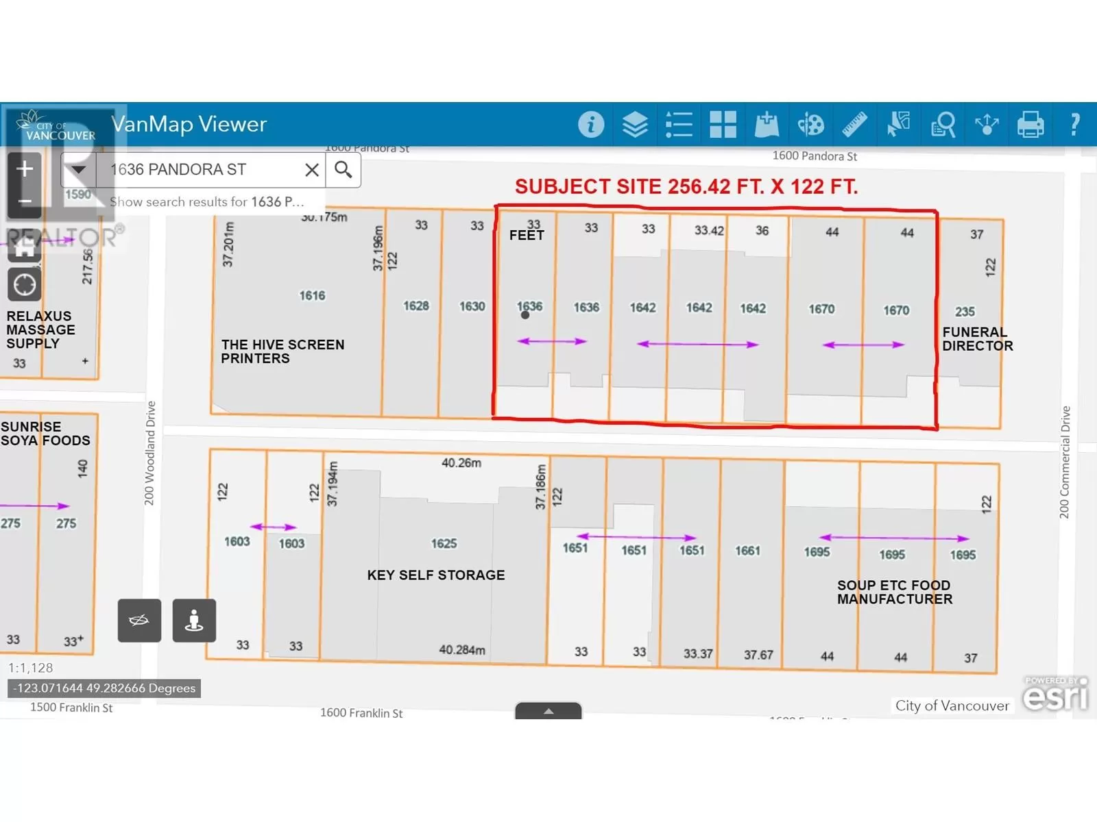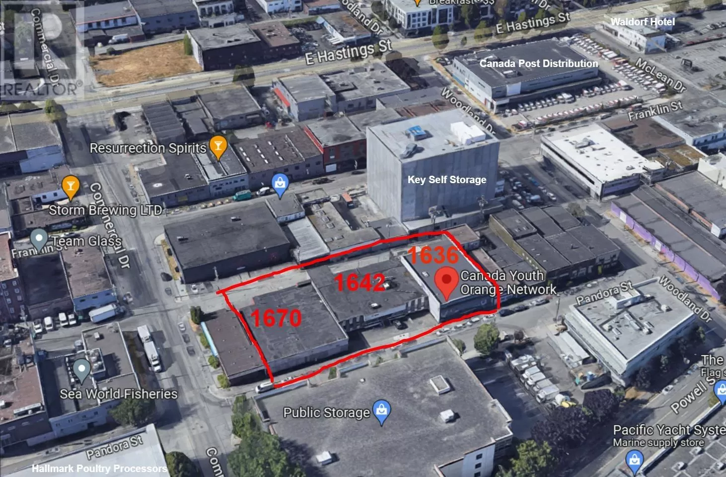 Big discount below Jul 2024 BC Ppty Tax Assessed Value $5.645M. Starting price $80 per Buildable SQFT or $400 per SQFT of land. Existing old timer warehouse w/ 8,540 SF of leaseable area. Recently vacant w/ mkt rents of $20 per SF Net = 4% cap rate. Adjacent bldgs same owner 1642 & 1636 Pandora also on MLS, use 1642 Pandora together as side wall open pass thru w/ dbl fire rollup gate for addtl 8,221 SF space. Heavy Industrial redevelopment site, 2 blks North of E. Hastings at Commercial Dr., & 3 blks South of Port of Van. waterfront, in East Van. Site is 10,736 SQFT of land & 88 FT of frontage along Pandora St. First time to sales market in approx. 50 yrs. Present M2 zoning allows Floor Space Ratio to 5.0 times the site size (53,680 buildable SQFT) for allowed uses of manufacturing, wholesaling, transportation & storage. Site is directly across the 4 storey PS Public Storage (74K SF flr area) & directly behind the newer 7 storey SmartStop Storage (90K SF). 2021 Phases 1 & 2 Environmental Analysis done. (id:27476)