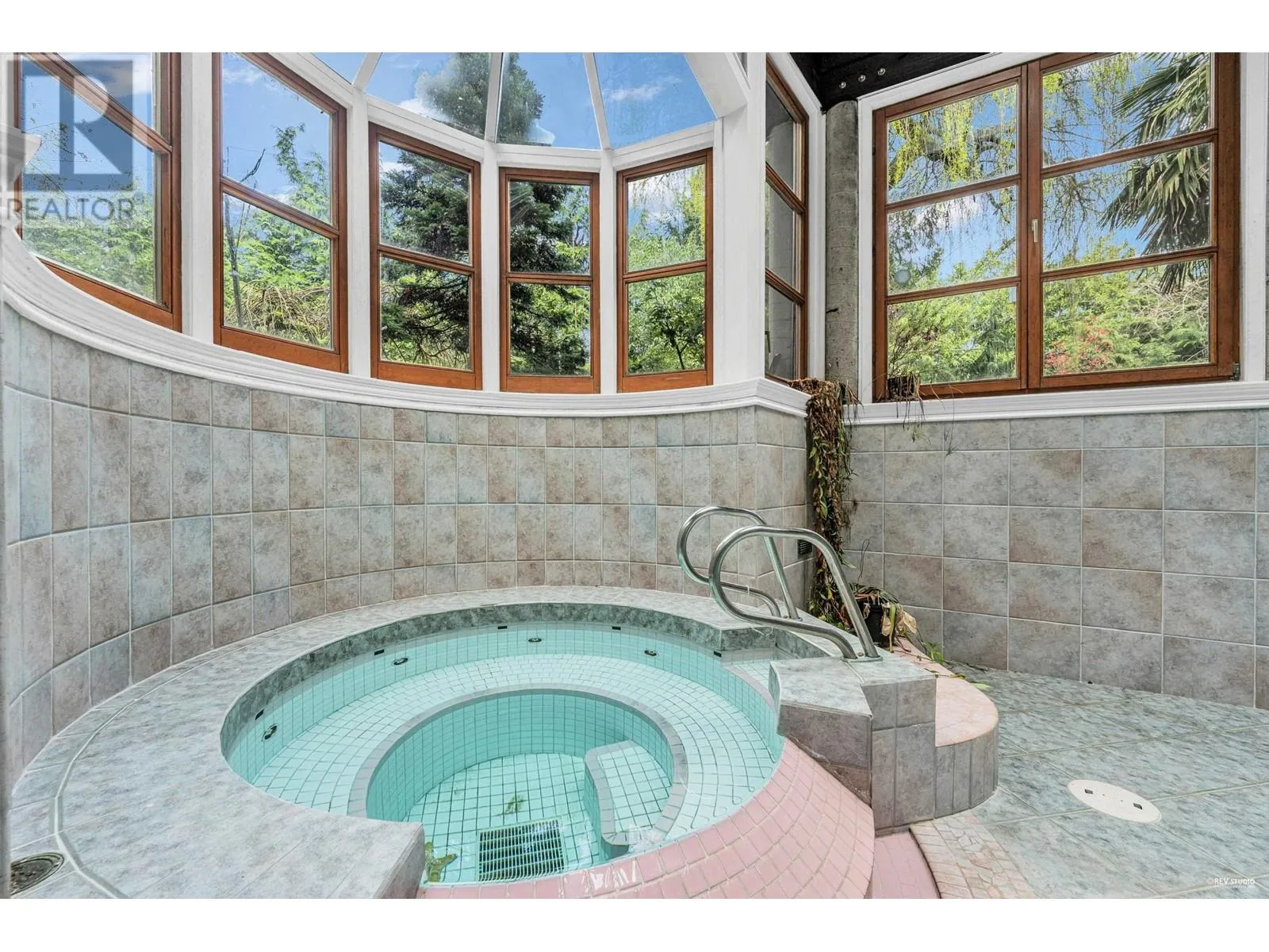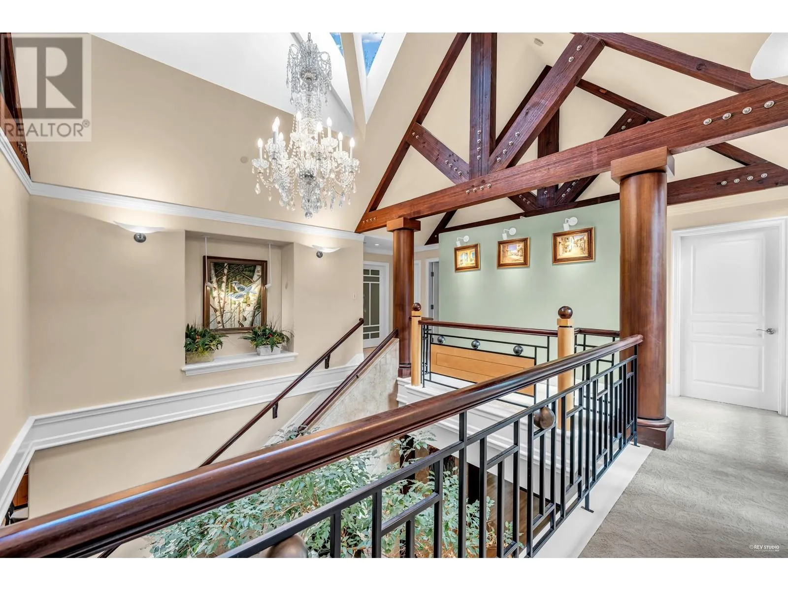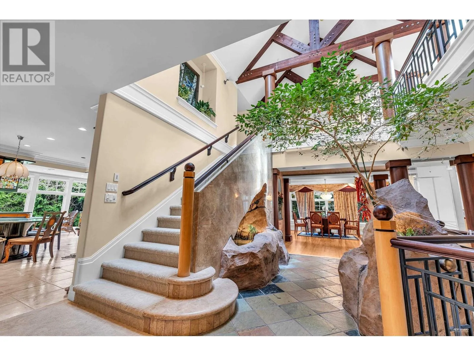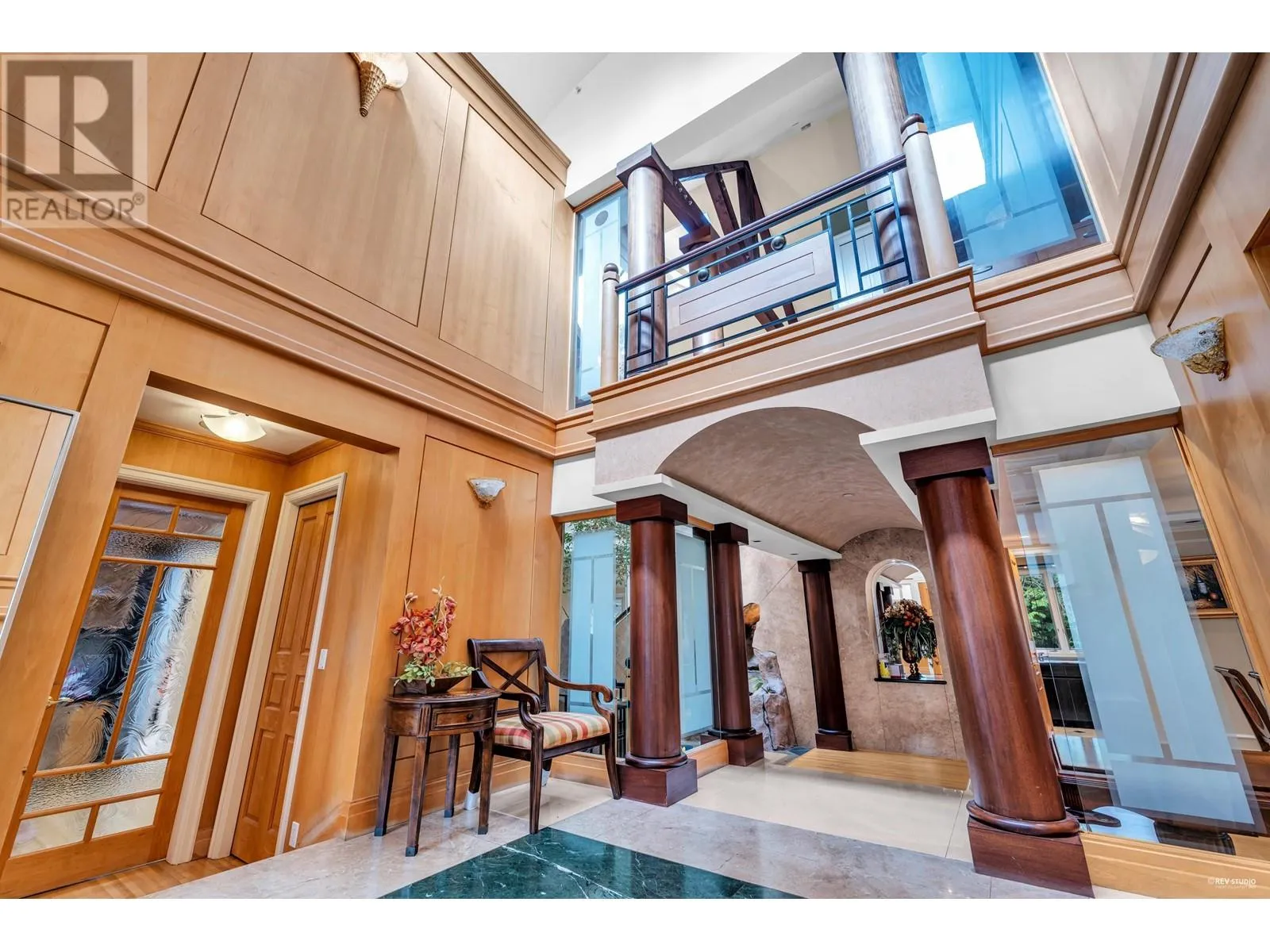 Stunning custom-built mansion in prestigious 1st Shaughnessy, showcasing exquisite craftsmanship and premium finishes. Features include a grand double-height foyer, indoor fish pond with waterfall, elegant living/dining areas, and maple hardwood flooring. The gourmet and wok kitchens are outfitted with top-tier appliances, opening to a large deck overlooking a landscaped backyard with a fish pond. Upstairs offers 4 spacious ensuite bedrooms (3 with steam showers), while the lower level includes a home theatre, gym, office, and guest suite. Additional luxuries: indoor pool, A/C, HRV, radiant heat, elevator, sauna, smart security, and 4-car garage-all set within a beautifully fenced garden. (id:27476)