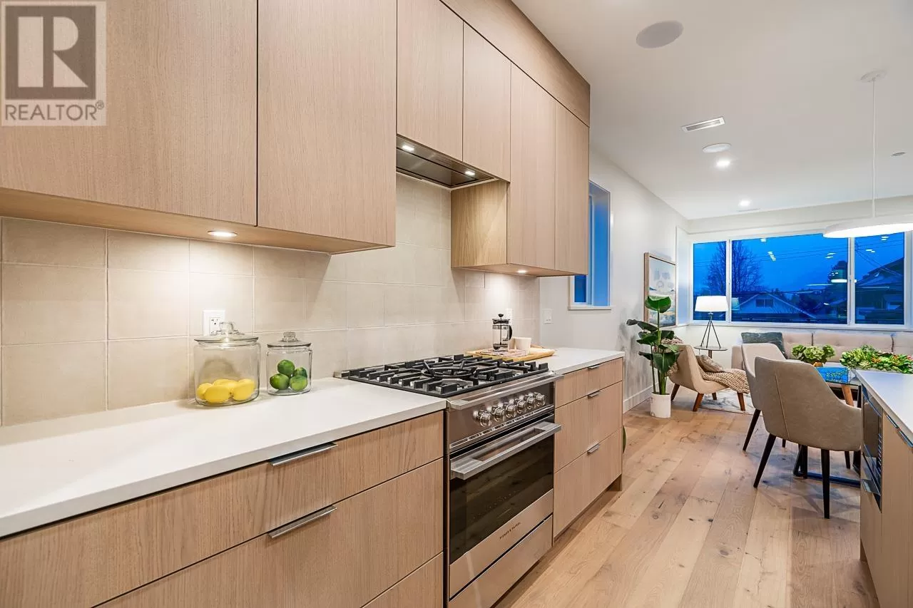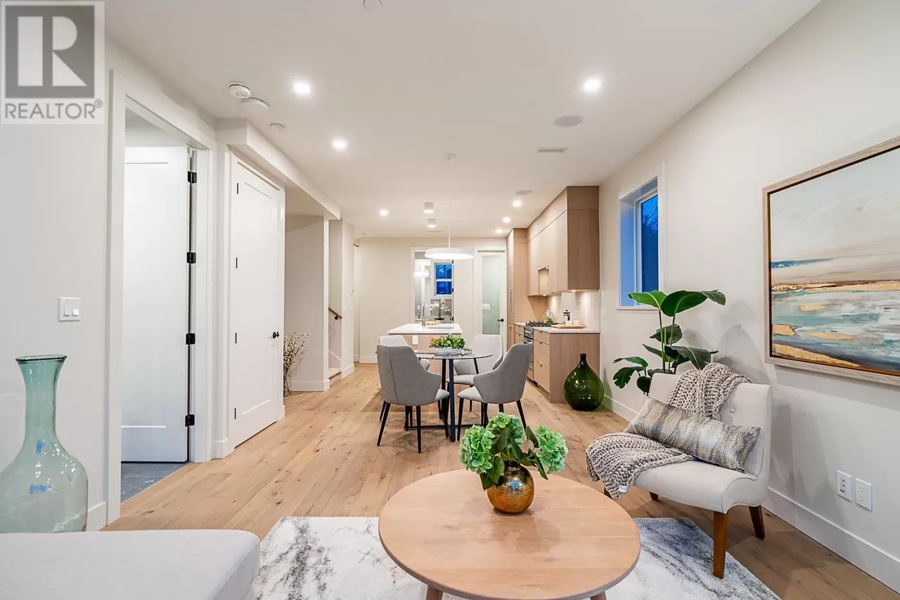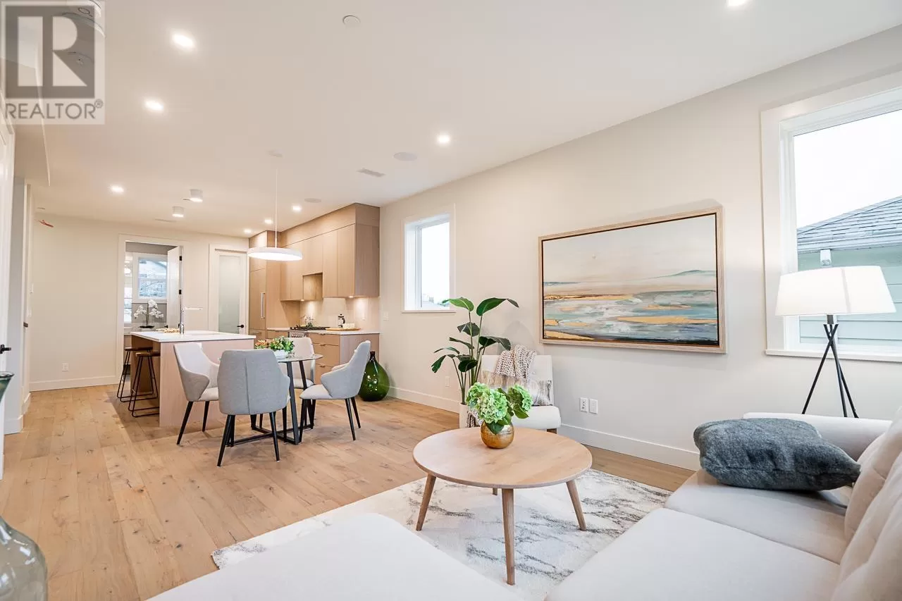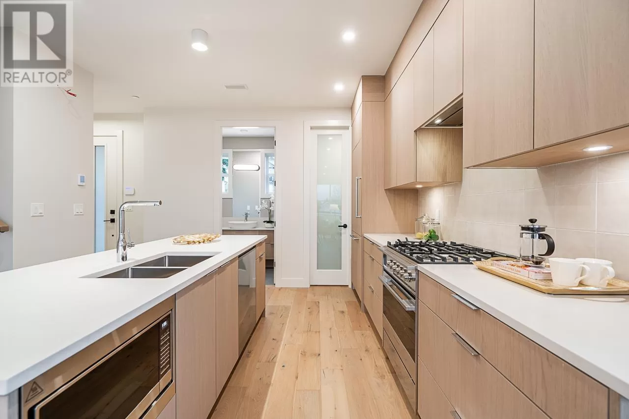 Outstanding mountain and water views from this modern, sleek half-duplex built by a long established European builder. Fabulous family neighbourhood close to parks, schools, and transit. Minutes to downtown and Hwy 1 access. Great room concept on main floor showcasing wide plank oak hardwood floors, high ceilings, and a gourmet kitchen with a pantry, eat-up island and Fisher & Paykel appliances. Upstairs has 3 bedrooms, including a beautiful primary bedroom with an ensuite, walk-in closet and large windows with spectacular views. The basement features a bright, legal 2 bdrm suite. The yard is beautifully landscaped with lighting, irrigation, feature trees and a rear deck overlooking the fenced backyard. Complete with a single garage and a paving stone parking spot with an automatic gate. (id:27476)