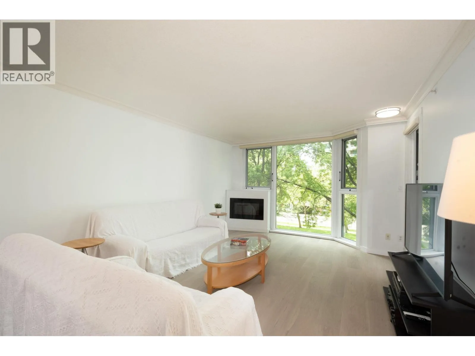 Sharpley Priced!! Prime Beach Ave location - just 1 block to the seawall and marina! This exceptionally large 2 BR, second-floor unit overlooks May & Lorne Brown Park features a private entry, brand-new engineered hardwood flooring, and fresh paint throughout. Bright living room boasts floor to ceiling window and corner electric fireplace. In 2024, the entire complex underwent significant capital upgrades, including a completely new rainscreen exterior, windows and doors, roof, and balconies - offering peace of mind and long-term value. Fabulous amenities include I/D pool, hot tub, saunas, gym, game room and a squash court. 1 pet allowed. This is perfect urban living with easy access to parks, shopping, restaurant and all city amenities. Easy to show with notice. Open House Nov 22, 2-4pm. (id:27476)