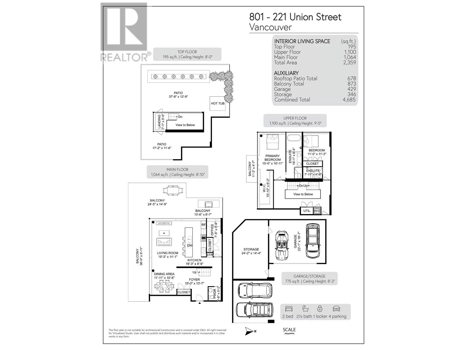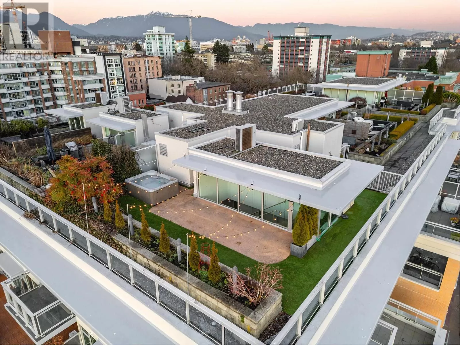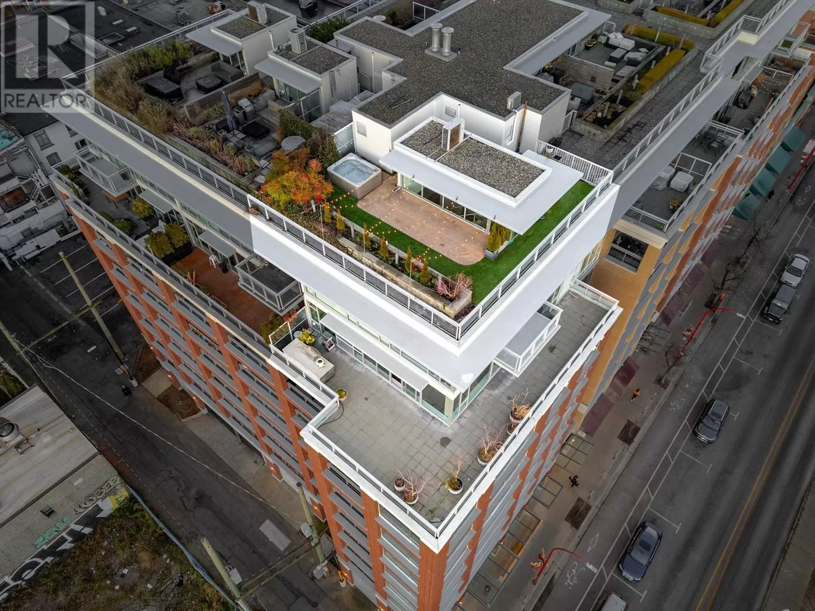 This is THE premier corner penthouse and was custom-designed for its original owner, offering an expansive three-level layout with 2,359 sqft of air-conditioned indoor living complemented by 1,551 sqft of private outdoor space. Step into the elegant marble foyer, where a floating concrete staircase ascends two stories to the stunning rooftop terrace. The main level boasts a spacious design, featuring a sunlit living and dining area, a gourmet chef's kitchen with integrated Wolf and Sub-Zero appliances, and a dedicated home office space. Upstairs, you'll find the luxurious private quarters, leading to the expansive rooftop oasis complete with a Jacuzzi and panoramic views. Additional feat: Control4 automation, concierge, two side/side parking stalls, a private two-car garage, & 346 sqft storage room (id:27476)