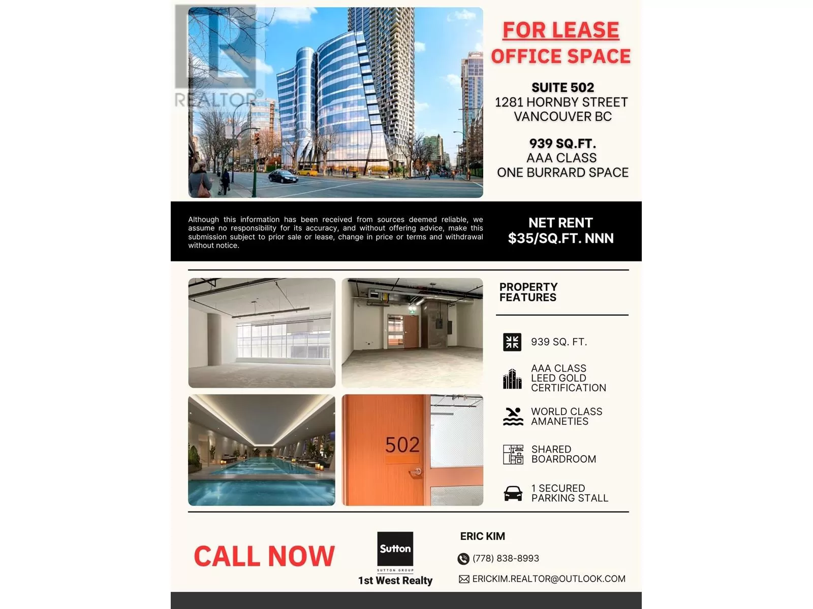 An exclusive opportunity to lease a prestigious AAA-class strata office in the iconic One Burrard Place, designed by renowned architect Bing Thom. This LEED Gold-certified tower blends striking architecture with sustainability at the heart of Downtown Vancouver. The available 939 sq. ft. unit features 11-foot ceilings, floor-to-ceiling windows, and a bright, open layout ideal for professionals or investors seeking a high-profile business address. Enjoy access to over 30,000 sq. ft. of premium amenities, including a state-of-the-art fitness centre, full-sized pool, children's clubhouse, and elegant indoor/outdoor lounge areas'offering a rare fusion of productivity, wellness, and luxury. Strategically located, Burrard Place provides effortless access to Yaletown, The West End, Kitsilano, and The Beach District'making it one of Vancouver's most coveted and connected commercial destinations. Contact listing agent today for more details. (id:27476)