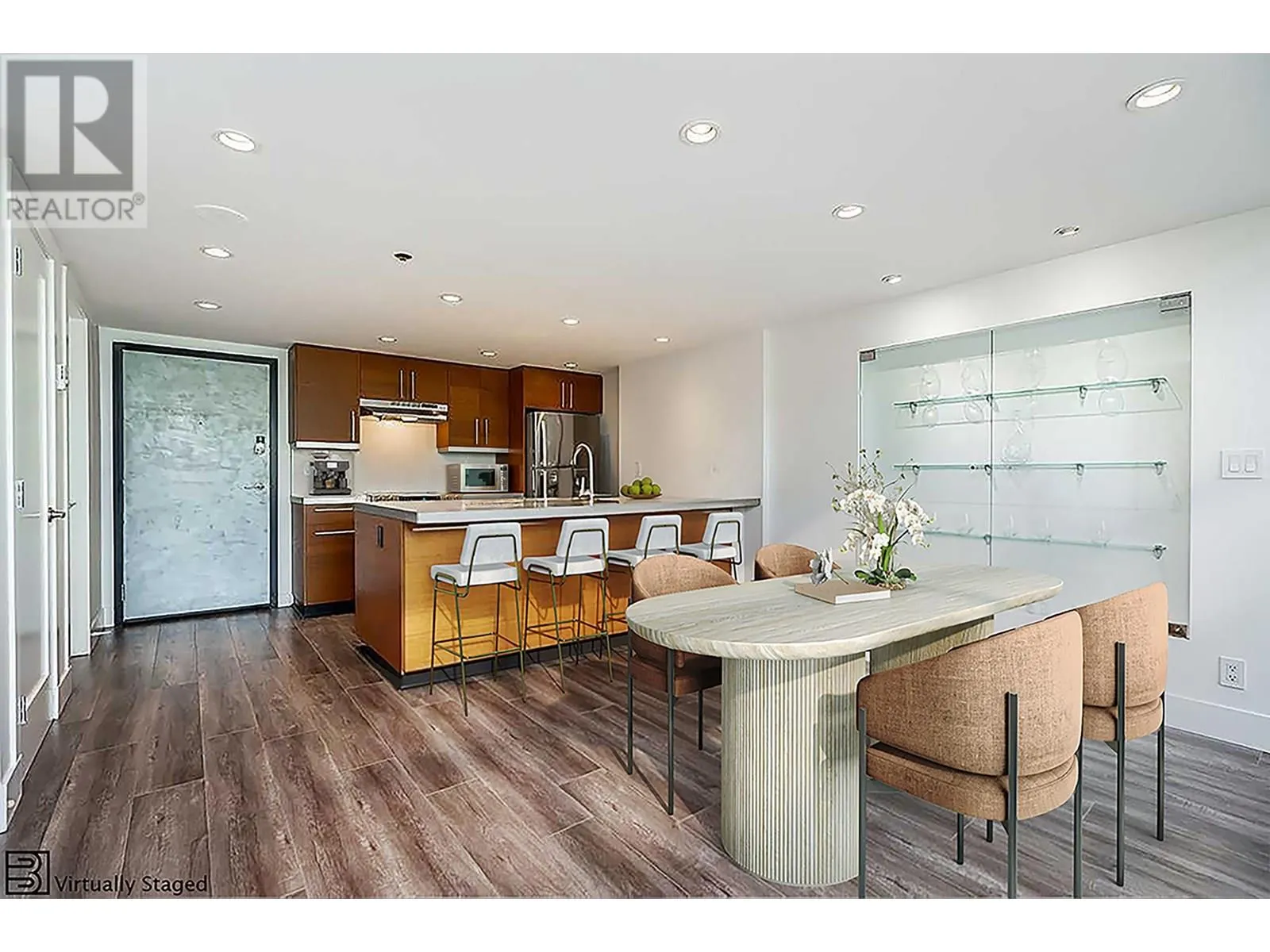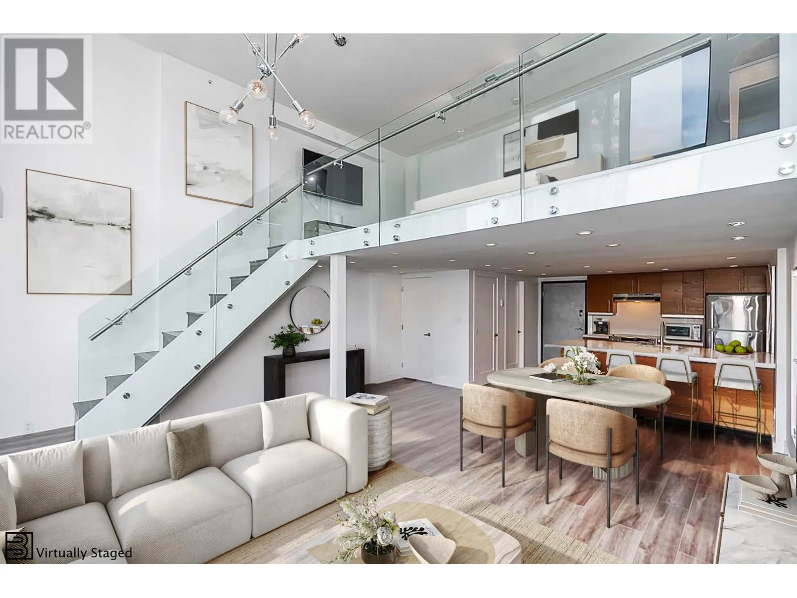 2 level loft. Features quality kitchen cabinetry, stainless steel appliances ( new fridge), brand new HW flooring, newer washer and dryer, custom island with cabinets on both sides & wine display in dining. The suite features TWO bathrooms, including an ensuite with a soaker tub, plus ample in-suite storage and a huge dressing room with plenty of custom built in closet space. Details throughout include elegant doors, mouldings, designer lighting, stylish tiling, and a frameless glass staircase and railings. A sunny southeast exposure gives the space good natural light, all on the QUIET SIDE of the building. Well-managed with great amenities, including a fitness room and expansive rooftop patios. 1 parking included. (id:27476)