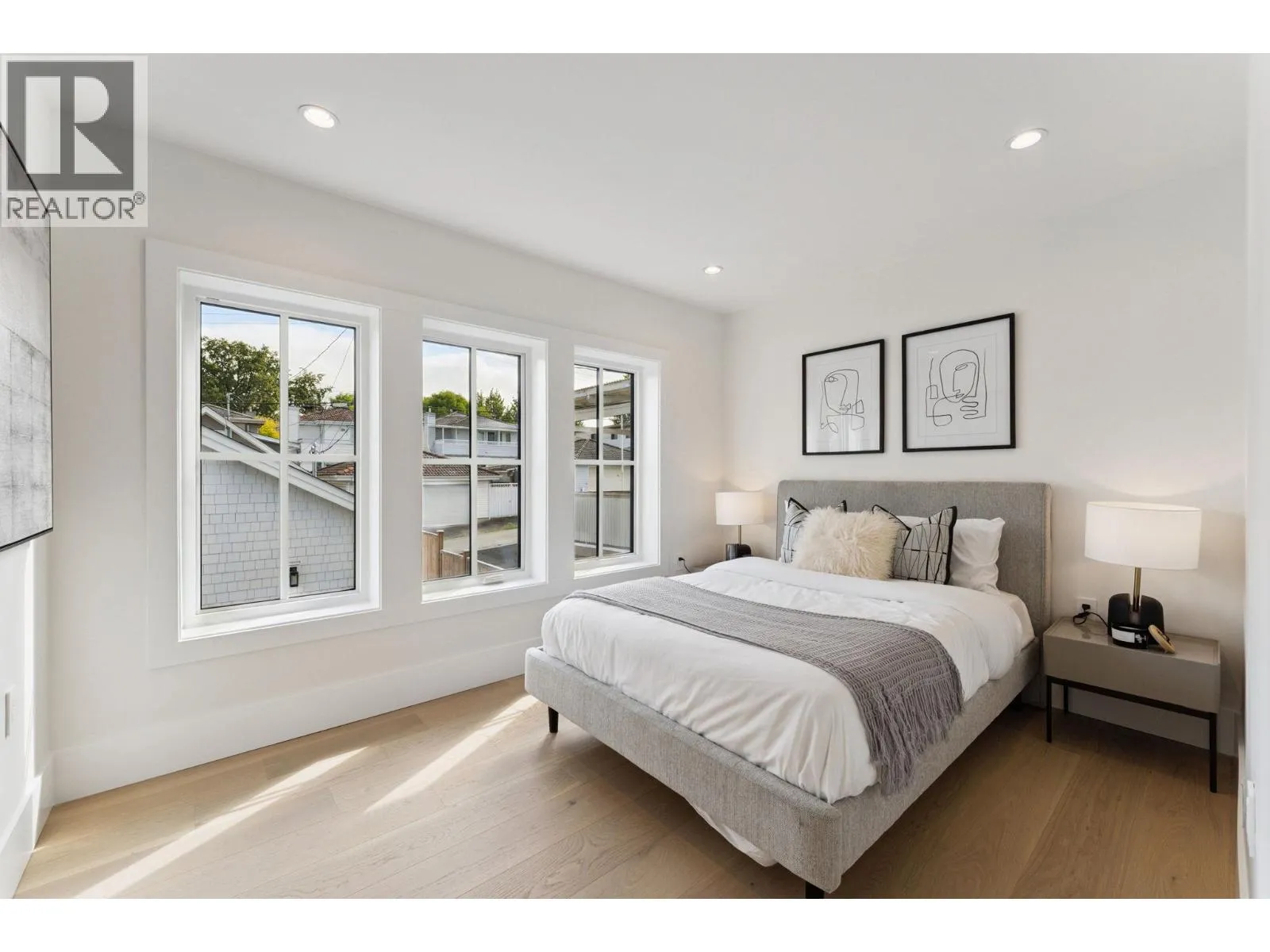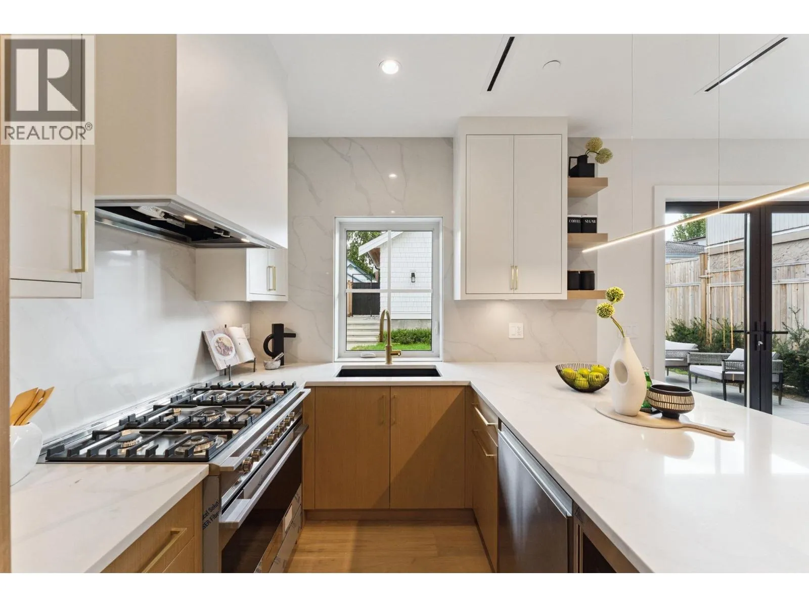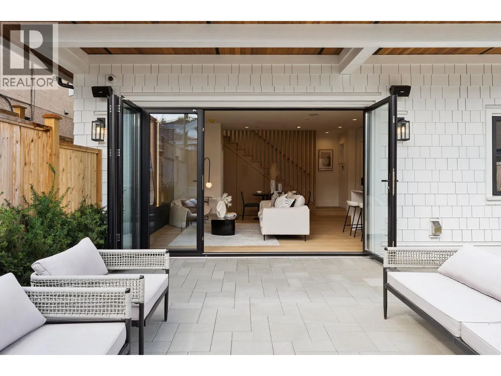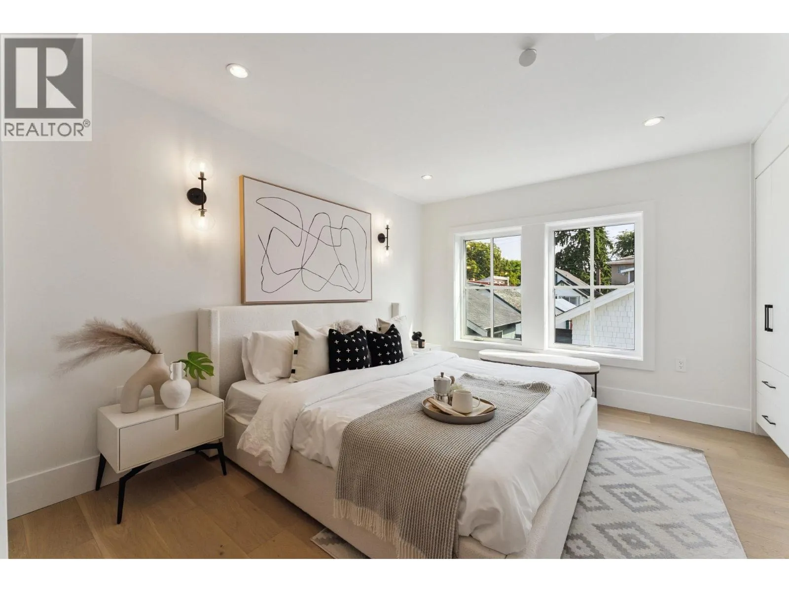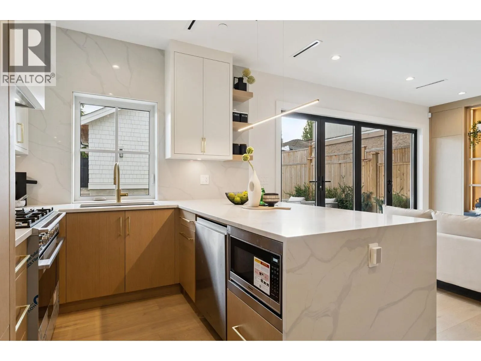 Welcome to this luxurious back-unit duplex crafted by Encore Collection in vibrant East Vancouver. Offering stunning downtown views, this home showcases high-end exterior finishes, blending Hardie, Brick, & Norwegian Fluted siding for a sophisticated design. This thoughtfully designed 3-bed, 3.5-bath home features an open-concept main floor that seamlessly connects the gourmet kitchen, living, dining, & outdoor spaces-perfect for both relaxing and entertaining. The kitchen is equipped with premium Fisher & Paykel appliances & sleek stone countertops. The second floor includes two primary beds, each w/its own luxurious ensuite. The top floor offers a spacious third bedroom with a private ensuite, providing the ultimate retreat for comfort & tranquility. Additional highlights include air conditioning, white oak hardwood floors, custom cabinetry, CCTV security, an alarm system, a 12' accordion patio door, & a private garage. (id:27476)