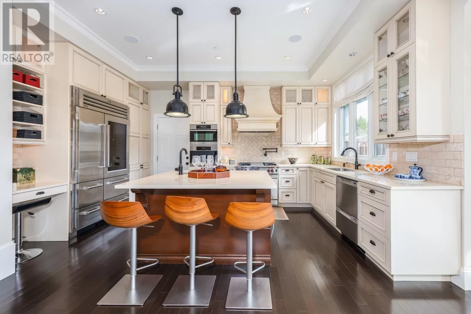 A CERTIFIED GREEN HOME! GORGEOUS, LUXURIOUS CUSTOM BUILT in prestigious Dunbar, a 4200 square ft of exquisite living space situated on 53 x 130.34 LANDSCAPED LOT with southern backyard in the park-like quiet street. STEPS away to ST. GEORGE'S CLOSE TO CROFTON PRIVATE SCHOOL, LORD BYNG HIGH SCHOOL, QUEEN ELIZABETH ELEM., UBC. This exceptional home offers the finest craftsmanship with loads of custom millwork and mouldings, 11' High ceiling, hardwood floor, open gourmet kitchen with high-end cabinetry & Sub Zero and Wolf Stainless steel commercial appliances,5 bedrooms & den, 6 baths, Media room & Rec. room,2 kitchens and 2 laundrys, OUTDOOR B.B.Q., Incredible energy efficiency geothermal heating and cooling system! Radiant floor heating, A/C, HRV. MUST SEE! (id:27476)