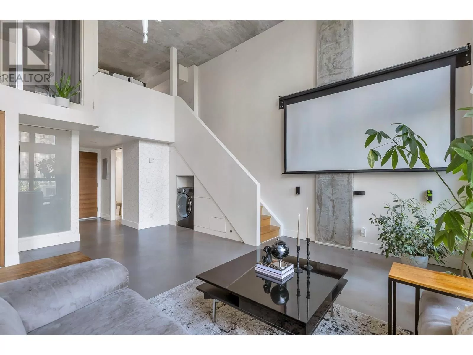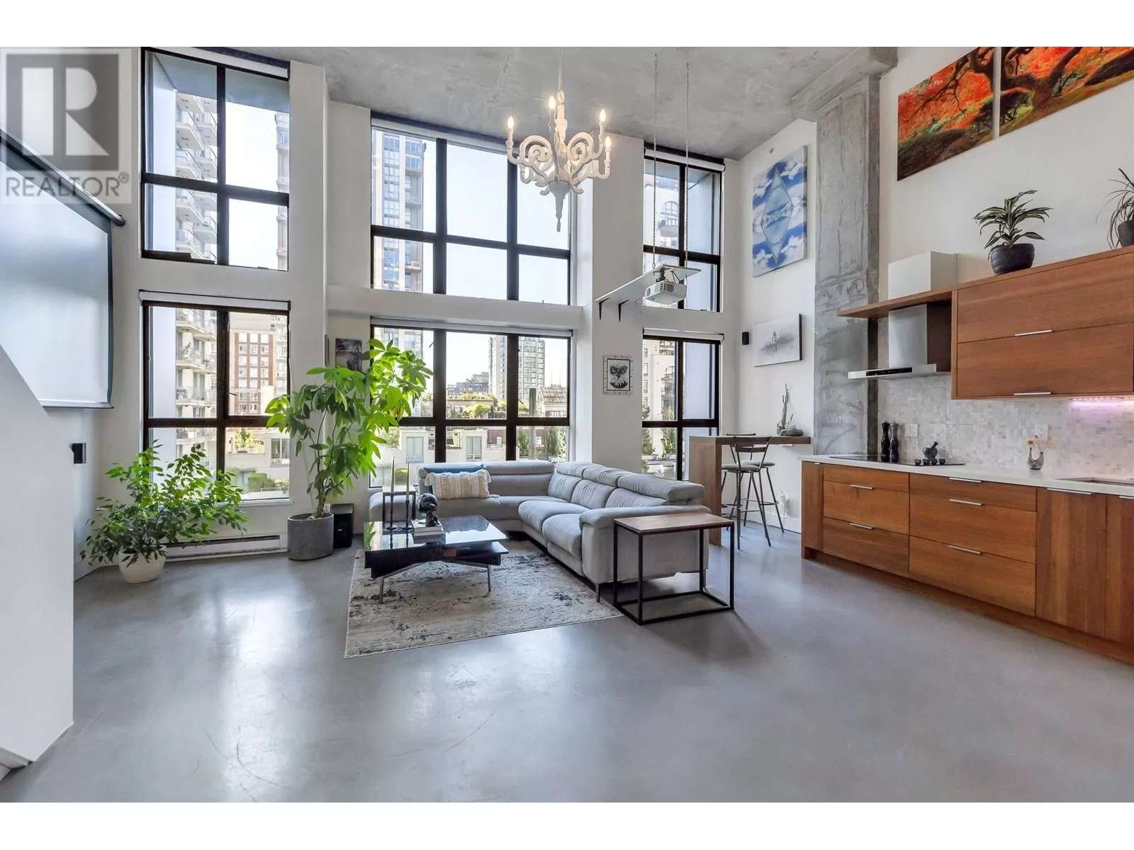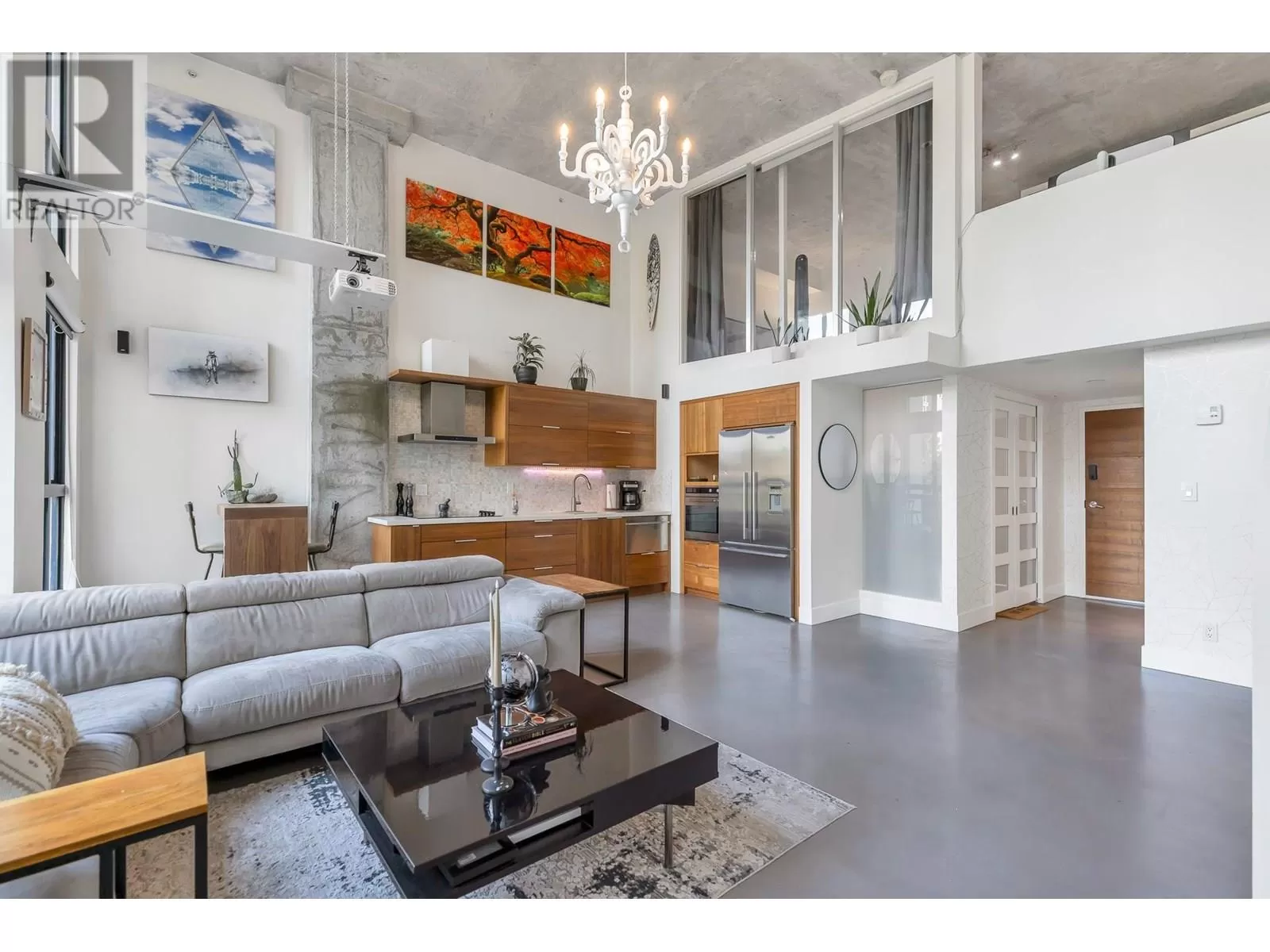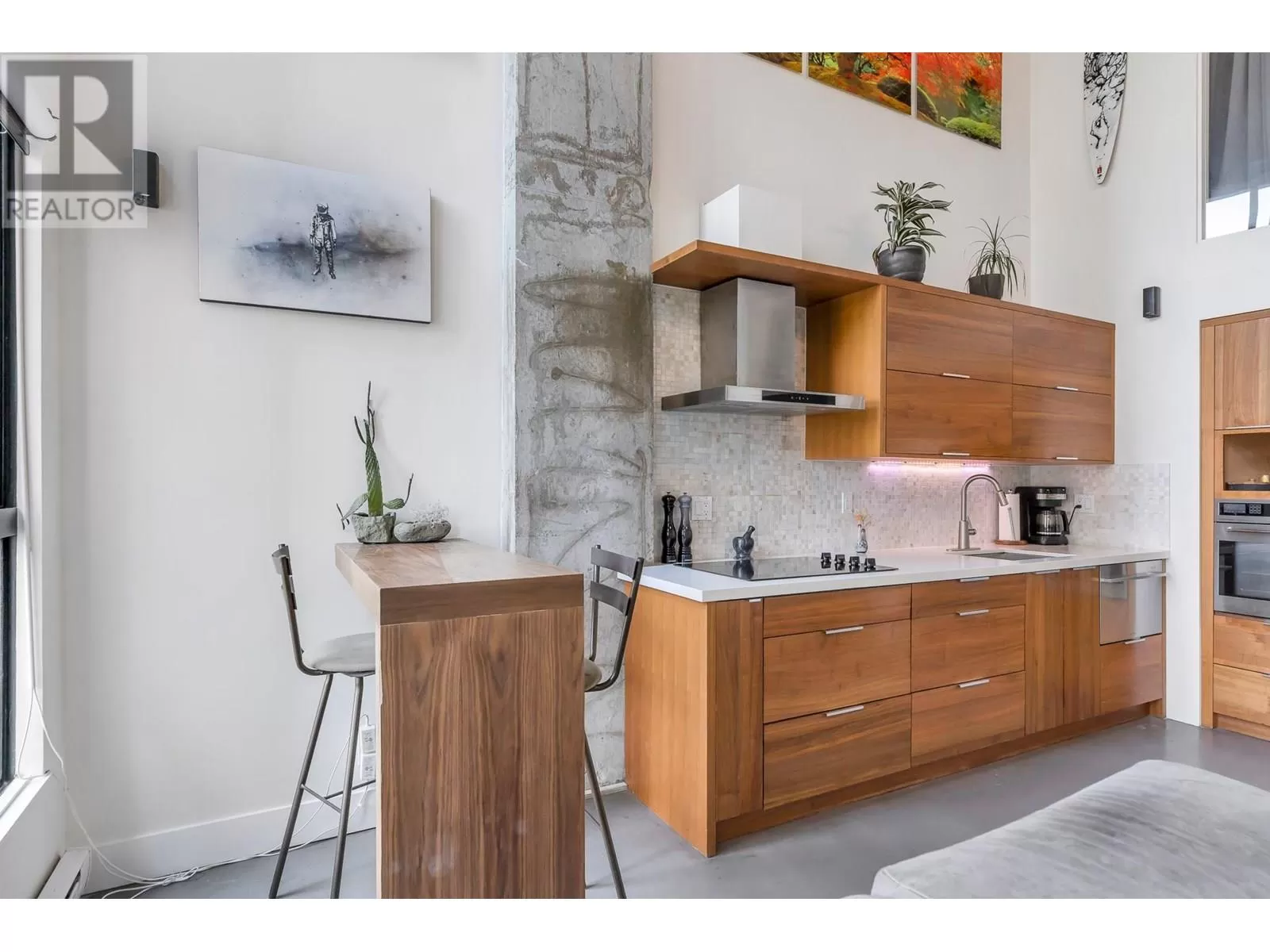 One of One opportunity at The Space Lofts. This floorplan is UNIQUE TO THE BUILDING! Fully renovated with warmth and character, this floorplan offers a 2-bedroom layout and a large kitchen. Dramatic double-height ceilings, polished concrete floors, and exposed concrete feature walls retain the loft's drama while the kitchen warms the space with walnut cabinetry, stone counters, mosaic backsplash, and full-sized appliances. Plenty of natural light from the triple window bank and South exposure. In-suite combined washer/dryer. 1 parking, 2 pets ok. (id:27476)