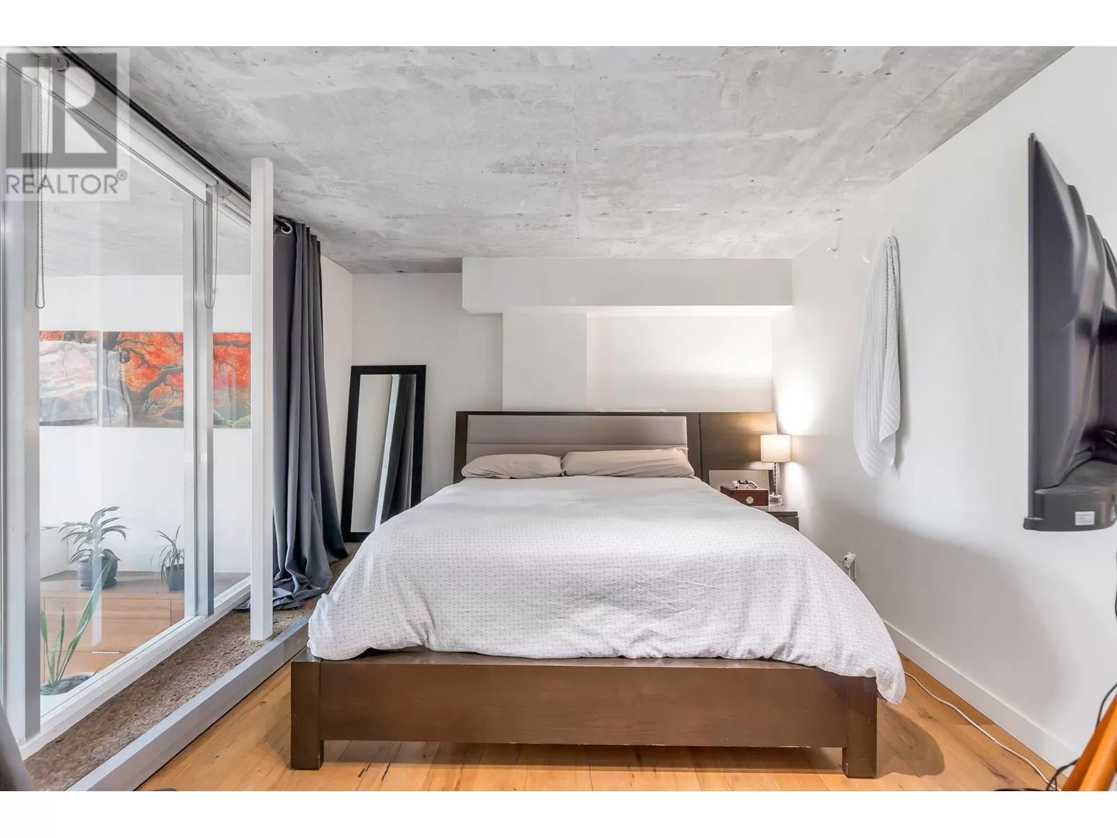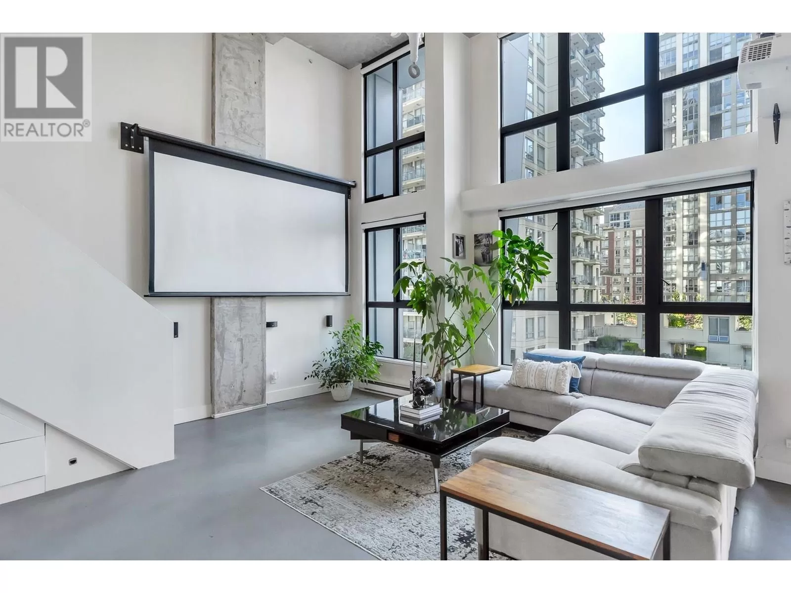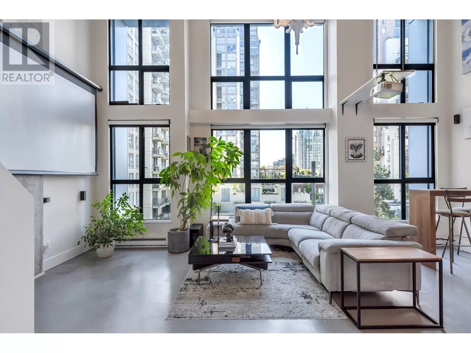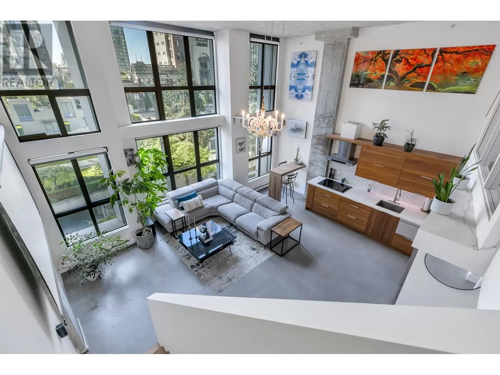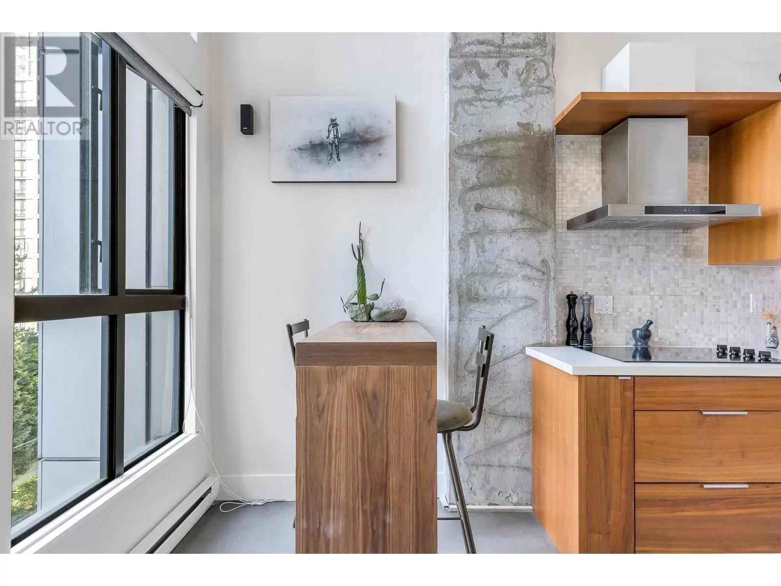 One of One opportunity at The Space Lofts. This floorplan is UNIQUE TO THE BUILDING! Fully renovated with warmth and character, this floorplan offers a 2-bedroom layout and a large kitchen. Dramatic double-height ceilings, polished concrete floors, and exposed concrete feature walls retain the loft's drama while the kitchen warms the space with walnut cabinetry, stone counters, mosaic backsplash, and full-sized appliances. Plenty of natural light from the triple window bank and South exposure. In-suite combined washer/dryer. 1 parking, 2 pets ok. (id:27476)