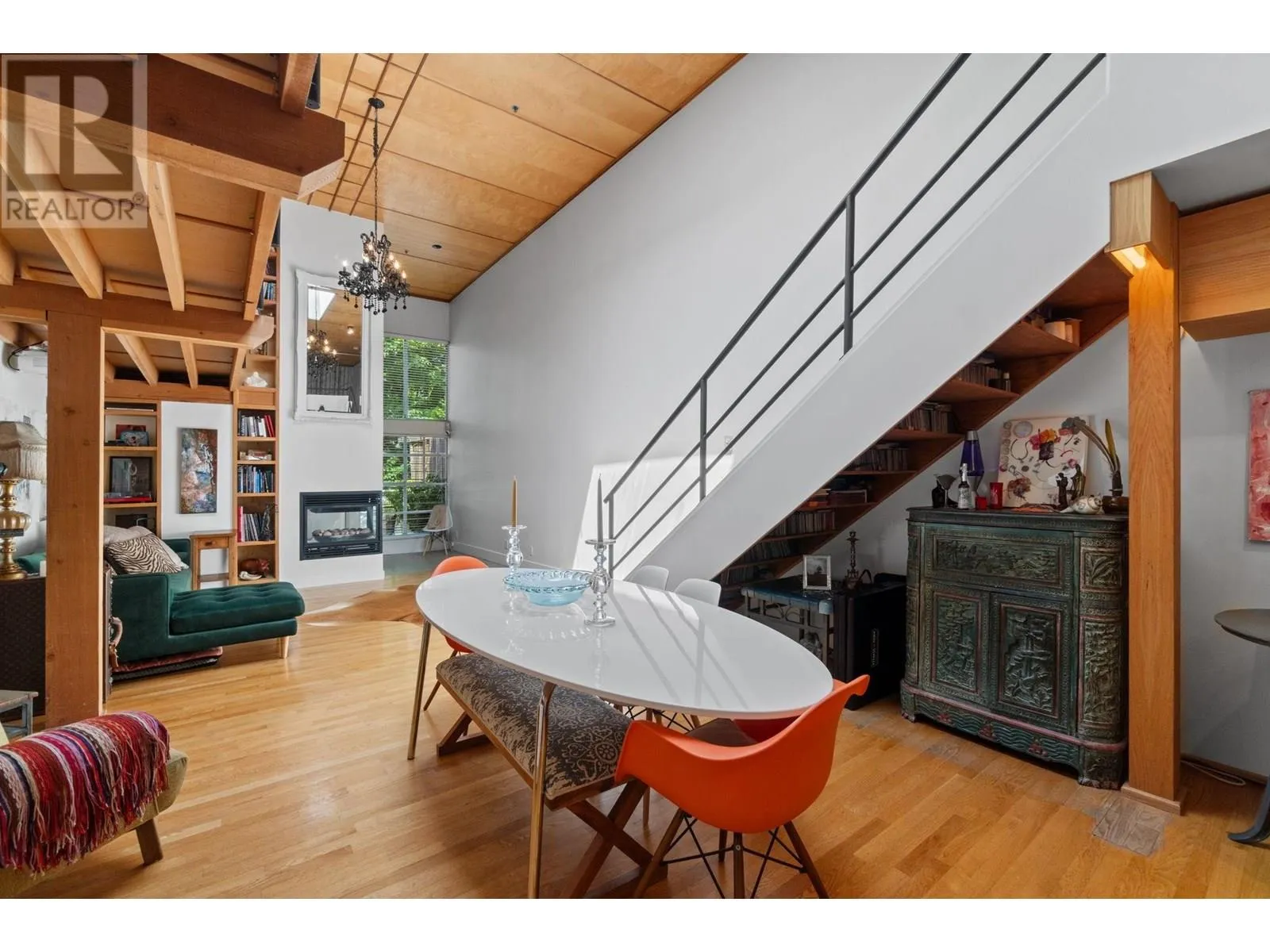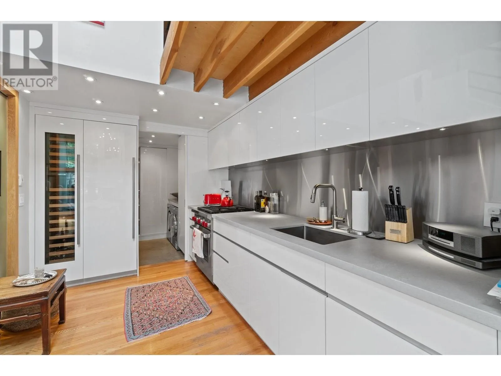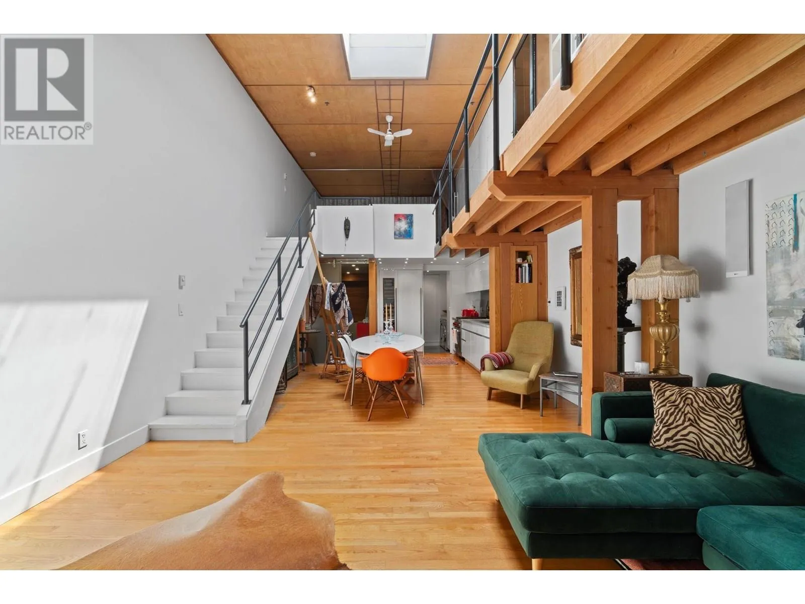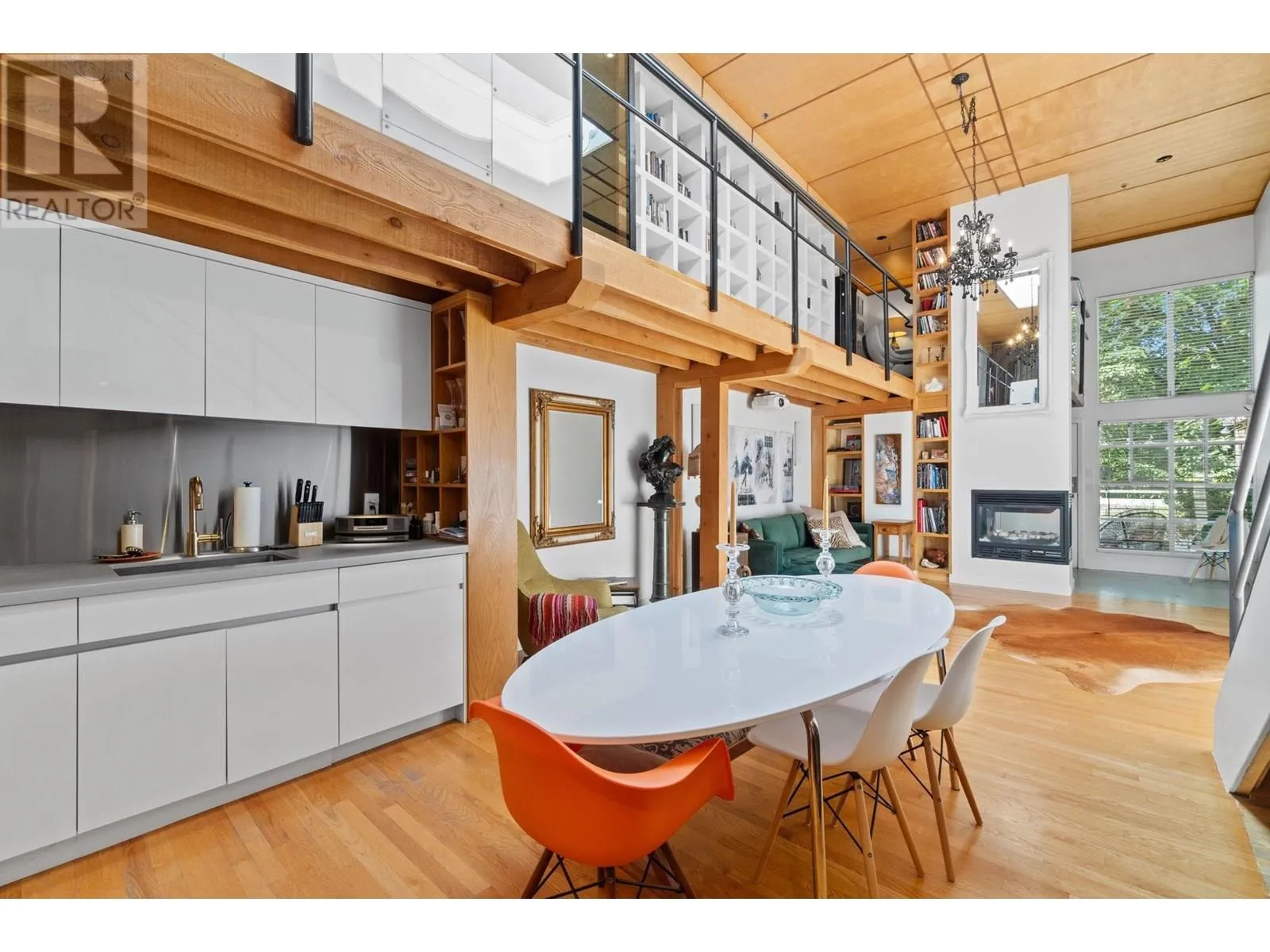 Welcome to China Creek Lofts - a beautifully re-imagined 2-level loft-style Live/Work townhome offering over 1200 sqft of modern comfort in the vibrant heart of Mount Pleasant, perfectly located between Main St & Commercial Dr. This architectural gem boasts soaring 16-ft ceilings, solid maple hardwood floors, custom steel railings & an abundance of natural light throughout. Thoughtfully renovated, the home features a chef-inspired kitchen with Sub-Zero fridge, wine fridge, Wolf range, custom cabinetry & designer lighting. The spa-like bathroom, dedicated laundry/storage room & versatile flex space (ideal as a den or home office) make everyday living feel effortless. Custom built-ins throughout. Parking, storage & huge private patio! A truly rare find-Book you showing today! (id:27476)