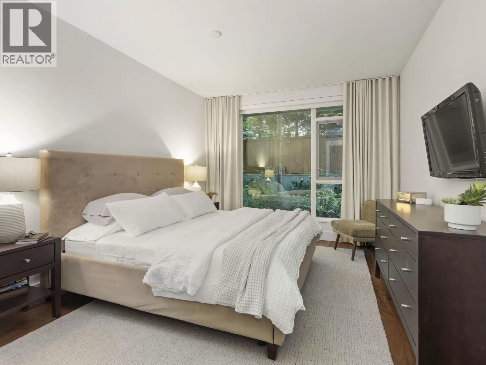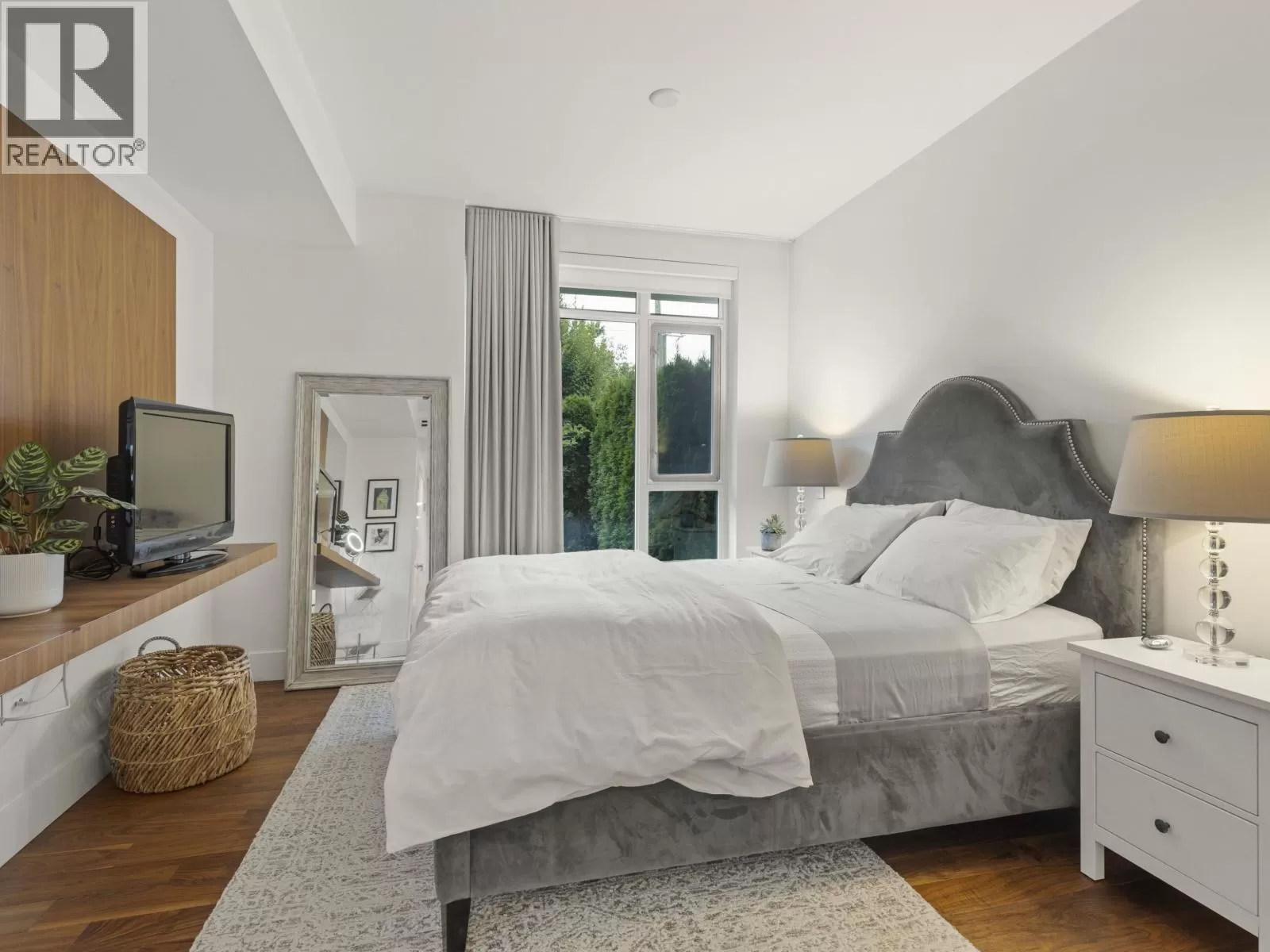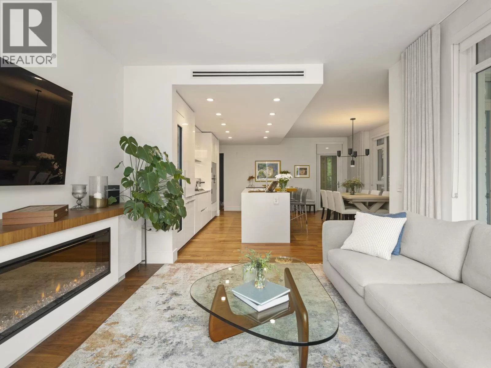 Modern elegance meets tranquil sophistication in this rare garden-level residence at Belpark by Intracorp.This 3 bed+flex luxury SE corner home blends refined European design with warm natural elements, featuring a sleek chef's kitchen, high-end appliances, steam-oven, wine fridge, Italian cabinetry, marble slab backsplash & quartz stone counter. Floor-to-ceiling windows bathe the open concept space in natural light, complemented by custom millwork, full-length fireplace & wide-plank matte walnut hardwood floors. Enjoy the seamless outdoor living with your private oasis surrounded by lush greenery. Belpark offers peaceful reflecting pool surrounded by landscaped courtyard, concierge, gym, lounge. Steps from parks, Churchill High, Langara College, YMCA & Golf Course. True Westside Master Piece! (id:27476)