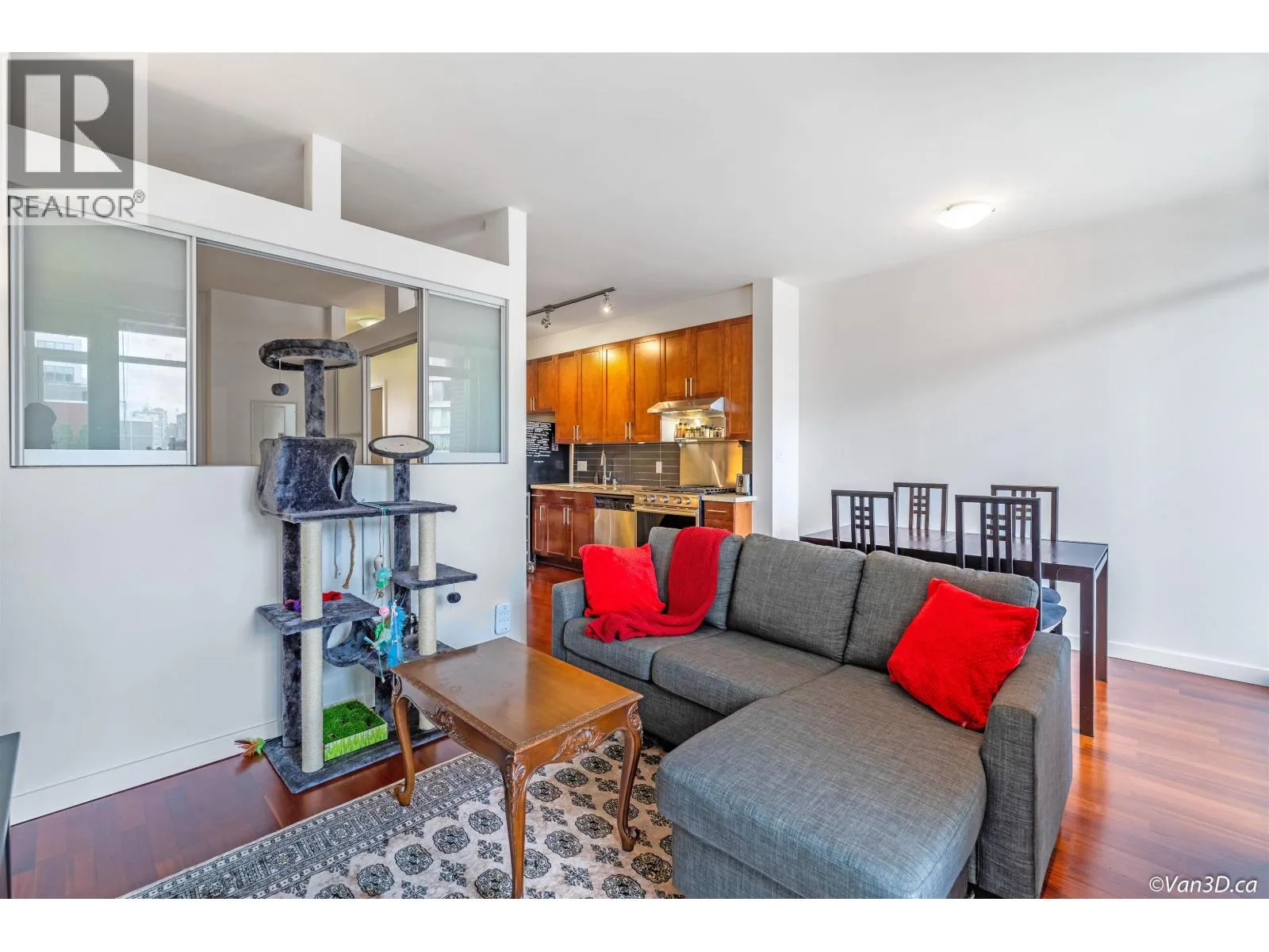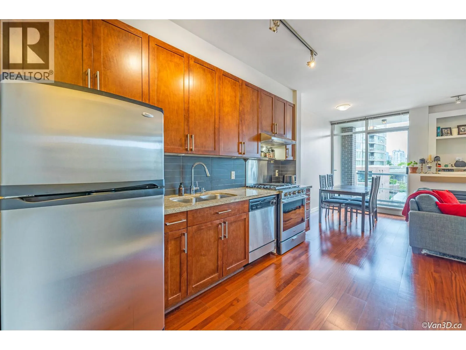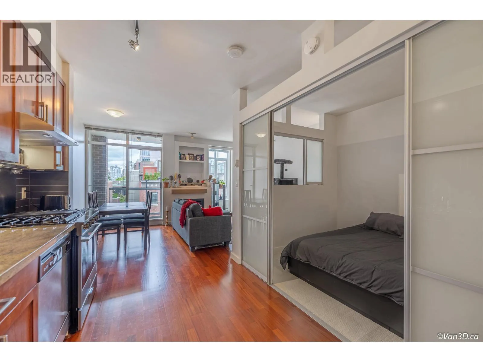 Welcome to the Montreux at False Creek! This well-designed home features a large bedroom, den (suitable as a second bedroom), office, and flex room-ideal for first-time buyers, small families, or investors. Highlights include 9' ceilings, hardwood floors, a cozy fireplace, and an open living/dining area. The kitchen is upgraded with stainless steel appliances and a 5-burner gas stove with hood fan. Located in the heart of Cambie Village, you're just minutes from Olympic Village Station, the Seawall, shops, cafés, Save-On, Whole Foods, Canadian tire, Home Depot and more. Amenities include a gym, meeting room, and a lush courtyard. Comes with one parking. One dog or cat allowed. Come and make this your home. (id:27476)
