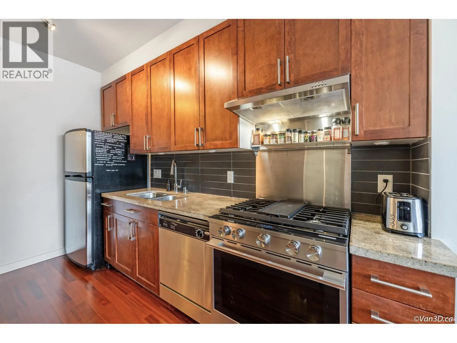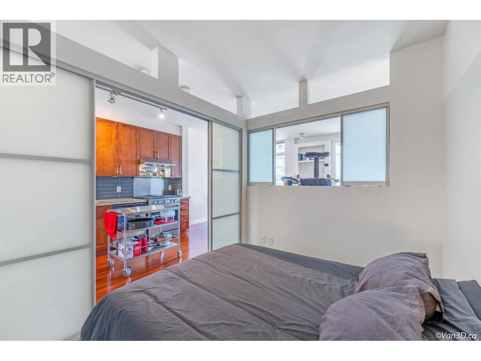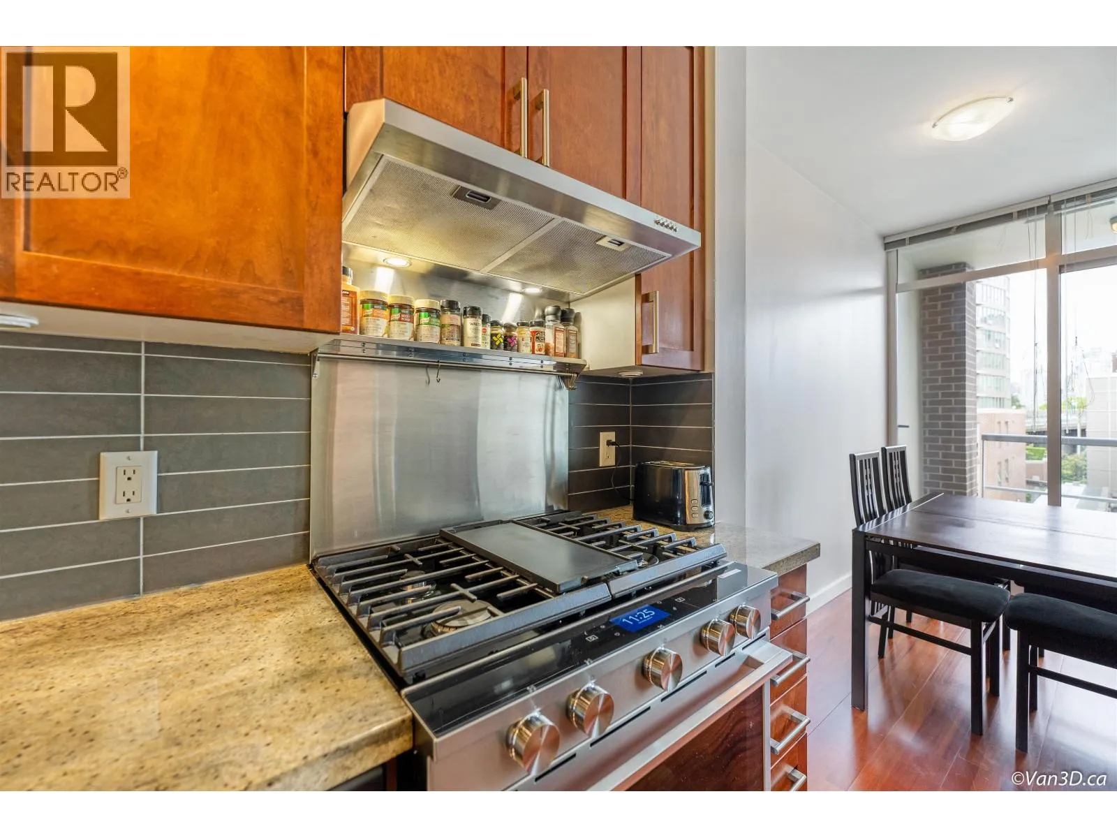 Welcome to the Montreux at False Creek! This well-designed home features a large bedroom, den (suitable as a second bedroom), office, and flex room-ideal for first-time buyers, small families, or investors. Highlights include 9' ceilings, hardwood floors, a cozy fireplace, and an open living/dining area. The kitchen is upgraded with stainless steel appliances and a 5-burner gas stove with hood fan. Located in the heart of Cambie Village, you're just minutes from Olympic Village Station, the Seawall, shops, cafés, Save-On, Whole Foods, Canadian tire, Home Depot and more. Amenities include a gym, meeting room, and a lush courtyard. Comes with one parking. One dog or cat allowed. Come and make this your home. (id:27476)