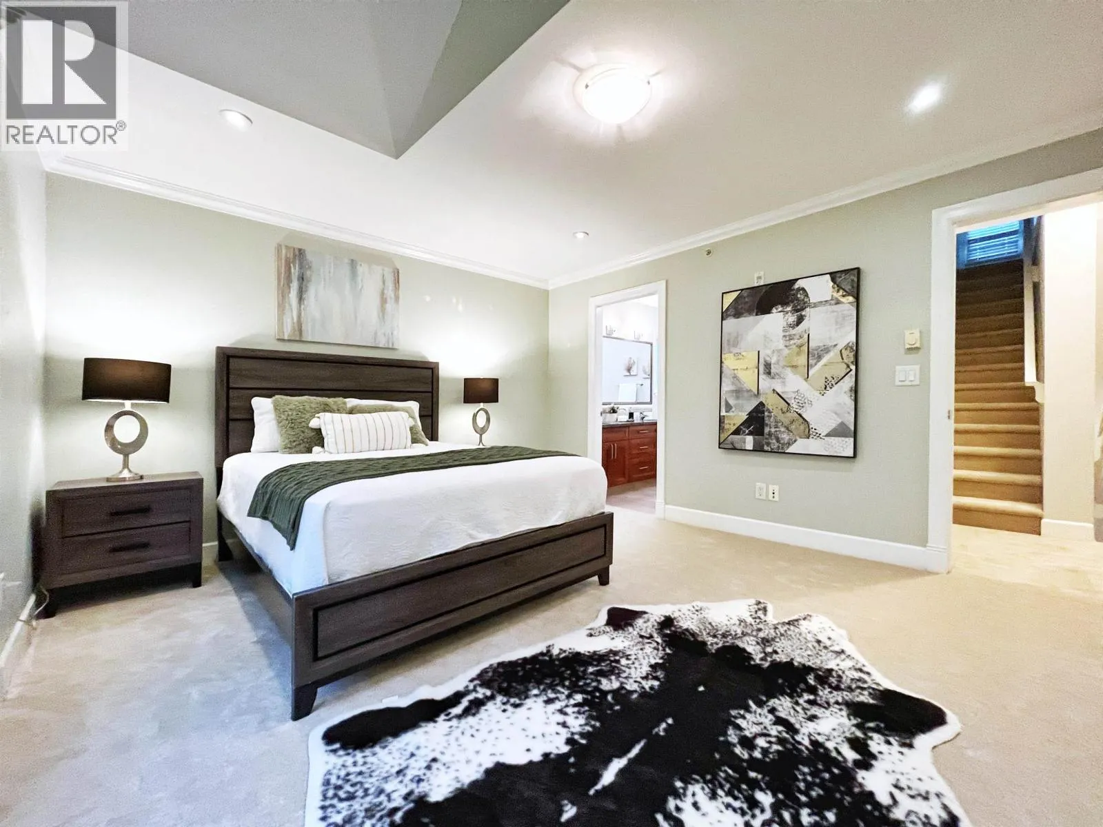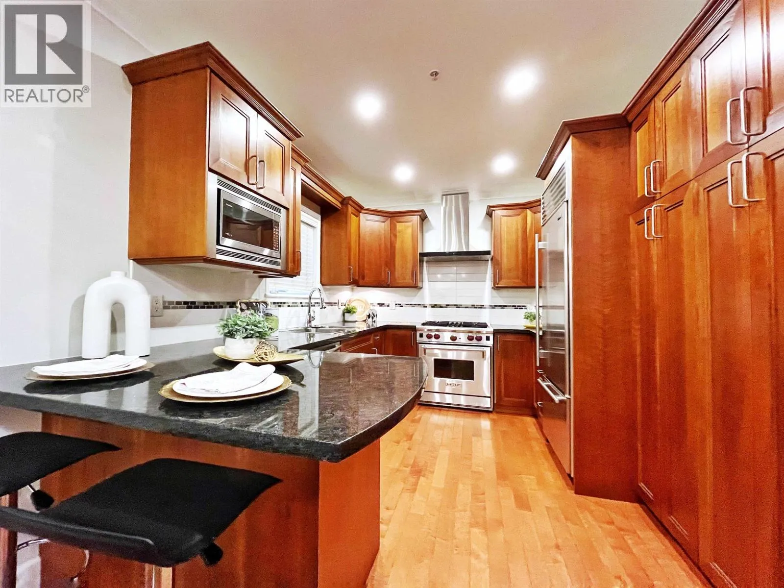 Charming West End townhome inspired by classic New York brownstone design, tucked away on a peaceful, tree-shaded street. This residence features both a private rooftop retreat and a welcoming front terrace. The main level offers a gourmet kitchen complete with granite counters, ample cabinetry, a Wolf gas cooktop and Subzero refrigerator. Rich hardwood floors, elegant crown mouldings, vaulted ceilings, and recessed lighting add warmth and character throughout. The upper floors include two generously sized bedrooms and two full baths. The primary suite accommodates a king bed with ease and includes a custom-designed closet system plus an ensuite showcasing dual vanities, a deep soaker tub, a separate glass shower, and a skylight that fills the space with natural light. 1 parking 1 locker (id:27476)
