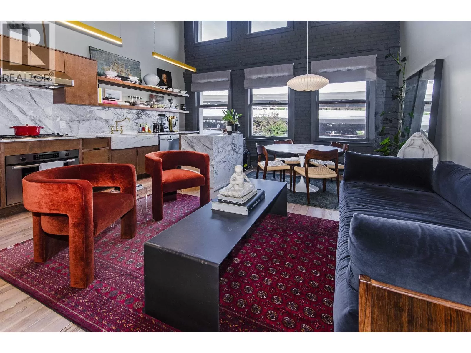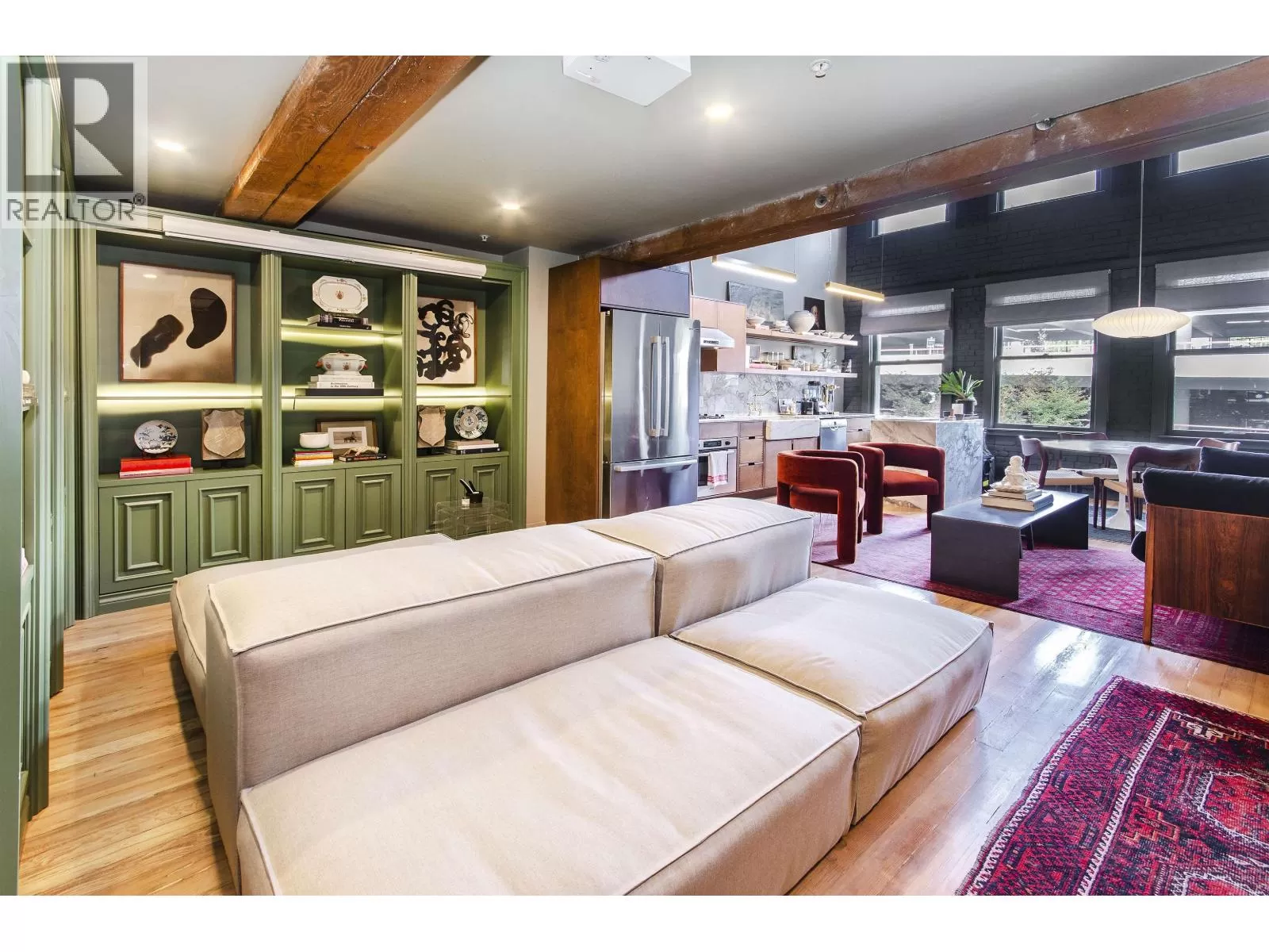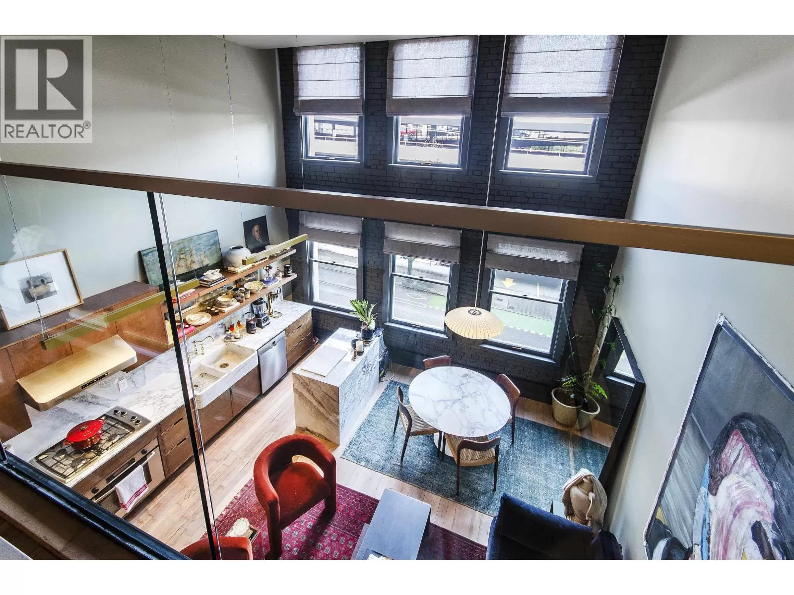 This two-storey loft at the iconic Bowman Lofts is a masterclass in style. Heritage charm meets modern refinement with exposed brick, whitewashed hardwood floors, and 20-foot ceilings accented by striking timber beams that add warmth and character. The kitchen has been completely updated with Italian Arabescato Corchia marble, walnut cabinetry, and Bosch appliances - balancing form and function with effortless elegance. Custom millwork bookshelves surround a reimagined area to unwind - EASILY CONVERTIBLE BACK TO A SECOND BEDROOM if desired. Upstairs, the generous suite with secondary entrance features custom cabinetry, luxurious curtains for added privacy, and a thoughtfully redone ensuite with double sinks. The two FULL bathrooms showcase Spanish Crema Marfil marble tiles and Toto fixtures, offering quiet luxury throughout. Additional benefits include secured parking within the building, a storage locker, and access to a rooftop fireside lounge. A one-of-a-kind opportunity not to be missed. (id:27476)