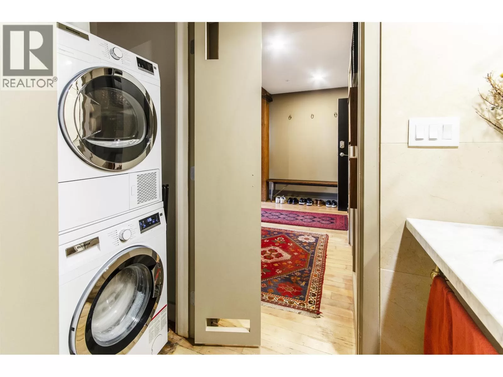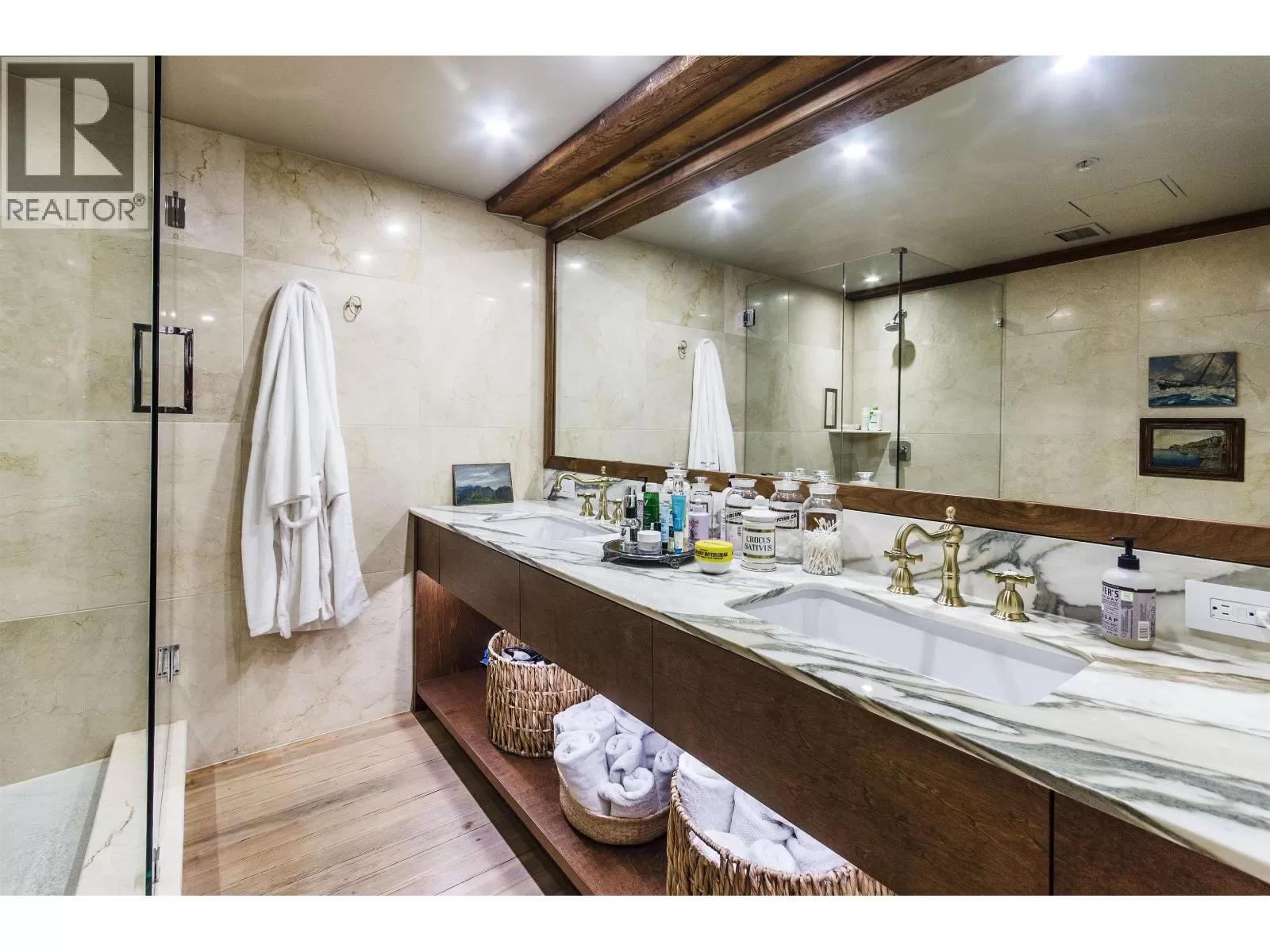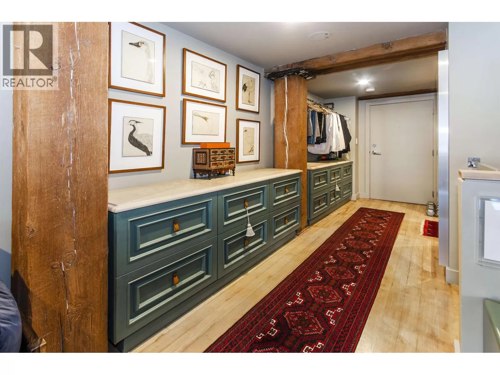 This two-storey loft at the iconic Bowman Lofts is a masterclass in style. Heritage charm meets modern refinement with exposed brick, whitewashed hardwood floors, and 20-foot ceilings accented by striking timber beams that add warmth and character. The kitchen has been completely updated with Italian Arabescato Corchia marble, walnut cabinetry, and Bosch appliances - balancing form and function with effortless elegance. Custom millwork bookshelves surround a reimagined area to unwind - EASILY CONVERTIBLE BACK TO A SECOND BEDROOM if desired. Upstairs, the generous suite with secondary entrance features custom cabinetry, luxurious curtains for added privacy, and a thoughtfully redone ensuite with double sinks. The two FULL bathrooms showcase Spanish Crema Marfil marble tiles and Toto fixtures, offering quiet luxury throughout. Additional benefits include secured parking within the building, a storage locker, and access to a rooftop fireside lounge. A one-of-a-kind opportunity not to be missed. (id:27476)