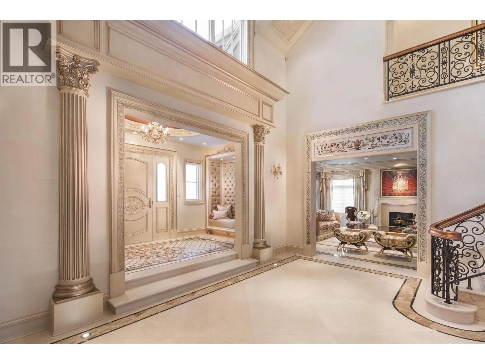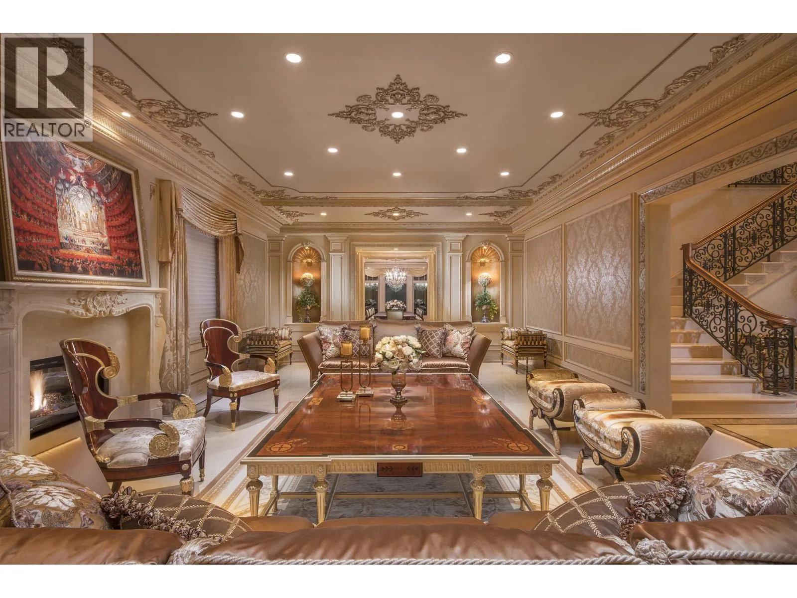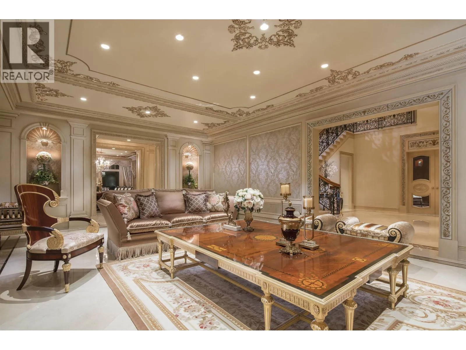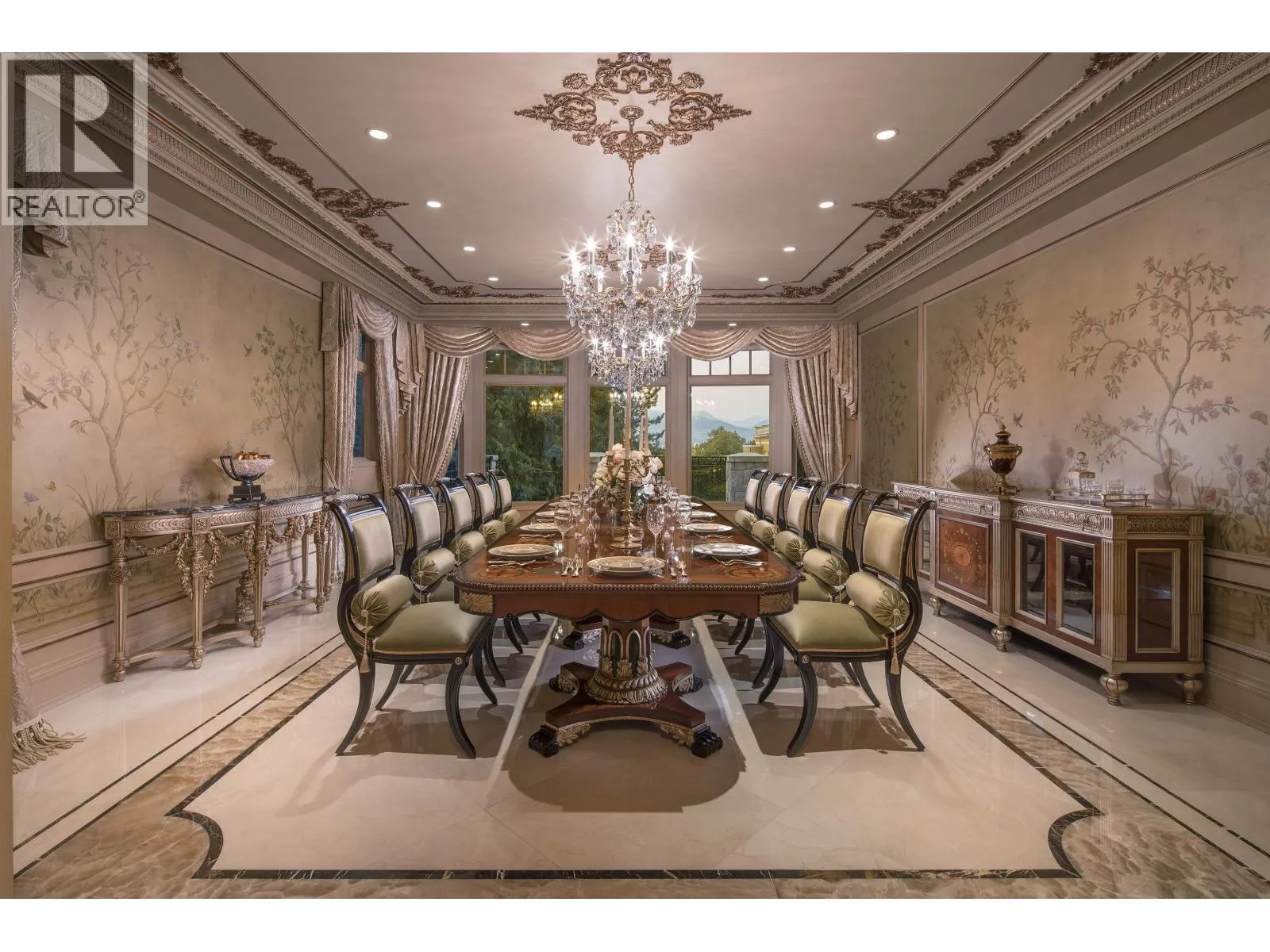 Le Château Versaille d'Angus. Epitome WOW-factor 11670sf 7yr PALACE on 100x264=26400sf VIEW lot on best street in 1st Shaughnessy. Awe-inspiring 2x-height foyer with majestic marble stairs. Award winning opulent grand classic masterpiece intricately carved by Bela Constr & Carol Fann Int'rs. Extensive use of elegant marble floors with inlay accents, dramatic Birds-Eye walnut burl, beautiful mural paintings, back-painted glass panels, gold-leaf wainscotting accents, impeccable workmanship by only the best master finishers. Well-appointed chef kitchen opens to 1500sf concrete terrace & covered porch perfectly positioned to enjoy fireworks & scenic mt. views. 4 bdrms up, master suite boasts mtn views & Roman-Spa. 400sf movie theatre plus indoor 50' lap pool. Elevator. World class trophy prpty. (id:27476)