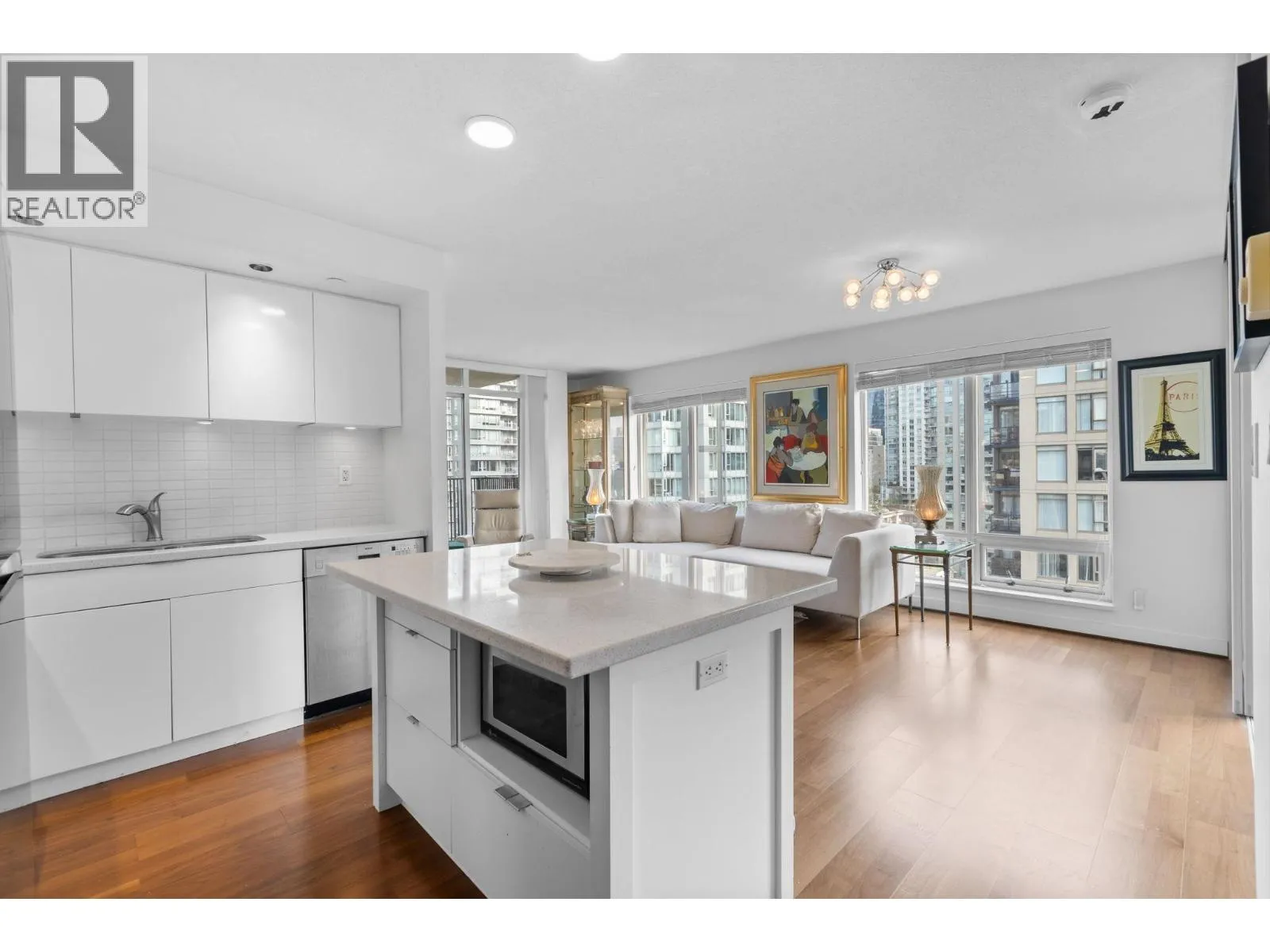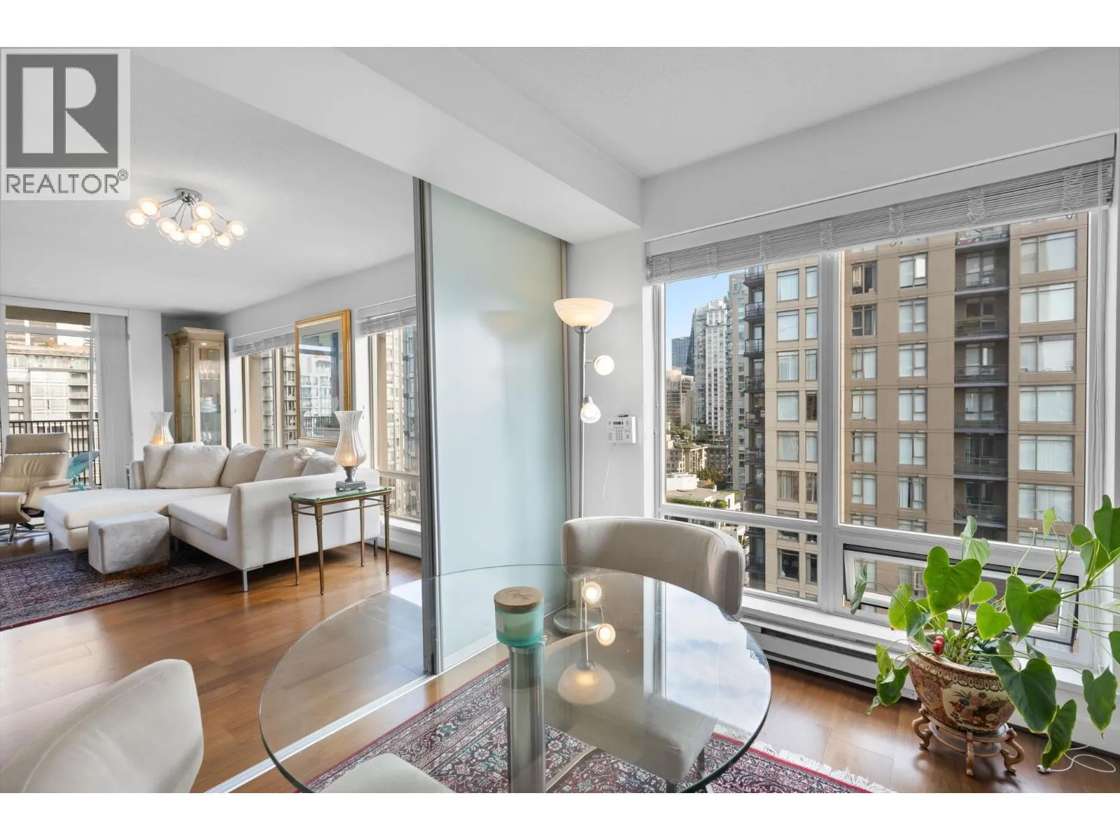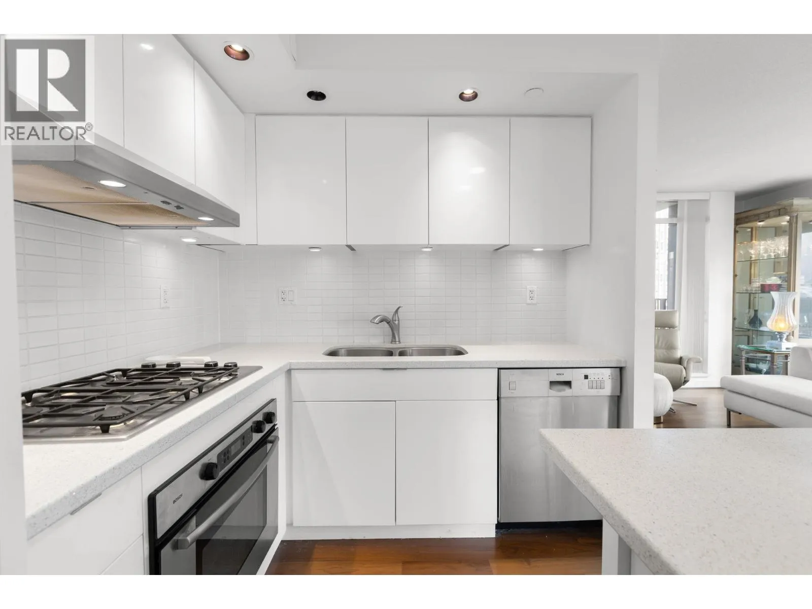 Experience modern elegance at DOMUS on the edge of Yaletown. This bright and airy corner 2-bed, 2-bath corner home showcases elevated and nearly 180 degree views from NE to NW, capturing both the city skyline and North Shore mountains. With its north-facing exposure, it stays cool year-round while still receiving plenty of natural light. Inside, you´ll find hardwood floors, renovated white quartz counters, and an expanded kitchen island. The thoughtful layout includes a stylish Jack and Jill shower and a versatile flex room, currently used as a second walk-in closet but could also serve as storage or an office. Complete with a separate storage locker and one parking stall, this is one of the most efficient and desirable starter two-bed homes in the building. A true Yaletown gem! (id:27476)