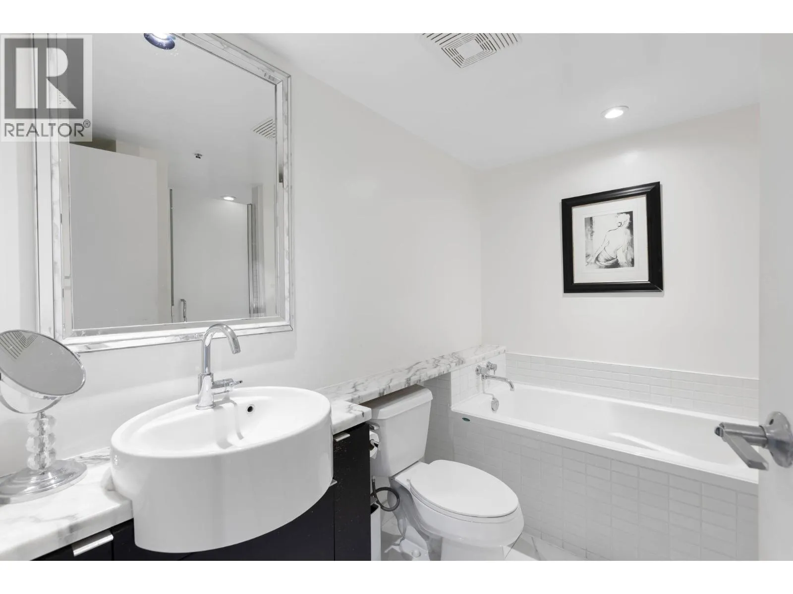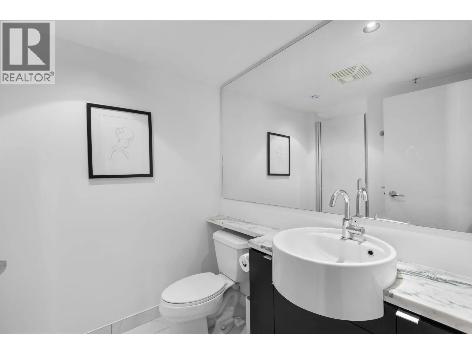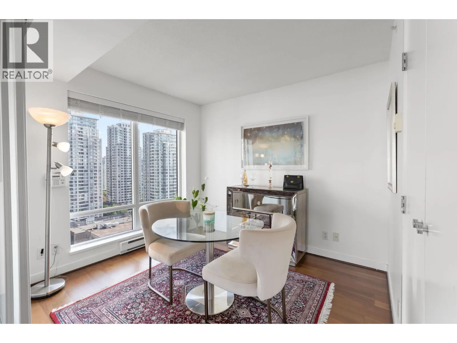 Experience modern elegance at DOMUS on the edge of Yaletown. This bright and airy corner 2-bed, 2-bath corner home showcases elevated and nearly 180 degree views from NE to NW, capturing both the city skyline and North Shore mountains. With its north-facing exposure, it stays cool year-round while still receiving plenty of natural light. Inside, you´ll find hardwood floors, renovated white quartz counters, and an expanded kitchen island. The thoughtful layout includes a stylish Jack and Jill shower and a versatile flex room, currently used as a second walk-in closet but could also serve as storage or an office. Complete with a separate storage locker and one parking stall, this is one of the most efficient and desirable starter two-bed homes in the building. A true Yaletown gem! (id:27476)
