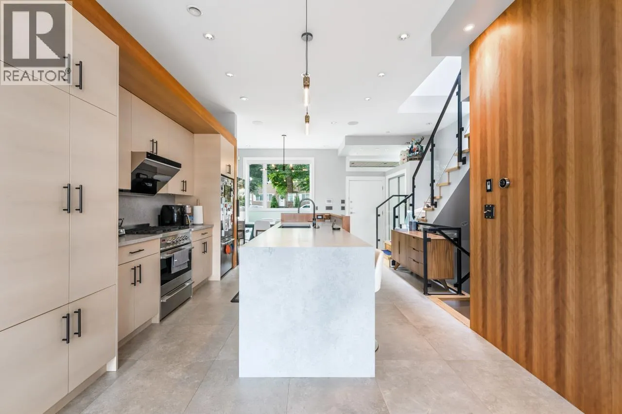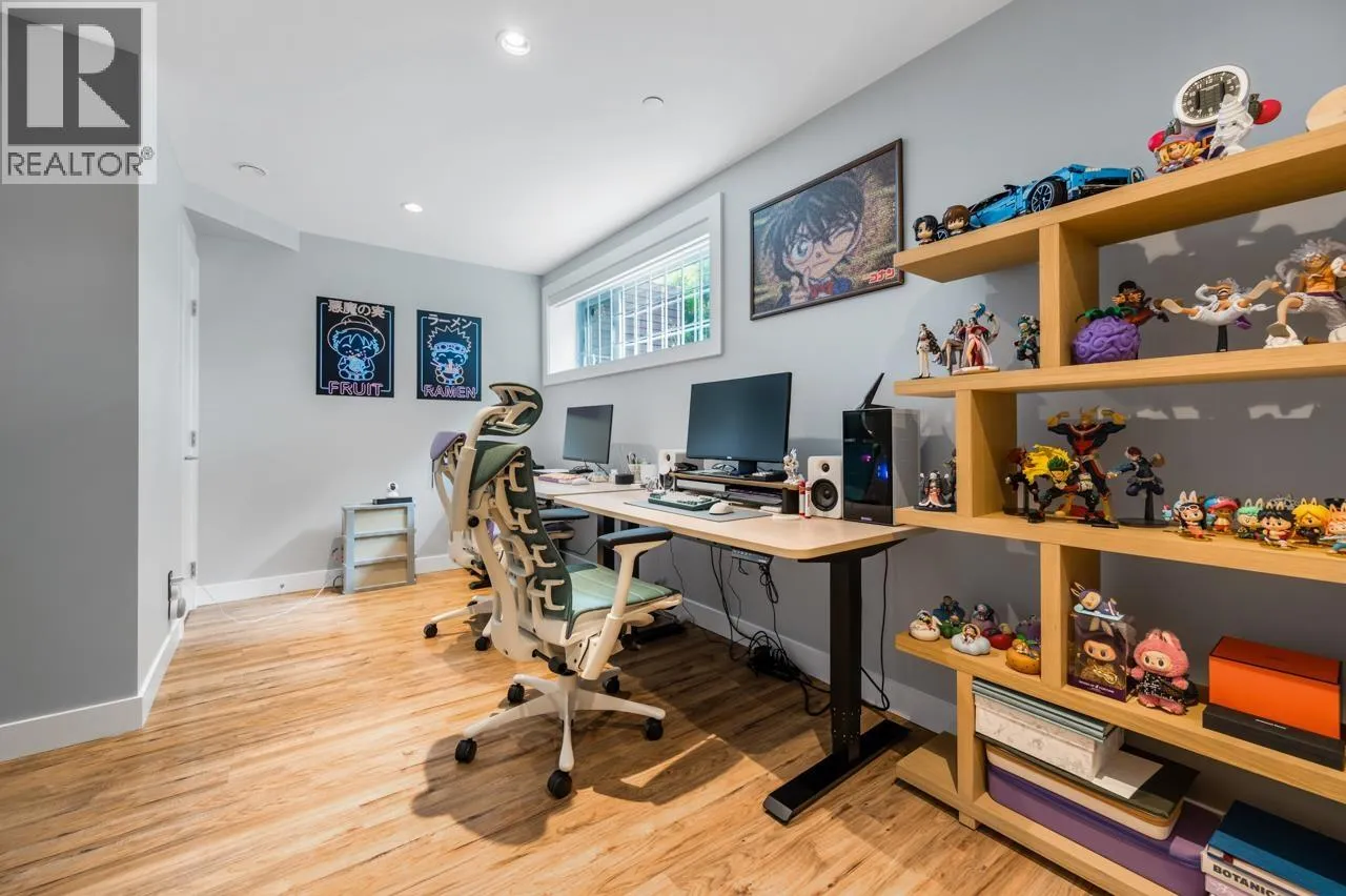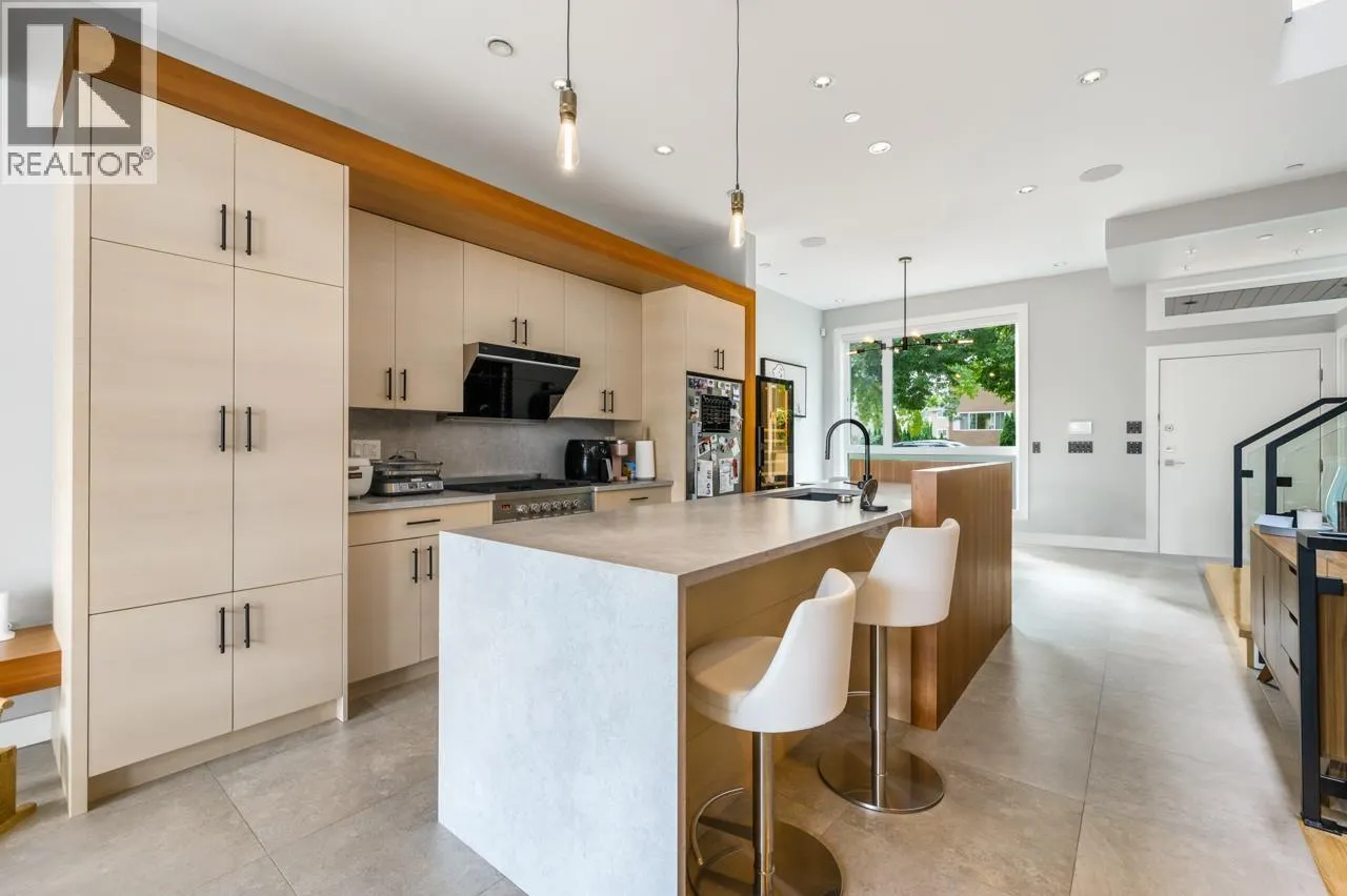 This contemporary home blends modern design with exceptional functionality in a prime location. Featuring a 10-ft ceiling on main floor, radiant heating, air conditioning, water filtration system and warm wood wall paneling, it offers comfort and luxury. Abundant natural light from a large skylight along with seamless indoor-outdoor flow, creates a modern, inviting atmosphere. The gourmet kitchen includes high-end appliances, custom cabinetry and a large island. A private backyard with a deck is ideal for entertaining. The lower floor features a spacious office and a well-appointed legal suite, providing a mortgage helper and added flexibility. The home is close to shopping, parks, and top schools, combining design, functionality, convenience and luxury in one unparalleled residence. (id:27476)