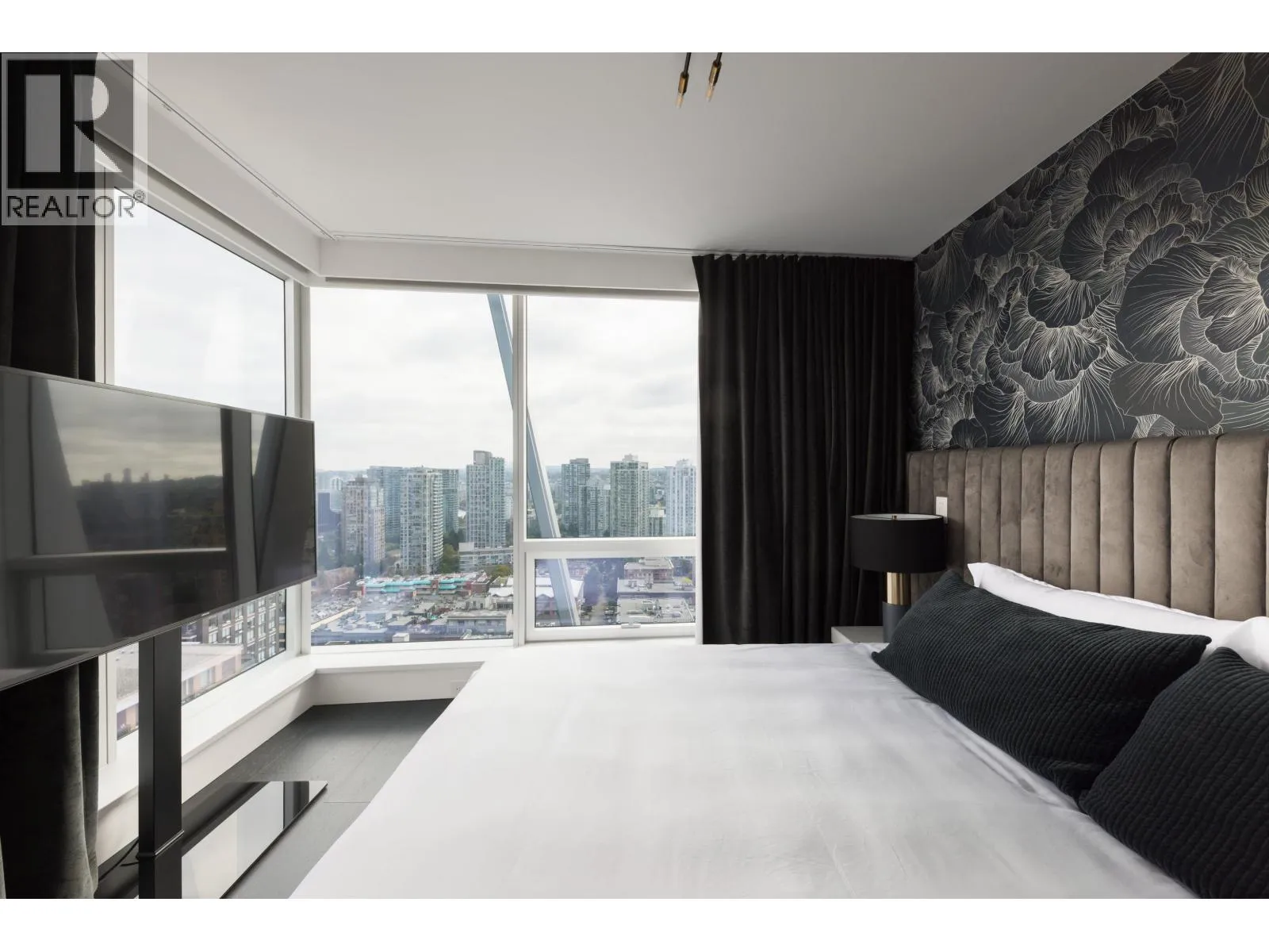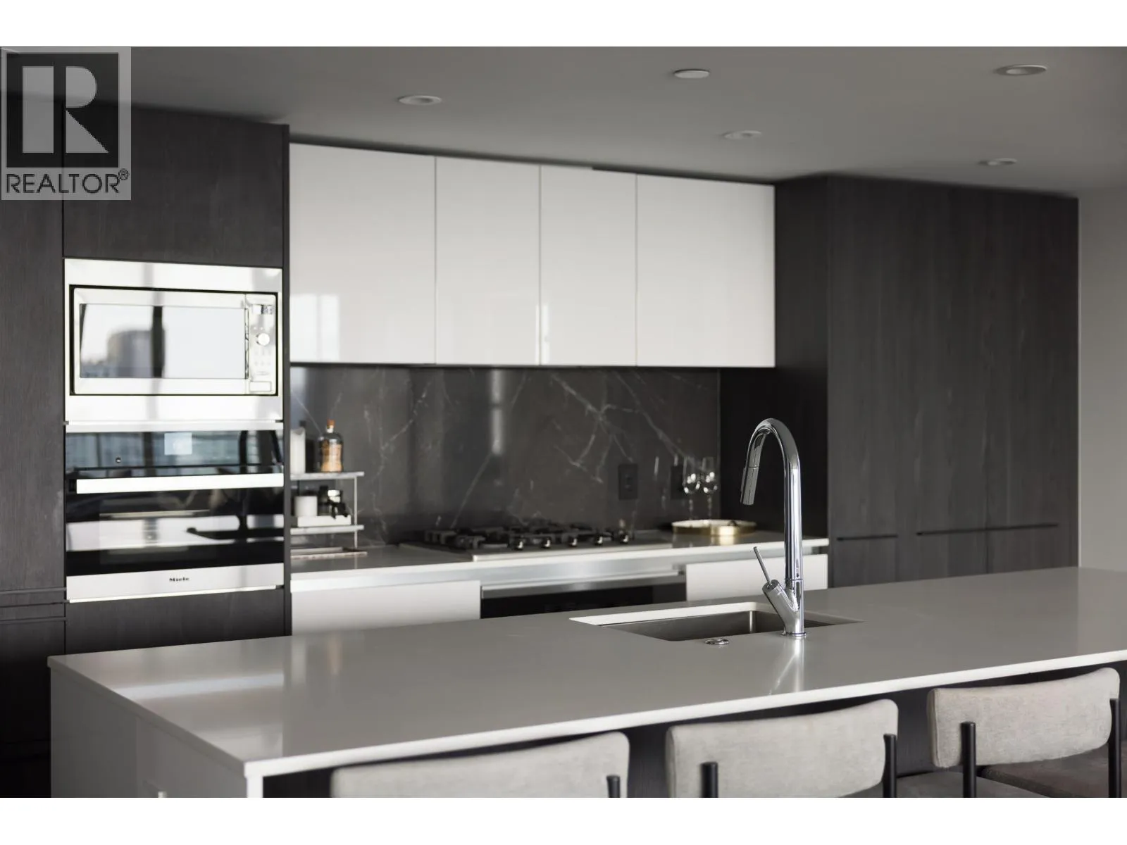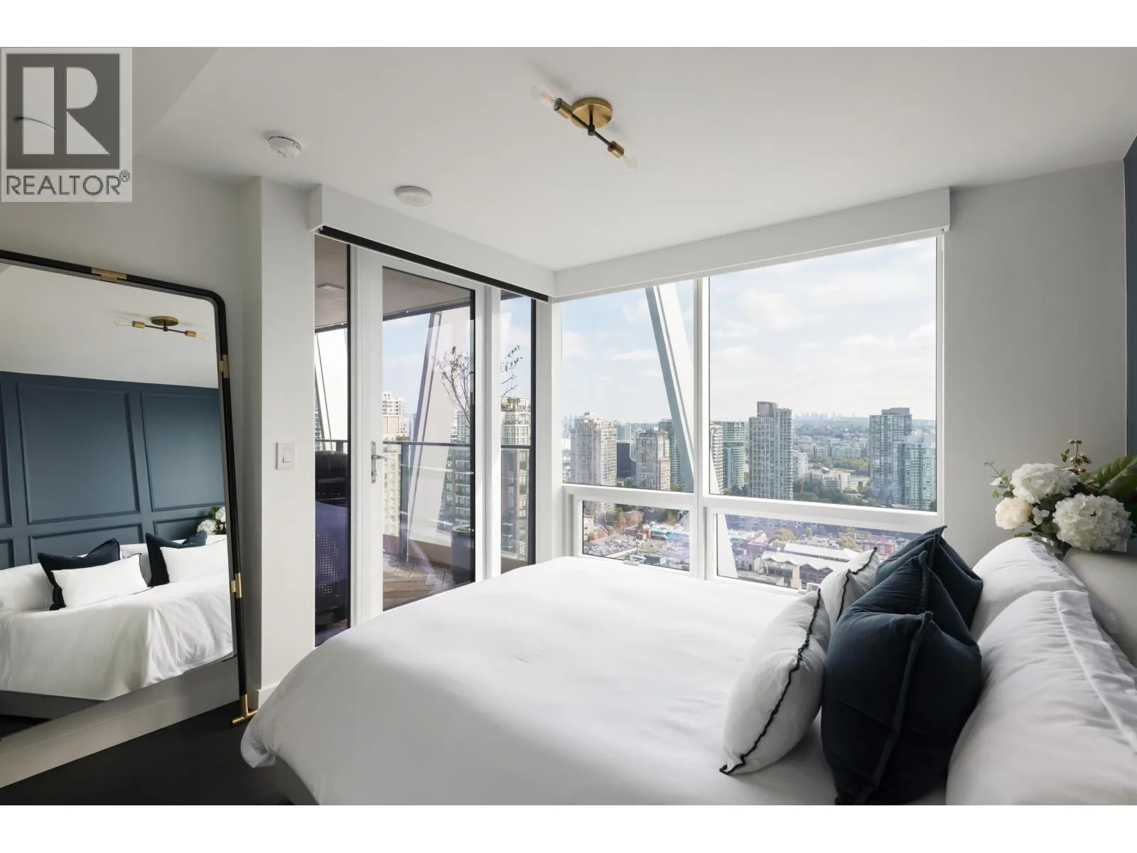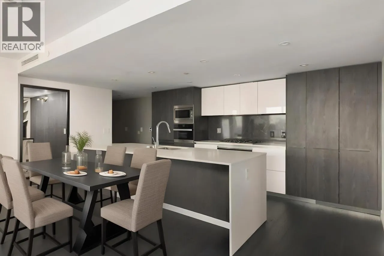 Elevated & updated corner home at 8X on the Park with panoramic views of False Creek, city, and mountains. This refined 3 bed, 2 bath residence features a 10ft natural stone island, integrated Miele appliances, custom millwork, powered blinds, and floor-to-ceiling windows. The open plan flows to an oversized covered patio with herringbone wood decking. Elegant bedrooms, a reimagined walk-in closet, engineered hardwood, natural tile, & A/C throughout complete the home. Includes 2 side-by-side parking, storage, and bike locker. Enjoy world-class amenities: concierge, fitness centre, and rooftop oasis. A rare, turnkey offering in one of Vancouver's premier buildings. (id:27476)