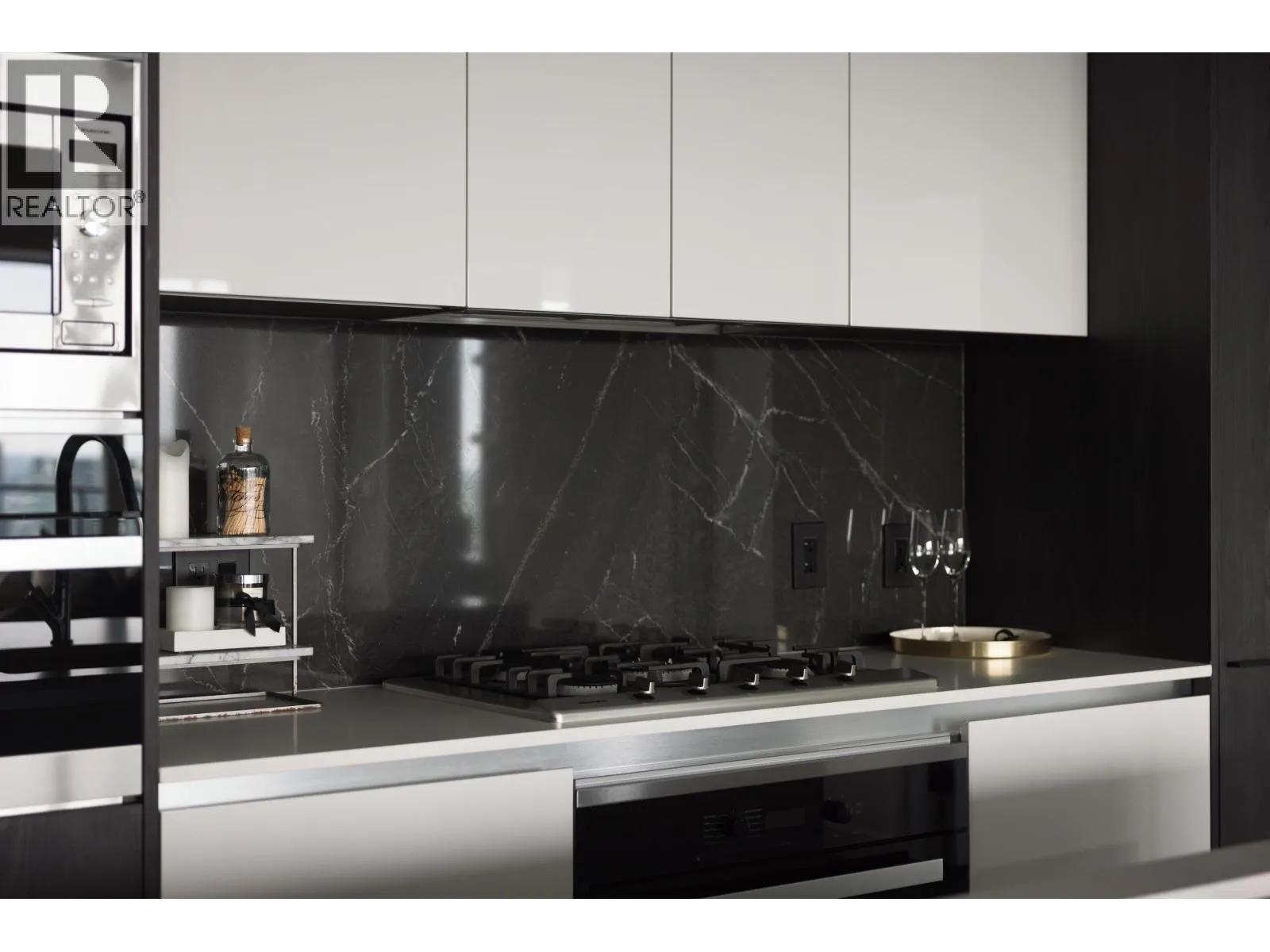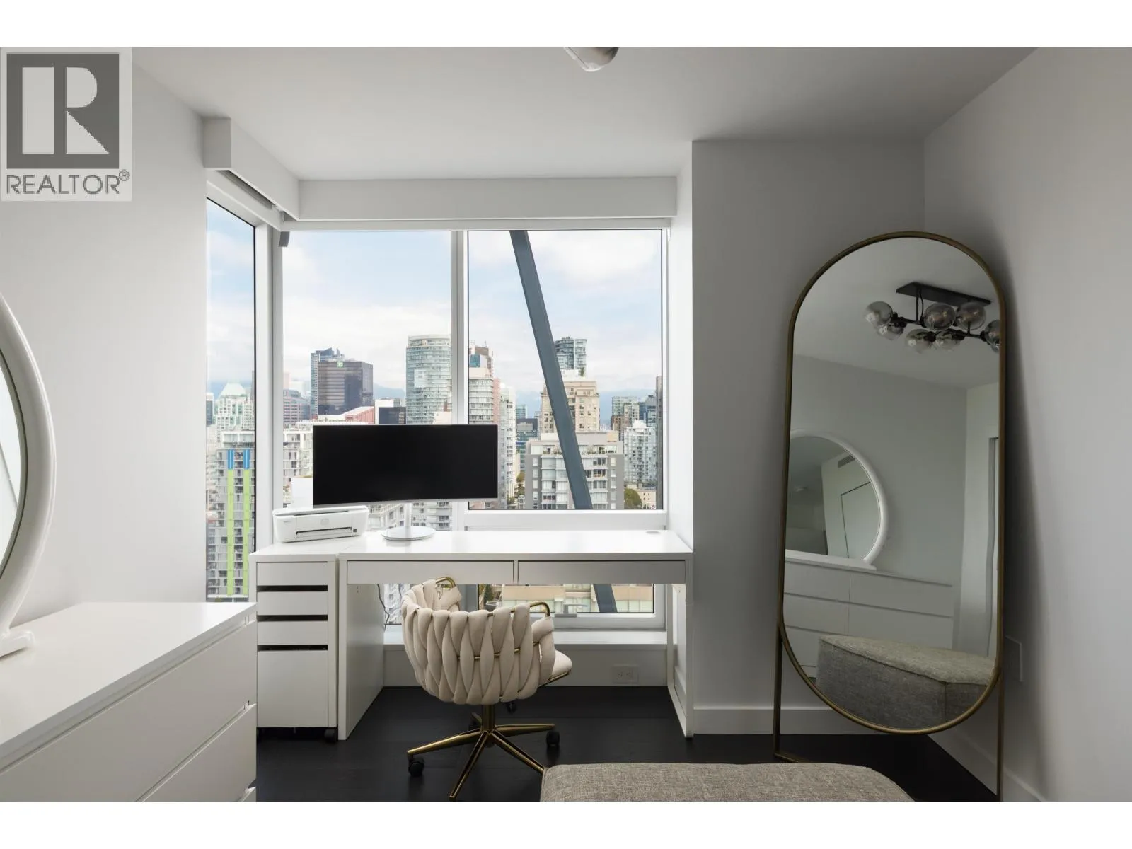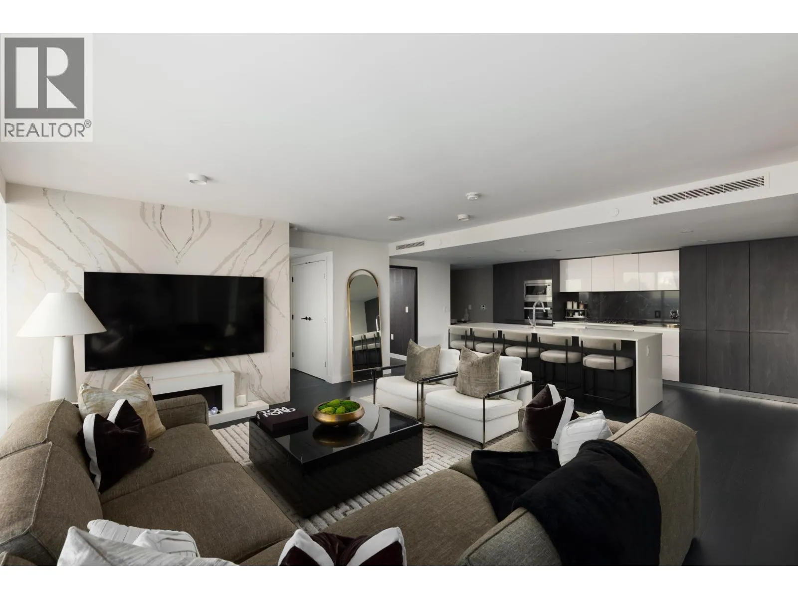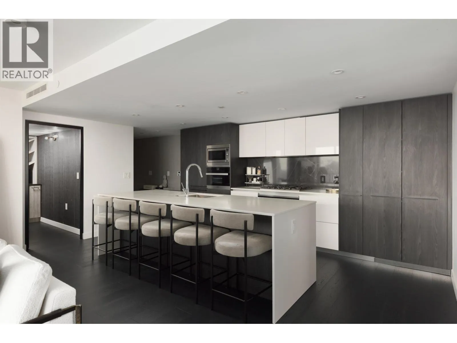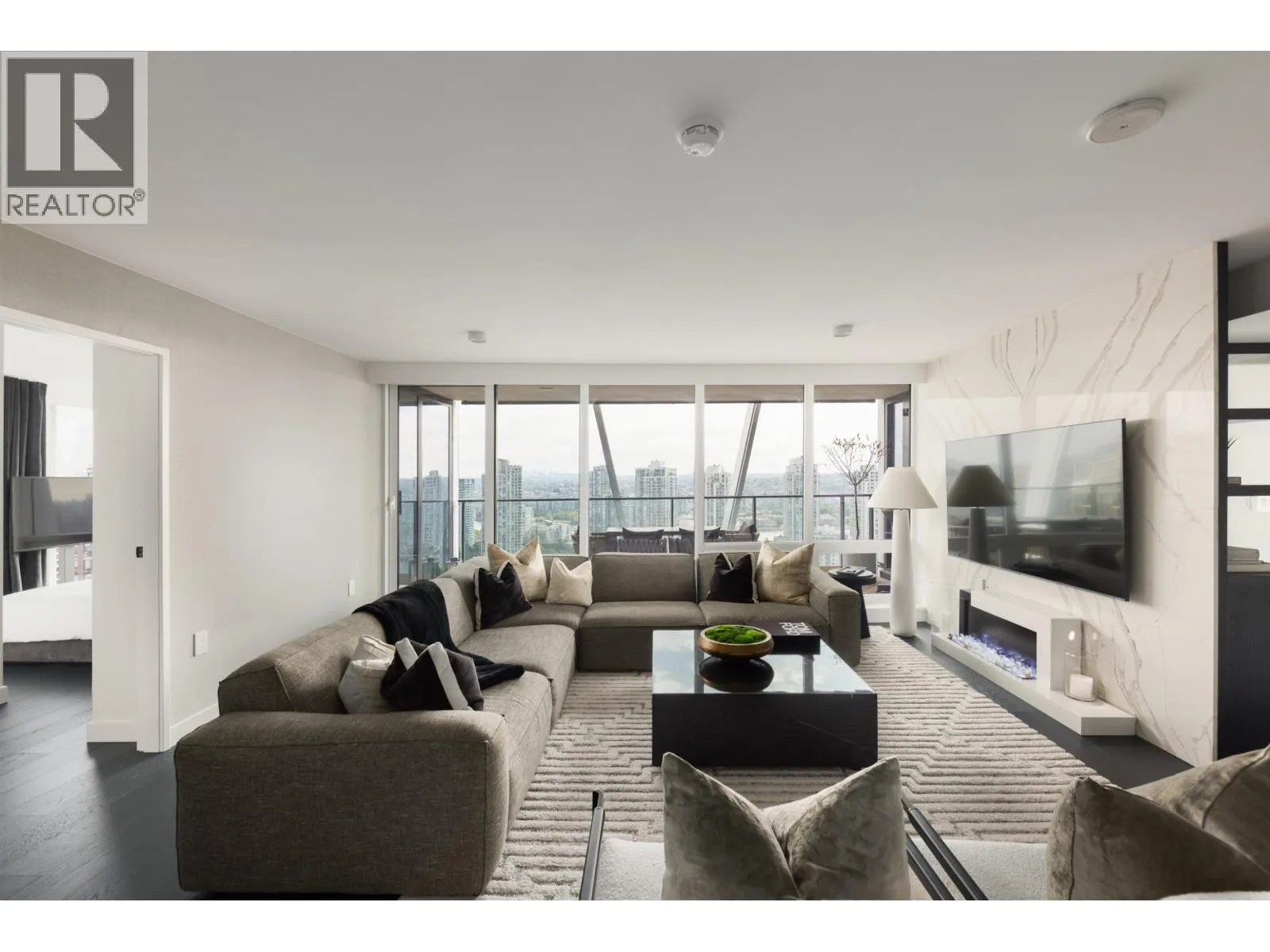 Elevated & updated corner home at 8X on the Park with panoramic views of False Creek, city, and mountains. This refined 3 bed, 2 bath residence features a 10ft natural stone island, integrated Miele appliances, custom millwork, powered blinds, and floor-to-ceiling windows. The open plan flows to an oversized covered patio with herringbone wood decking. Elegant bedrooms, a reimagined walk-in closet, engineered hardwood, natural tile, & A/C throughout complete the home. Includes 2 side-by-side parking, storage, and bike locker. Enjoy world-class amenities: concierge, fitness centre, and rooftop oasis. A rare, turnkey offering in one of Vancouver's premier buildings. (id:27476)