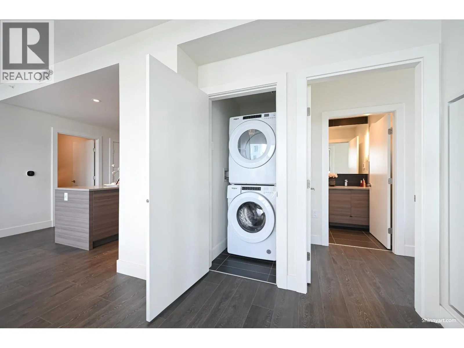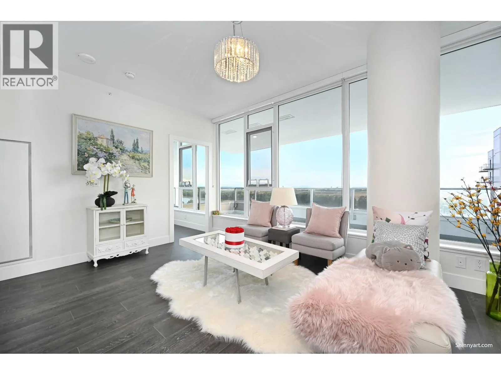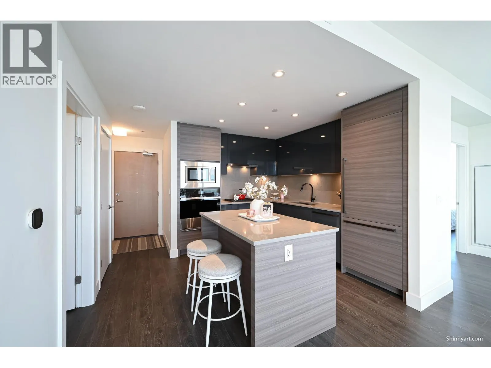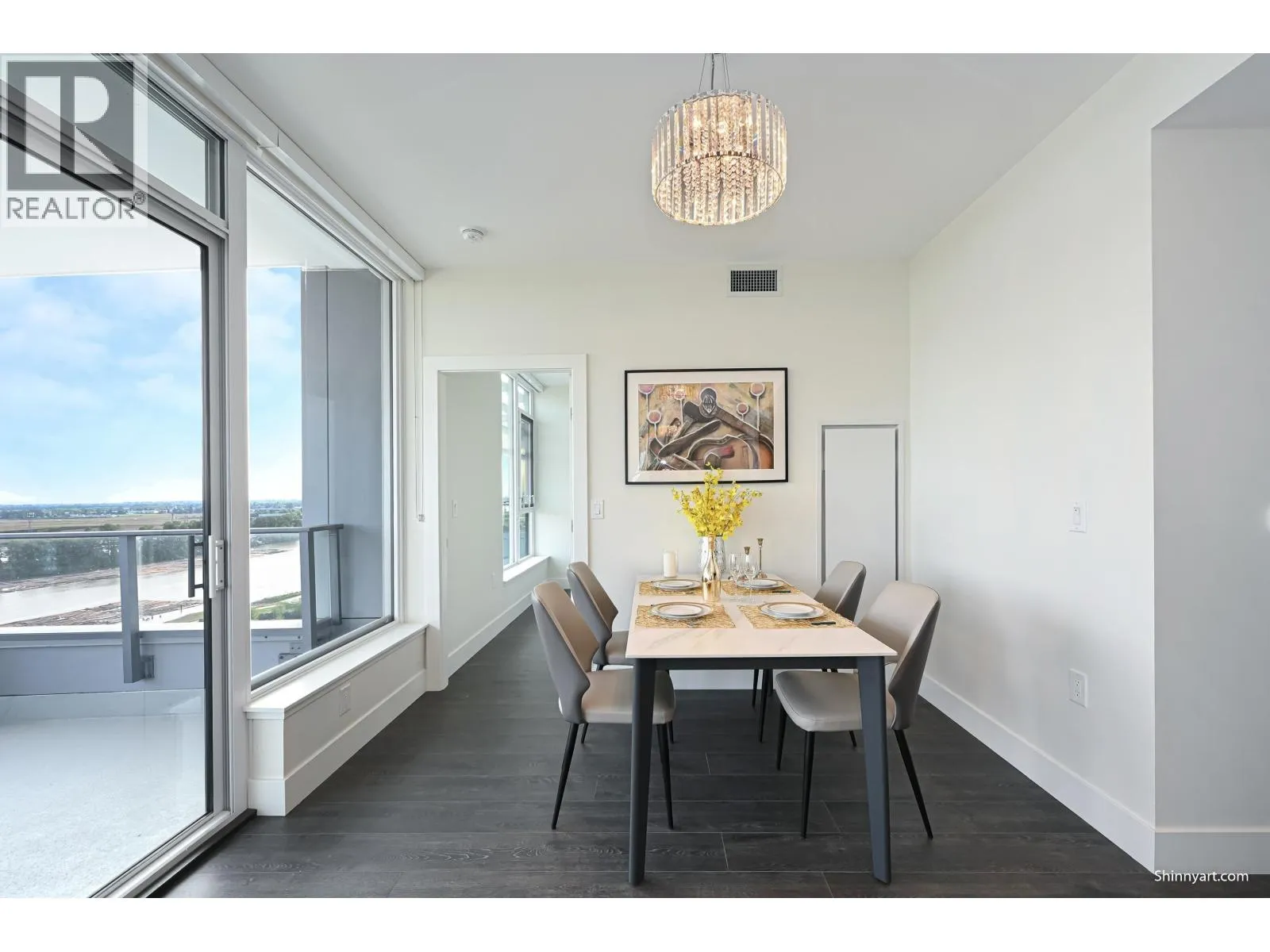 MODE-Vancouver's last waterfront and tallest concrete highrise building in serene River District. This extra-large unit features SE corner 3 bed + 1 den, 2 bath with 1,100 sq.ft of living space, a 332 sq.ft south-facing balcony overlooking the Fraser River and Mt Baker. The functional layout with open-concept kitchen, dining and living areas allows natural light to flow through every corner, 3 bedroom separation for good privacy.Features 10-foot ceilings, hardwood flooring throughout,kitchen with high-end appliances,high efficiency heating and cooling system. Convenient location, steps from Save-on Foods, Shoppers Drug Mart, Liquor store, banks, bus, with green space along with gym, hot tub,media room, and business center. 2 parkings and 1 with EV, 1 Storage, 1 Bicycle Storage (id:27476)