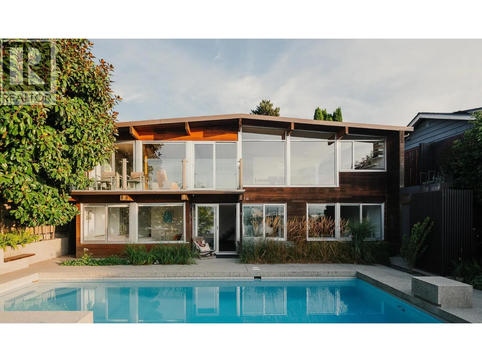 Perched above Vancouver´s harbour with panoramic views of downtown, Stanley Park, and the North Shore mountains, the H.H. Pitts Residence (1961) is a rare example of post-and-beam modernism in Hastings Sunrise. Designed by Robertson, Kolbeins, Teevan & Gallaher, the home features an open upper level with living, dining, and kitchen framed by a wall of glass, while two lower bedrooms open to a private pool deck. Lovingly restored and carefully maintained, it retains its architectural clarity with thoughtful updates, including a converted garage studio with skylights and concrete floors. A singular presence along Wall Street´s "Golden Mile," the residence reflects both the history and enduring livability of Vancouver modernism. (id:27476)