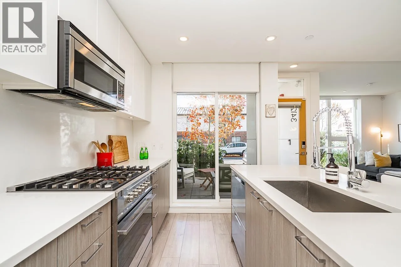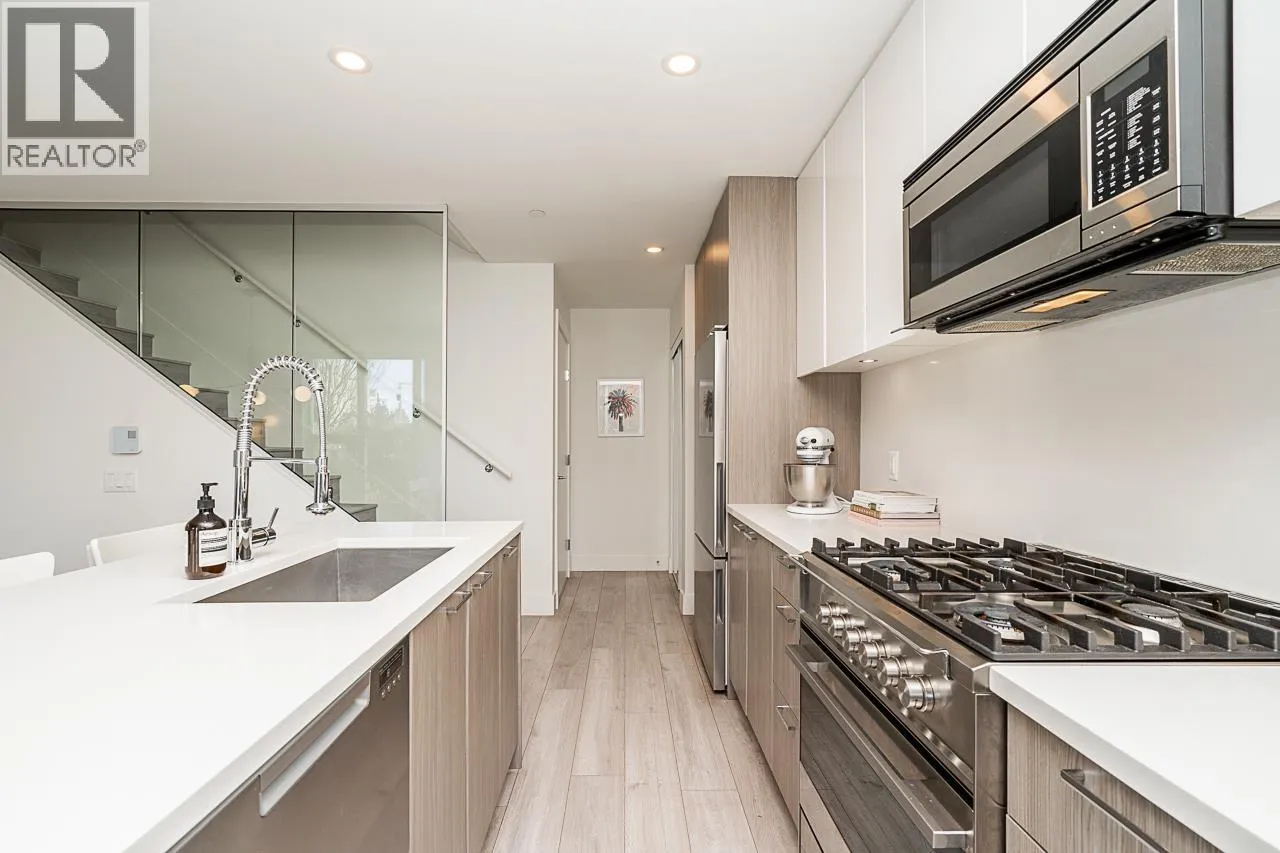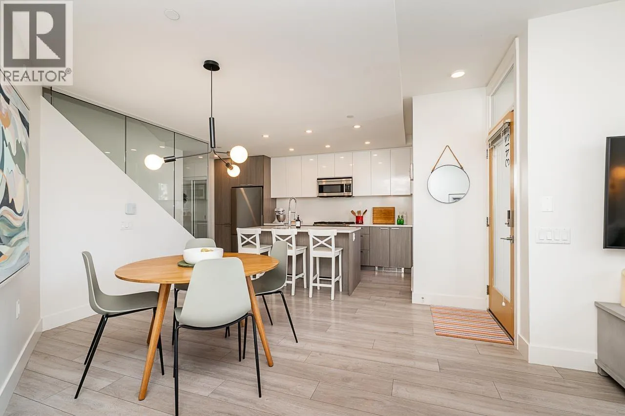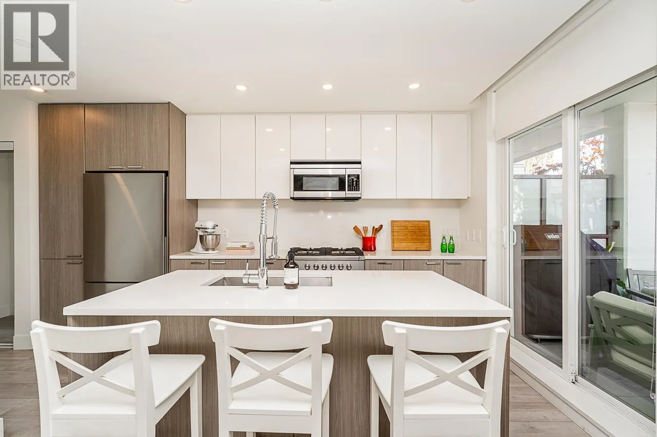 This gorgeous townhome offers a private walk-up entry, 2-beds + den, 3-baths, & 1,102 sqft of sophisticated interior space. Main level boasts a thoughtfully designed open-concept layout with wide-plank flooring throughout; powder rm; kitchen with luxury appliances, including gas range, excellent cabinet & counter space, island with breakfast bar, & sliding door access to the private covered front patio that offers year-round space for al-fresco entertaining. Floor-to-ceiling windows in the living rm offer W-exposure & welcome in abundant natural light. Upper level features primary bed with ensuite; secondary bed & bath; den/potential 3rd bed; &, conveniently located laundry. Includes U/G parking, storage locker, & balance of new home warranty. (id:27476)