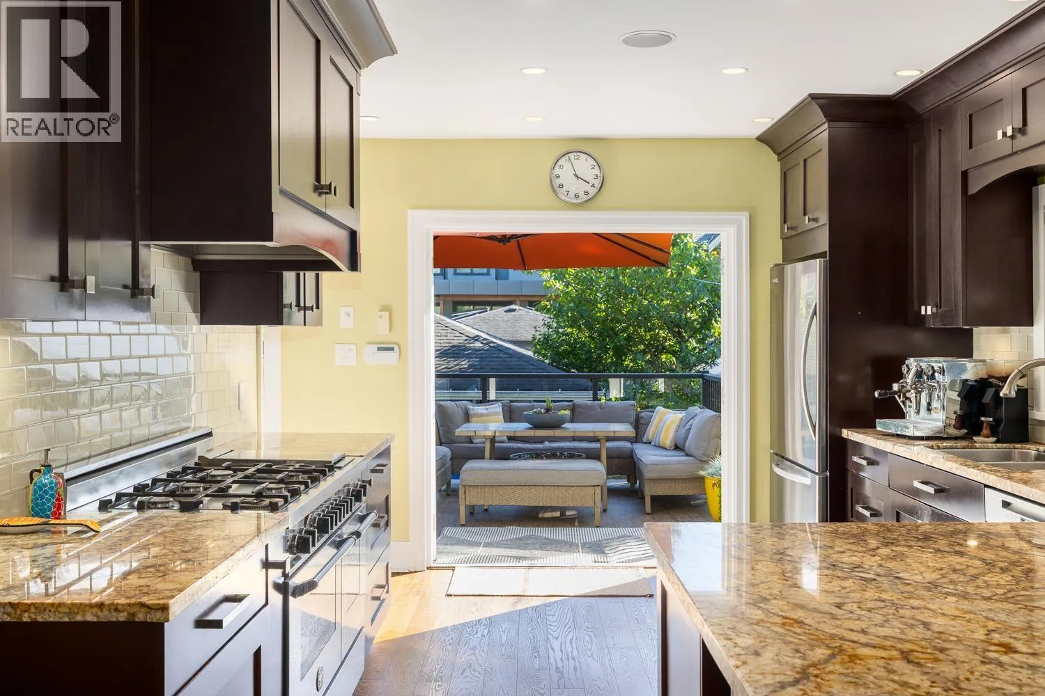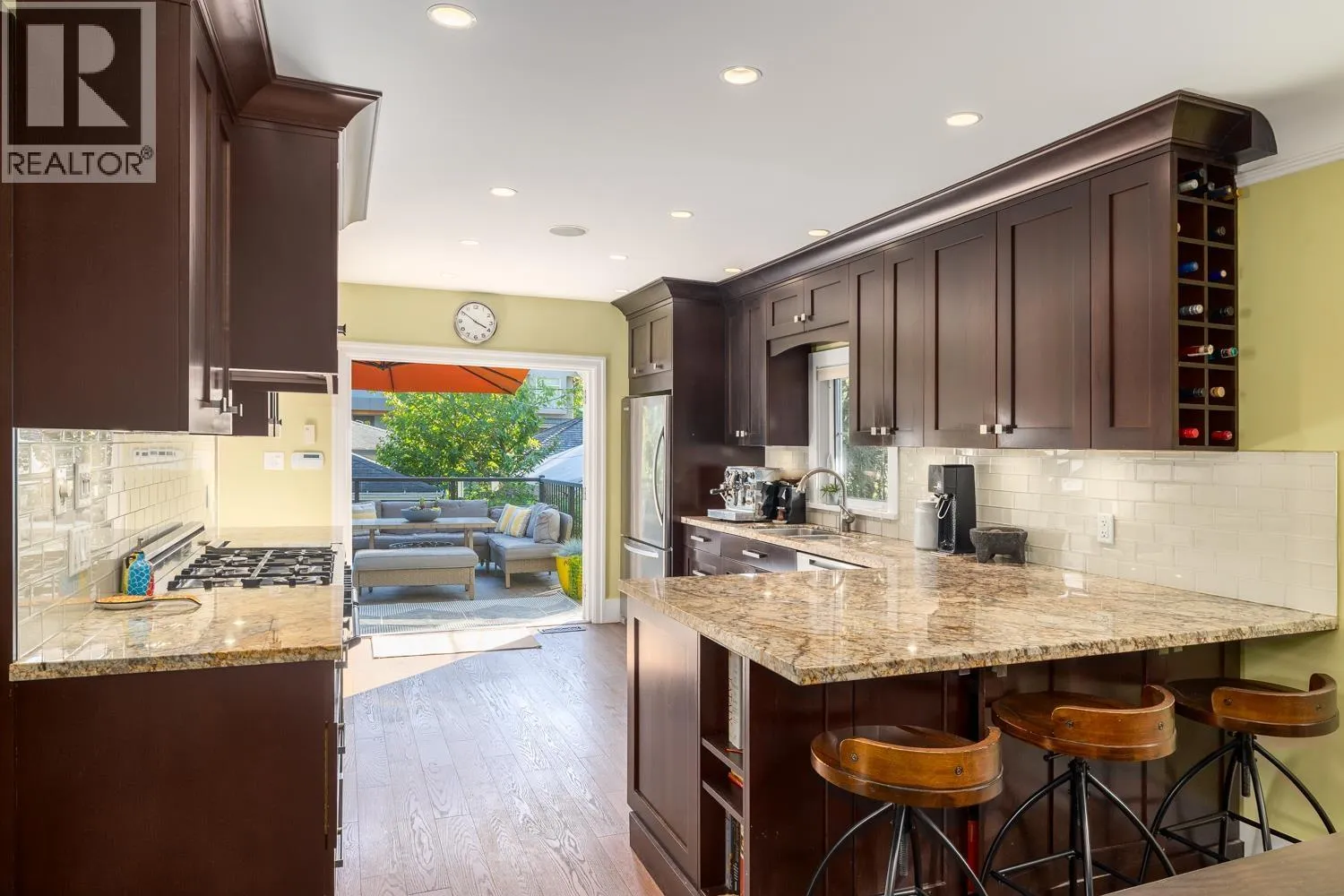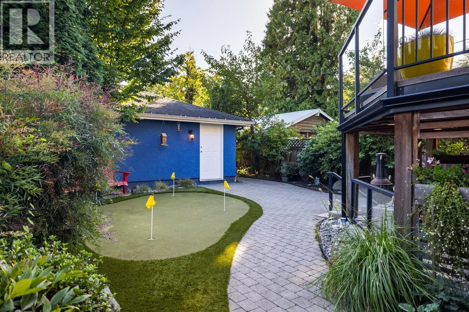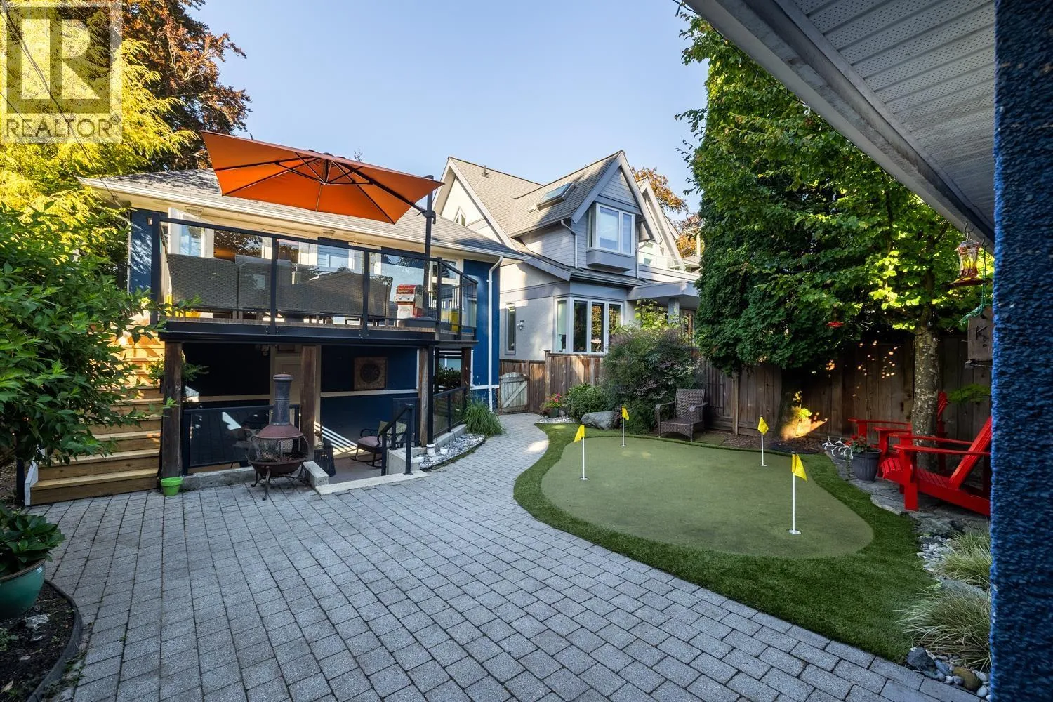 Welcome to this meticulously & fully renovated home - w/permits 2011, where modern luxury meets classic charm in a sought-after Kitsilano. This 5 bed home boasts over 1900sqft of spacious & functional layout w/year-round comfort of A/C. Main level features an open living/dining area w/unique cove ceiling, custom mantel, & gas fireplace. Stunning chef´s kitchen was renovated w/granite countertop, s/s appliances with a top-of-the-line Italian Bertazzoni stove. Entertain on the oversized south facing deck. 2 beds on the main level & renovated bathroom. Lower level w/separate entrance features 3 bedrooms, laundry/utility room and 2 baths. Backyard is a private retreat with custom putting green, covered deck area Oversized garage w/Level 2 EV charger. (id:27476)