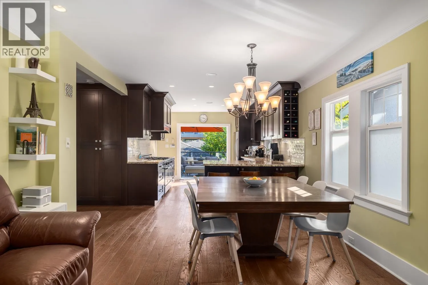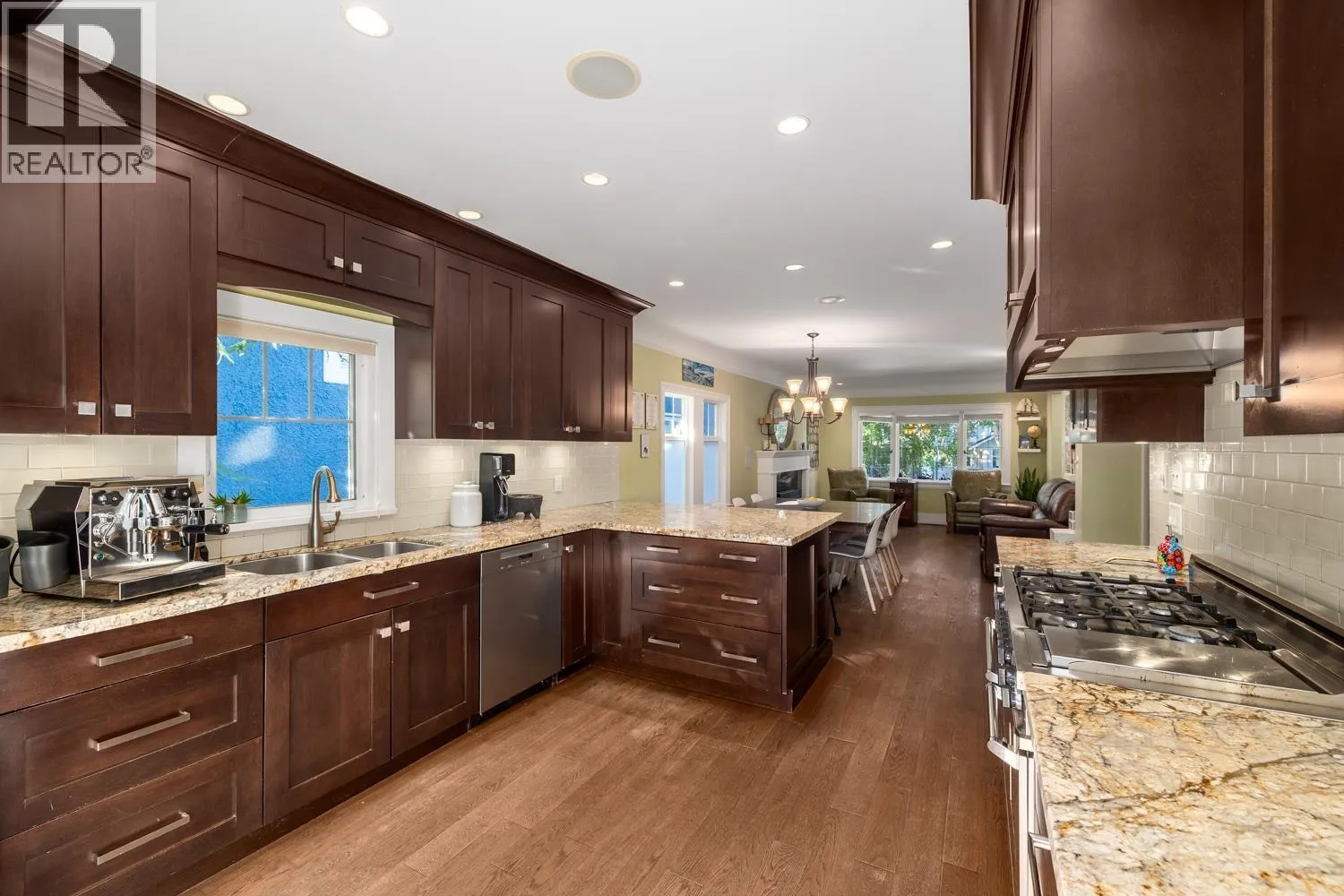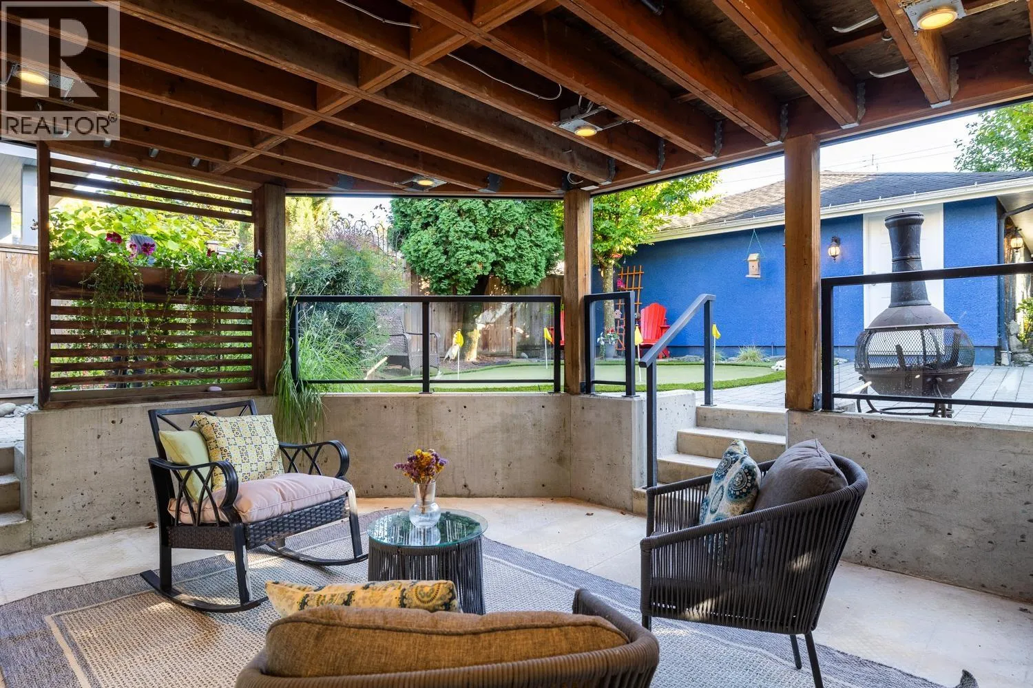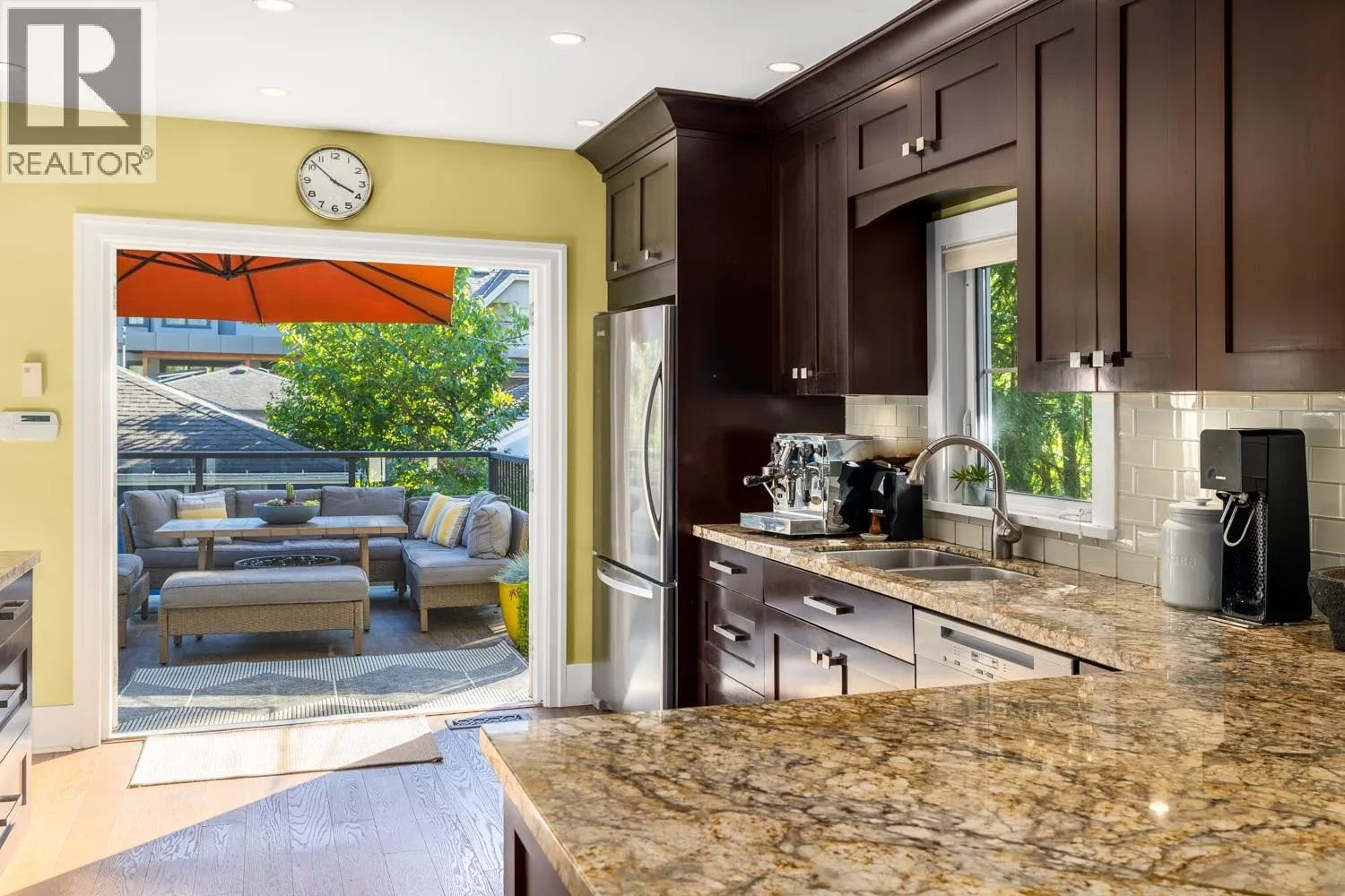Welcome to this meticulously & fully renovated home - w/permits 2011, where modern luxury meets classic charm in a sought-after Kitsilano. This 5 bed home boasts over 1900sqft of spacious & functional layout w/year-round comfort of A/C. Main level features an open living/dining area w/unique cove ceiling, custom mantel, & gas fireplace. Stunning chef´s kitchen was renovated w/granite countertop, s/s appliances with a top-of-the-line Italian Bertazzoni stove. Entertain on the oversized south facing deck. 2 beds on the main level & renovated bathroom. Lower level w/separate entrance features 3 bedrooms, laundry/utility room and 2 baths. Backyard is a private retreat with custom putting green, covered deck area Oversized garage w/Level 2 EV charger. (id:27476)