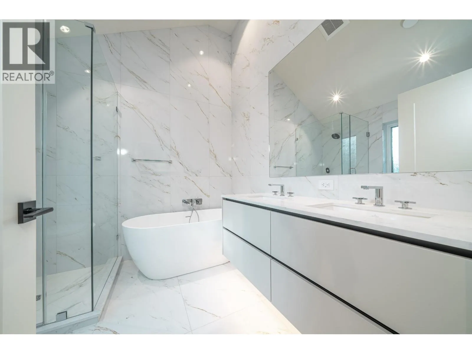 Brand new 1/2 duplex on a quiet street in prestigious Dunbar, offering over 2,600 sqft of elegant living. Features include a 2-bedroom legal suite, soaring ceilings, spacious deck overlooking the green yard, and a gourmet kitchen with top-quality S/S appliances and granite finishes. Comfort and convenience with heat pump, A/C, HRV, and security system. The basement includes a rec room with full bath, ideal as a guest suite. A Zero Emissions home with rooftop solar panels for daily energy use. In top school catchments-Lord Byng Secondary & Queen Elizabeth Elementary. Close to parks, shops, transit, UBC, and beaches. Must see! (id:27476)