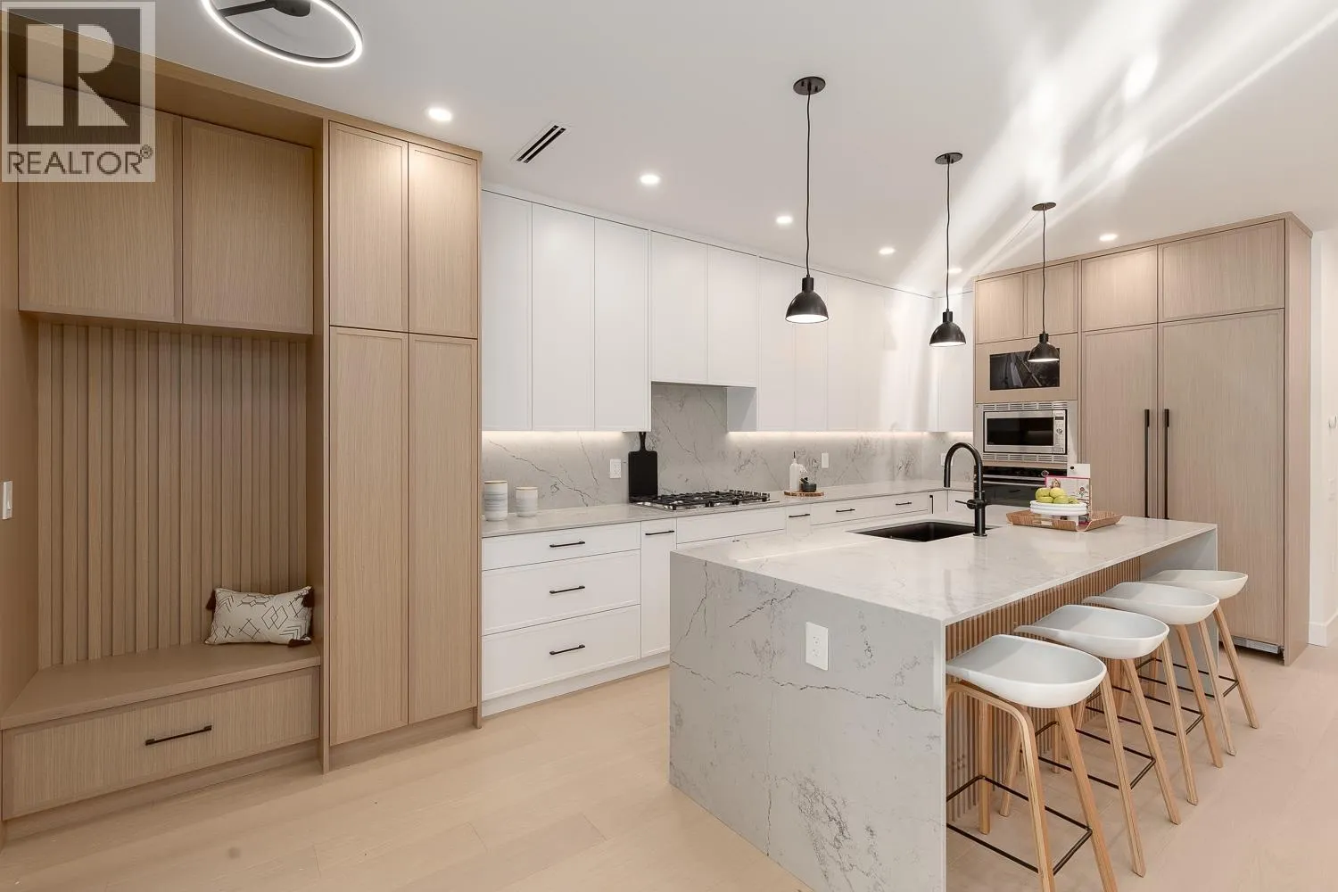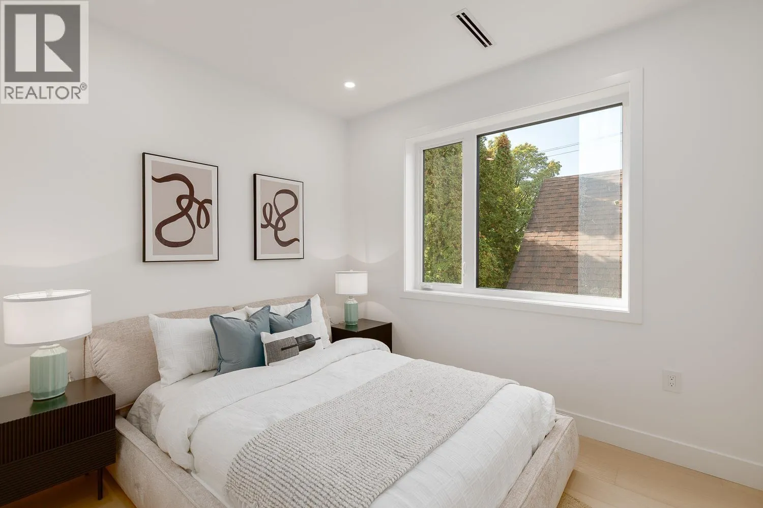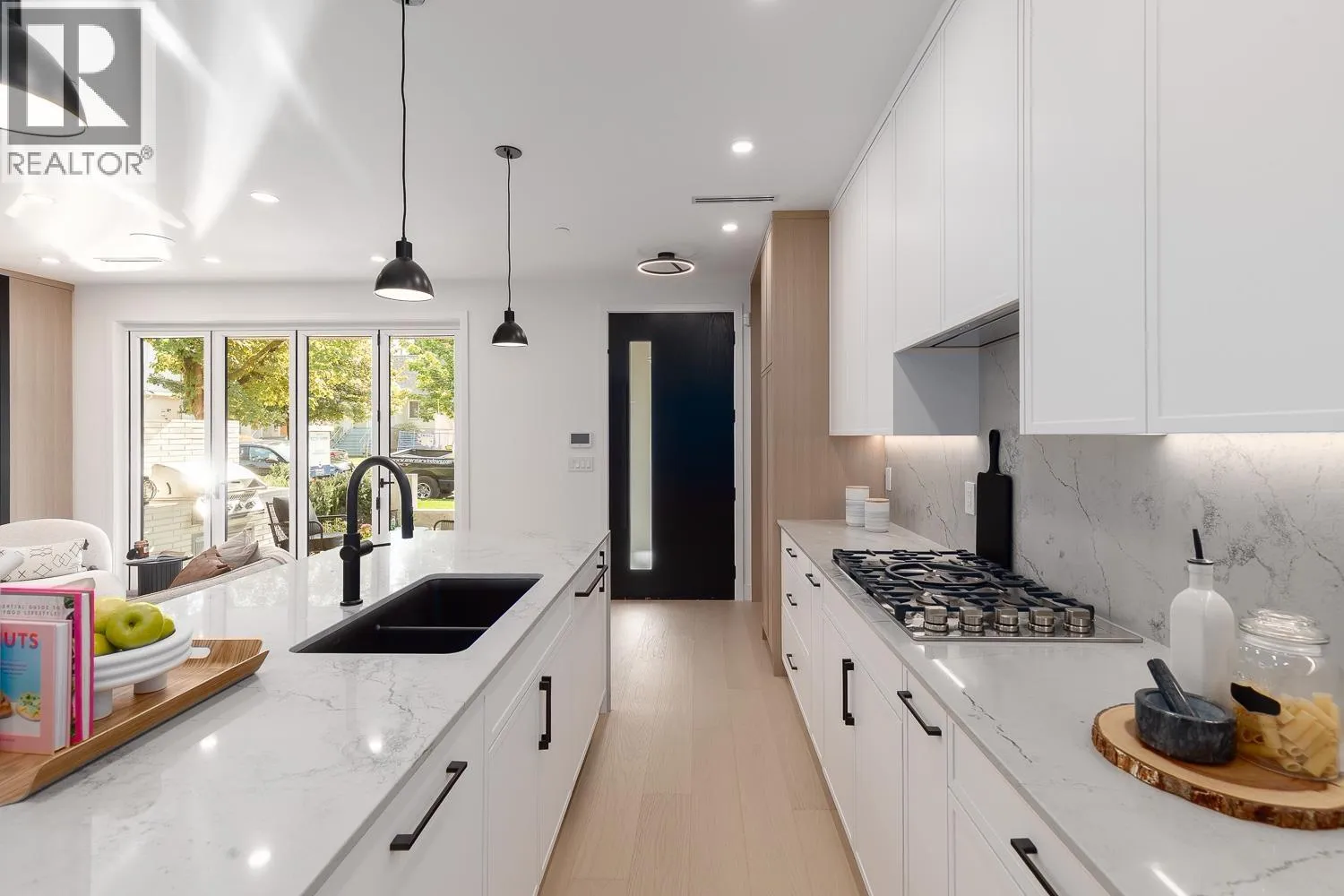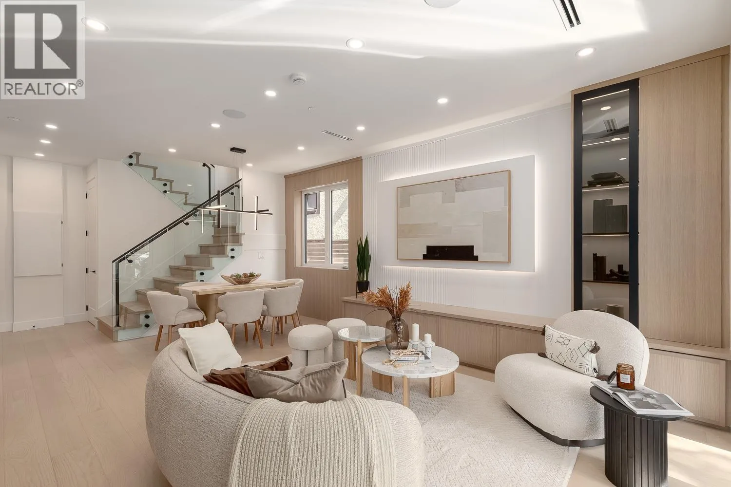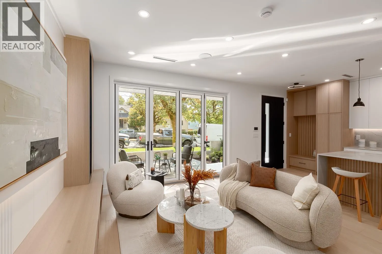 Front 1/2 duplex in coveted Cambie Village offering 1,900 sq.ft., 4 bedrooms & 3.5 baths. South-facing front terrace with Eclipse doors connects the bright living space to an outdoor kitchen for seamless entertaining. Oversized designer kitchen showcases integrated cabinetry & extensive millwork. Top floor loft is a highly functional 4th space with built-in desk, lounge area & ensuite primary featuring a curbless shower & room for a king bed. Private 1-car garage, radiant heat, A/C, Google thermostats, built-in surround sound & 4-camera security provide modern comfort. Exceptional walkability to Hillcrest Park, farmers market, shops & restaurants with quick access to Downtown & Kitsilano. (id:27476)