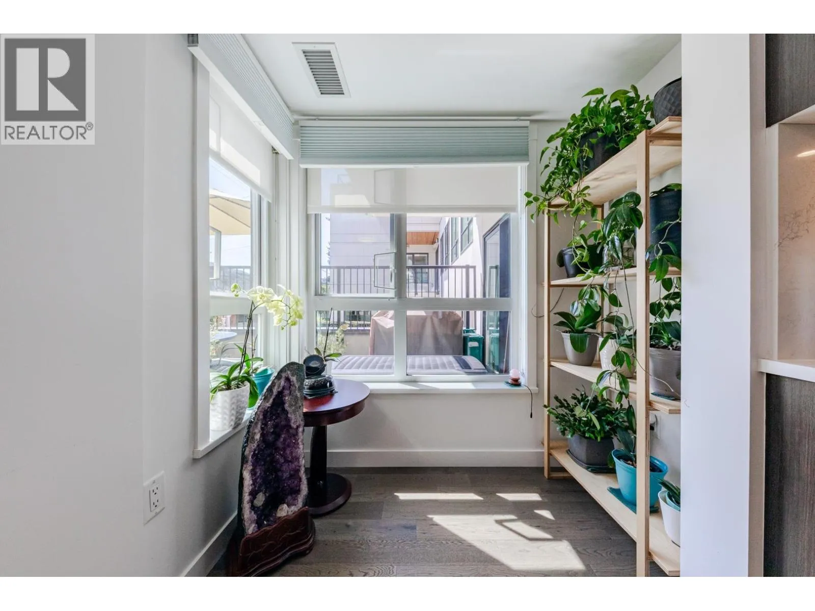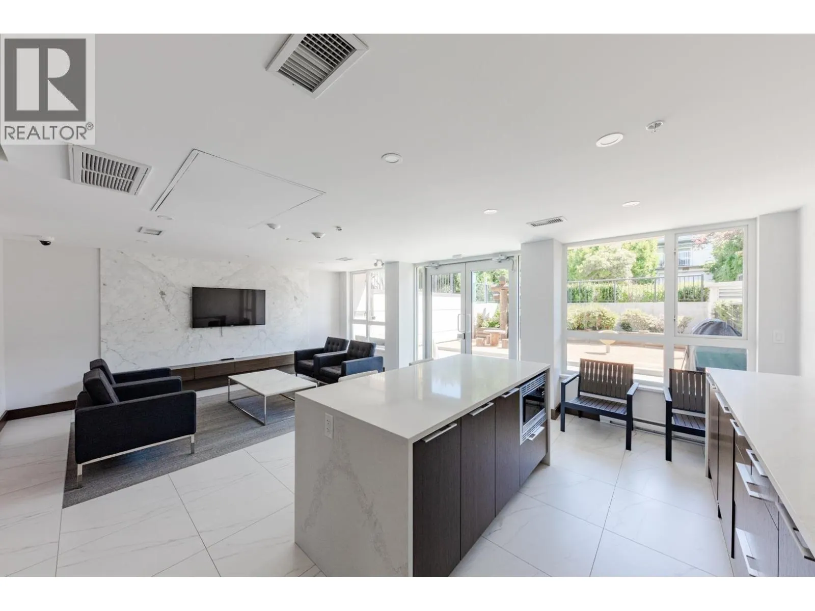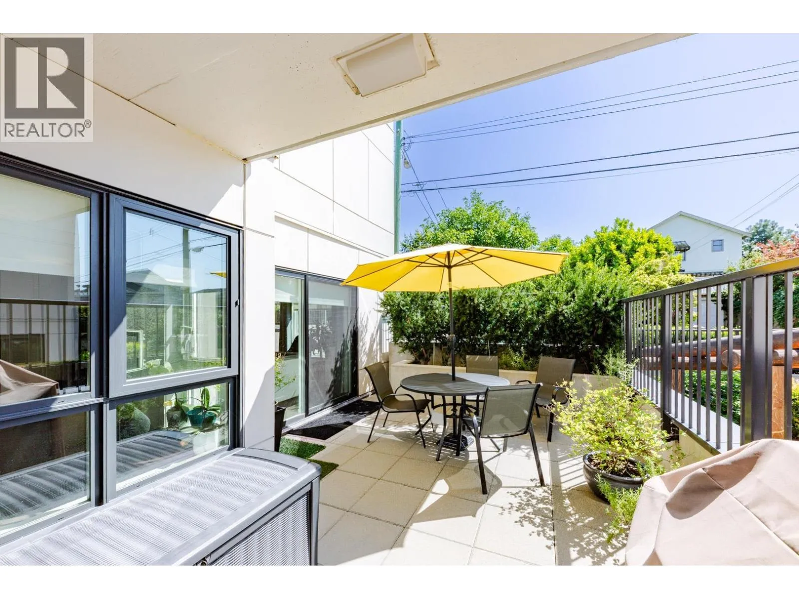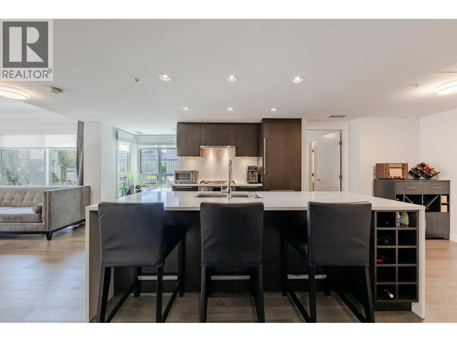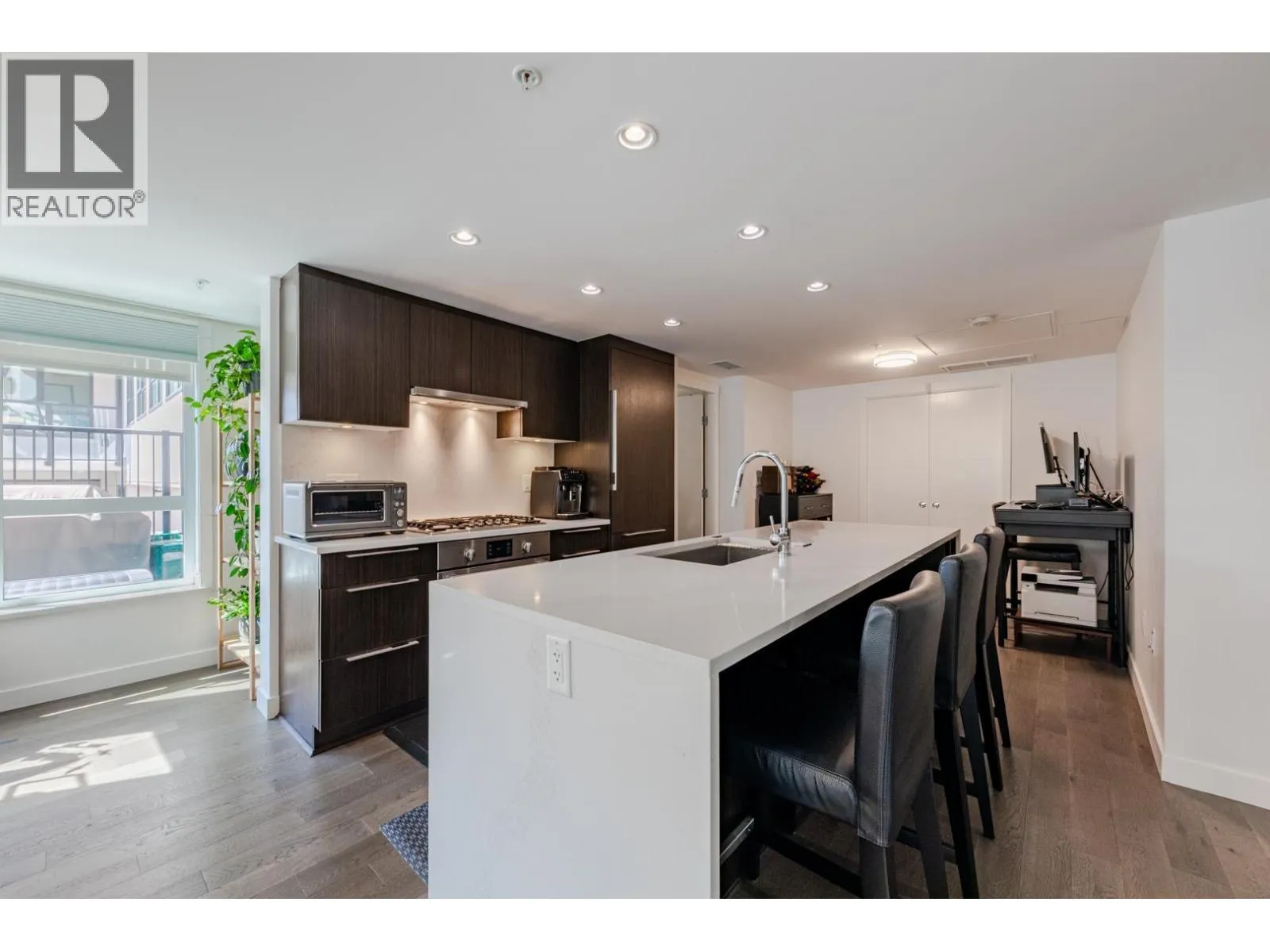Welcome to The Leveson, nestled in the vibrant South Granville neighborhood. This QUIET (away from Granville) ground-floor, single-level 2 Bedroom + Office home boasts 460 square ft of private outdoor space. With its elegant, contemporary A/C design and dual access from the street and building, it feels more like a townhome. The chef-inspired kitchen features premium Bosch appliances, a gas cooktop, and quartz countertops with a sleek waterfall edge. The spacious primary bedroom easily fits a king-sized bed, includes a large walk-in closet, and a luxurious double vanity ensuite. Two generous patios with gas hookup are ideal for BBQs and entertaining. Unbeatable location near transit, shops, dining, and top Vancouver schools. Includes 1 EV parking and upgraded locker attached to the stall. (id:27476)