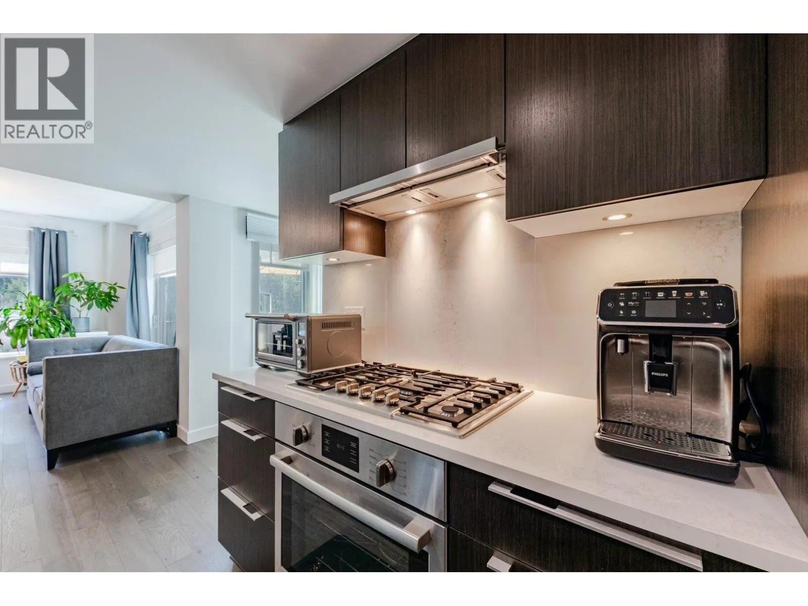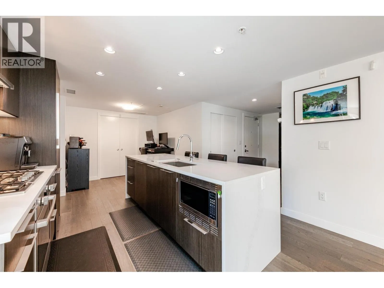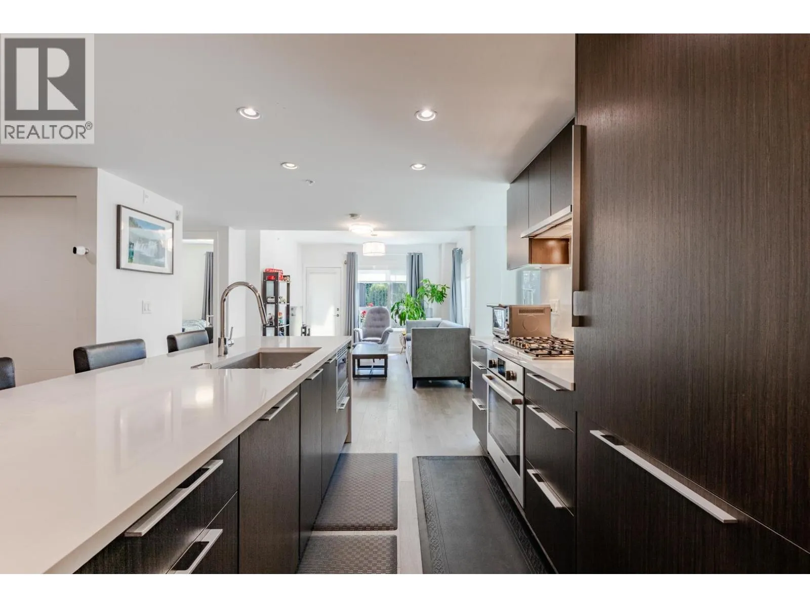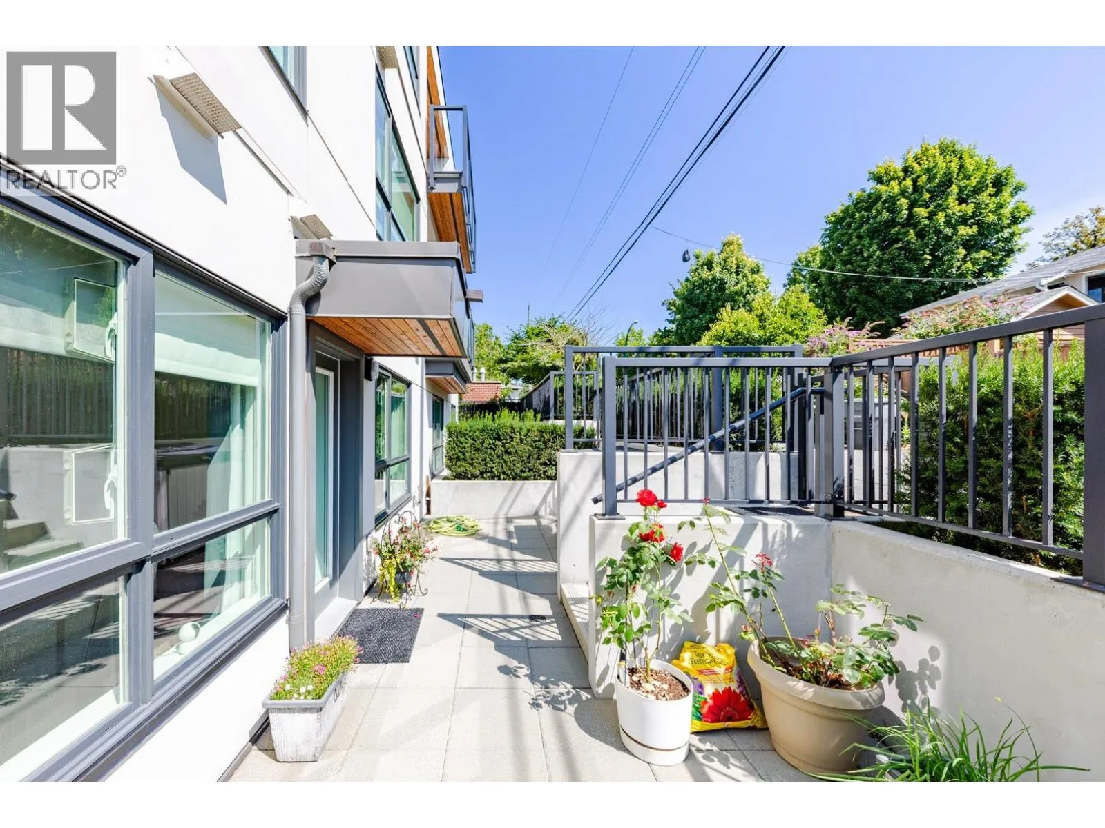 Welcome to The Leveson, nestled in the vibrant South Granville neighborhood. This QUIET (away from Granville) ground-floor, single-level 2 Bedroom + Office home boasts 460 square ft of private outdoor space. With its elegant, contemporary A/C design and dual access from the street and building, it feels more like a townhome. The chef-inspired kitchen features premium Bosch appliances, a gas cooktop, and quartz countertops with a sleek waterfall edge. The spacious primary bedroom easily fits a king-sized bed, includes a large walk-in closet, and a luxurious double vanity ensuite. Two generous patios with gas hookup are ideal for BBQs and entertaining. Unbeatable location near transit, shops, dining, and top Vancouver schools. Includes 1 EV parking and upgraded locker attached to the stall. (id:27476)