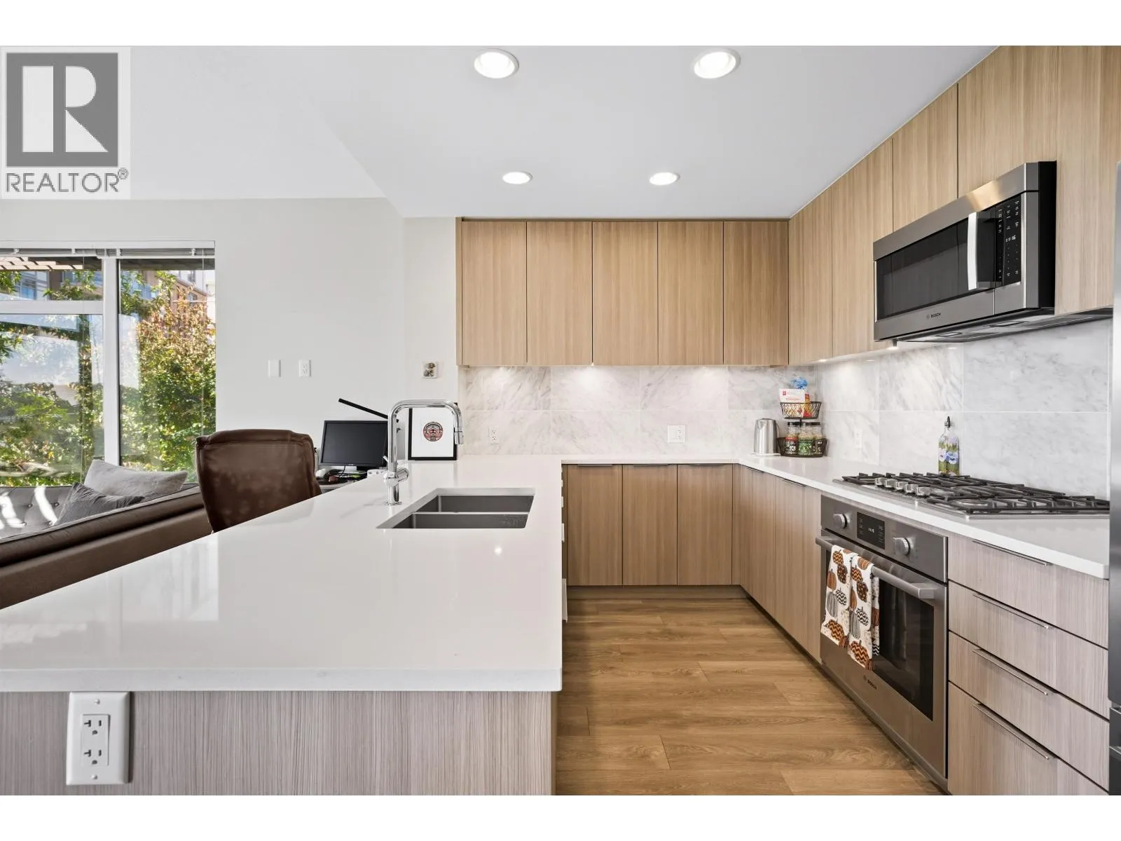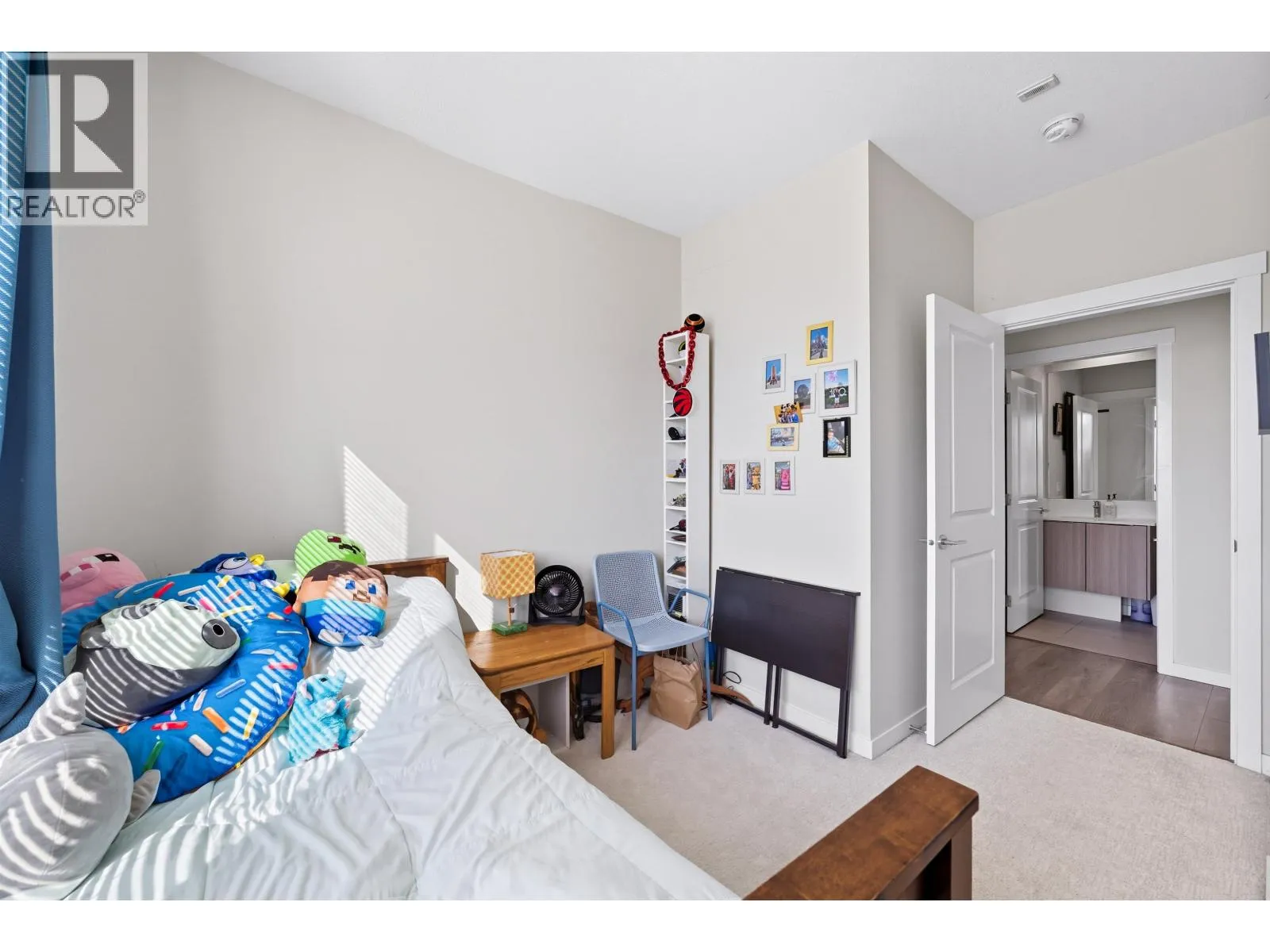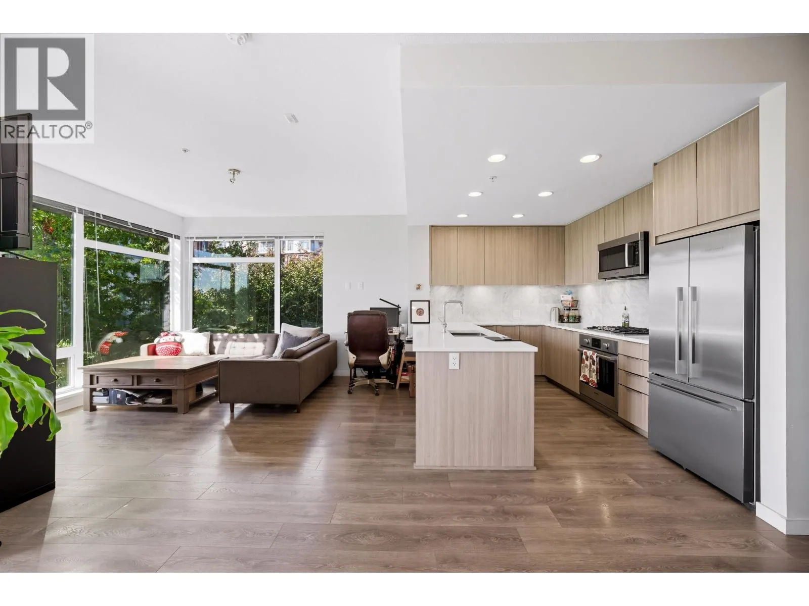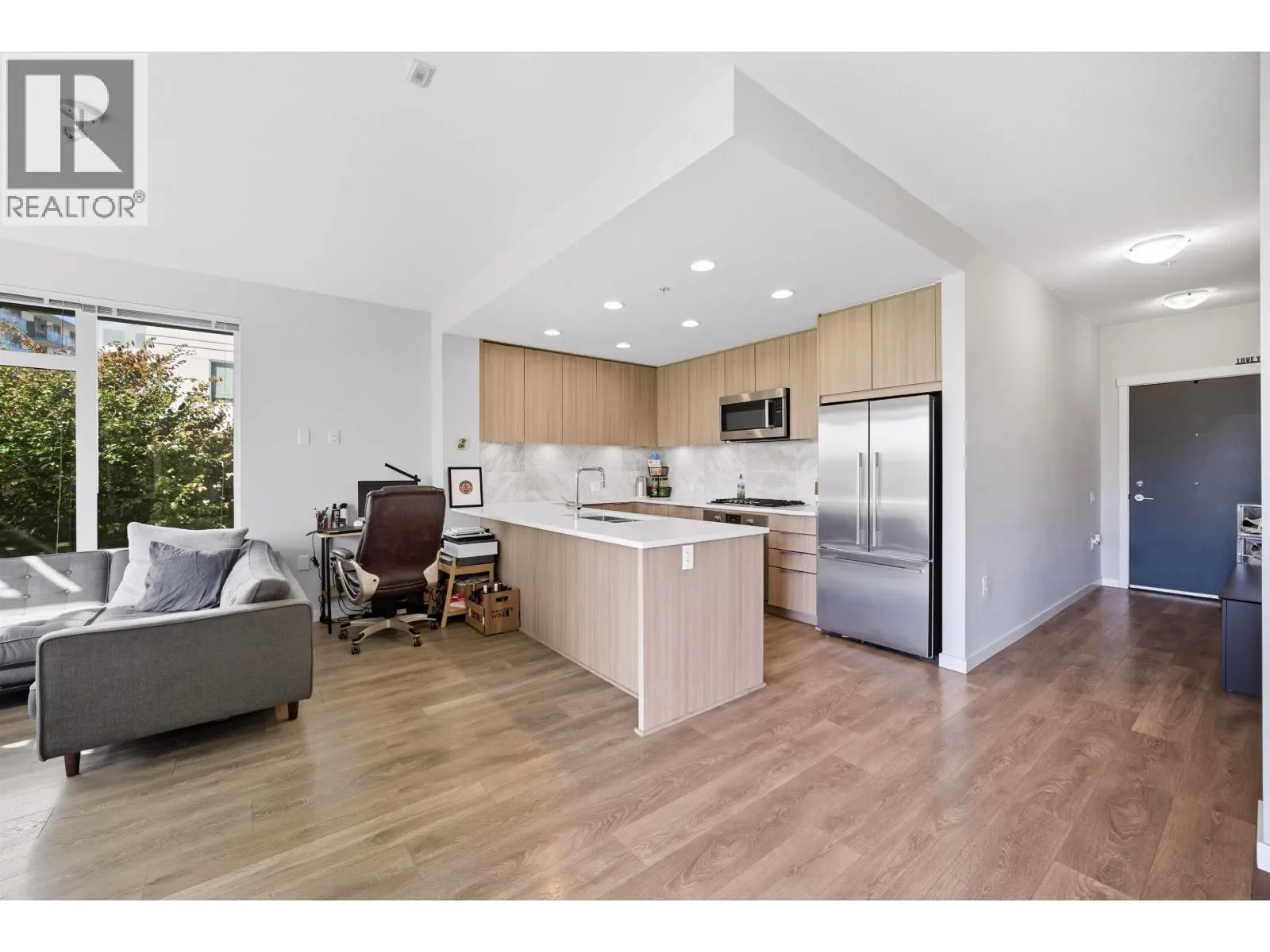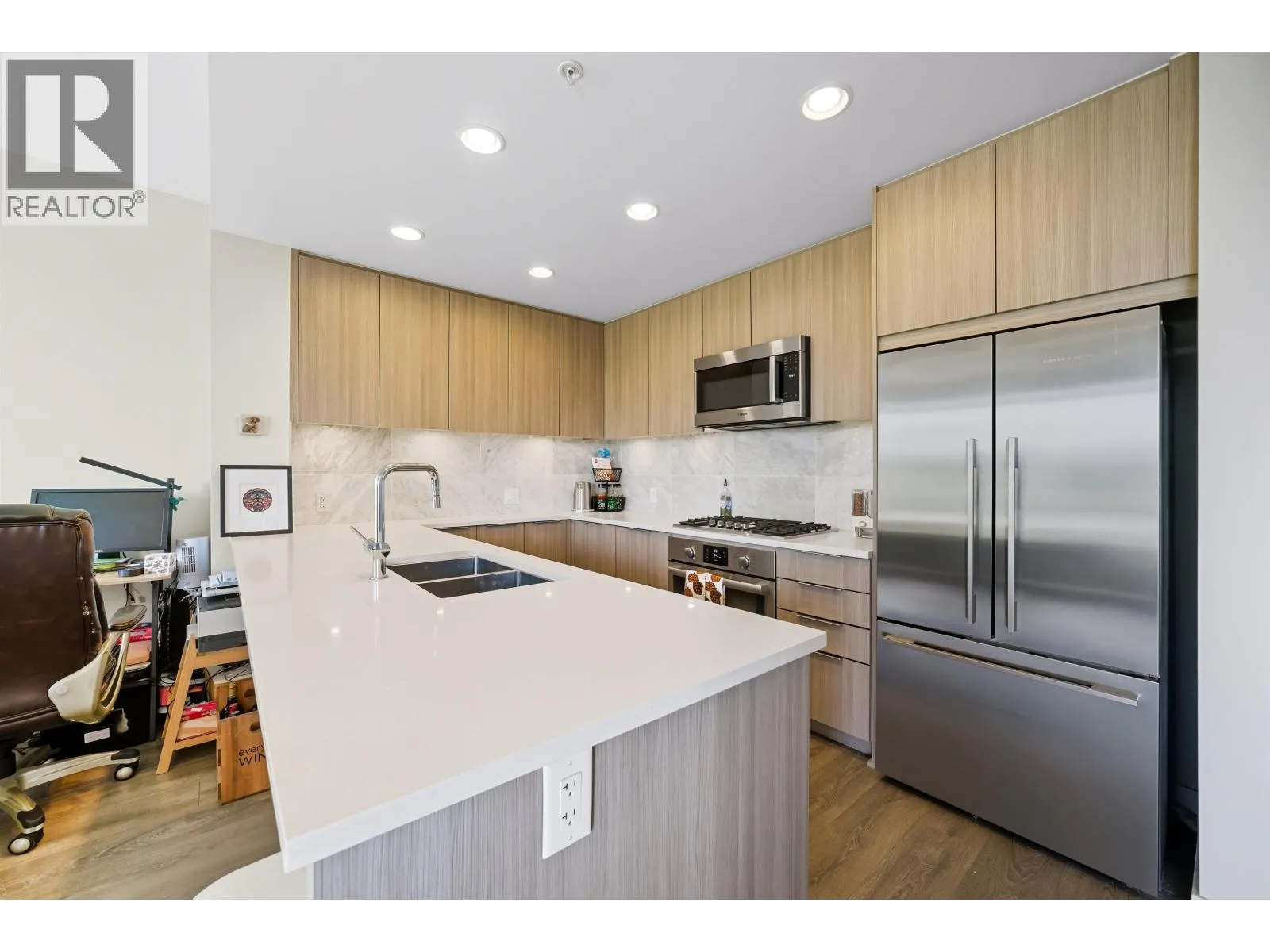 Welcome to R&R by Polygon built in 2018 in the River District. This modern, open concept CORNER UNIT is over 1,000 sqft with 2 bed & 2-bath PLUS a den/flex room/pantry & features floor to ceiling windows. The home has an open layout, in-floor radiant heating, & laminate flooring throughout. The gourmet kitchen features stainless steel appliances, gas range & quartz countertops with an island which is great for entertaining. The primary bedroom fits a king-sized bed & has a walk-in closet & a spa-like ensuite with double vanities. The pet-friendly building offers a fully equipped fitness center & 1 parking stall. It is located within a master-planned community with a future elementary school and community center and is steps from scenic trails, parks, a grocery store, restaurants. (id:27476)