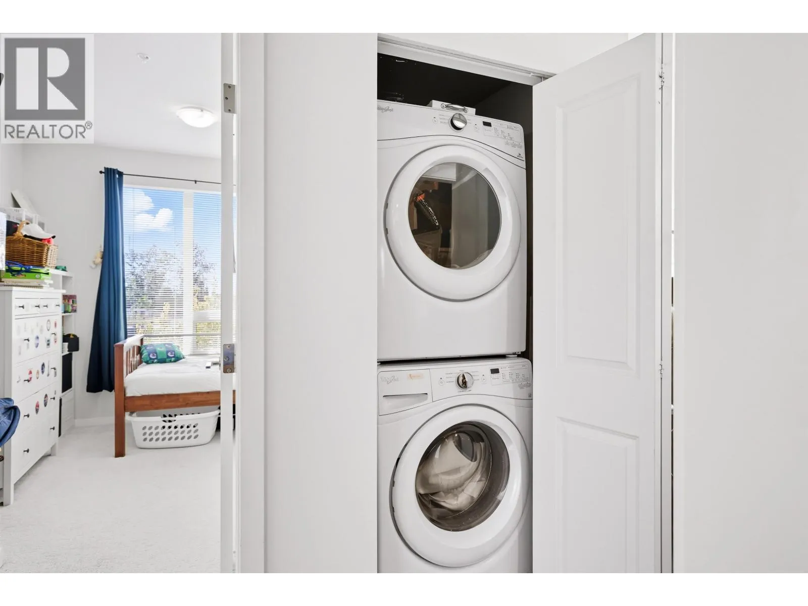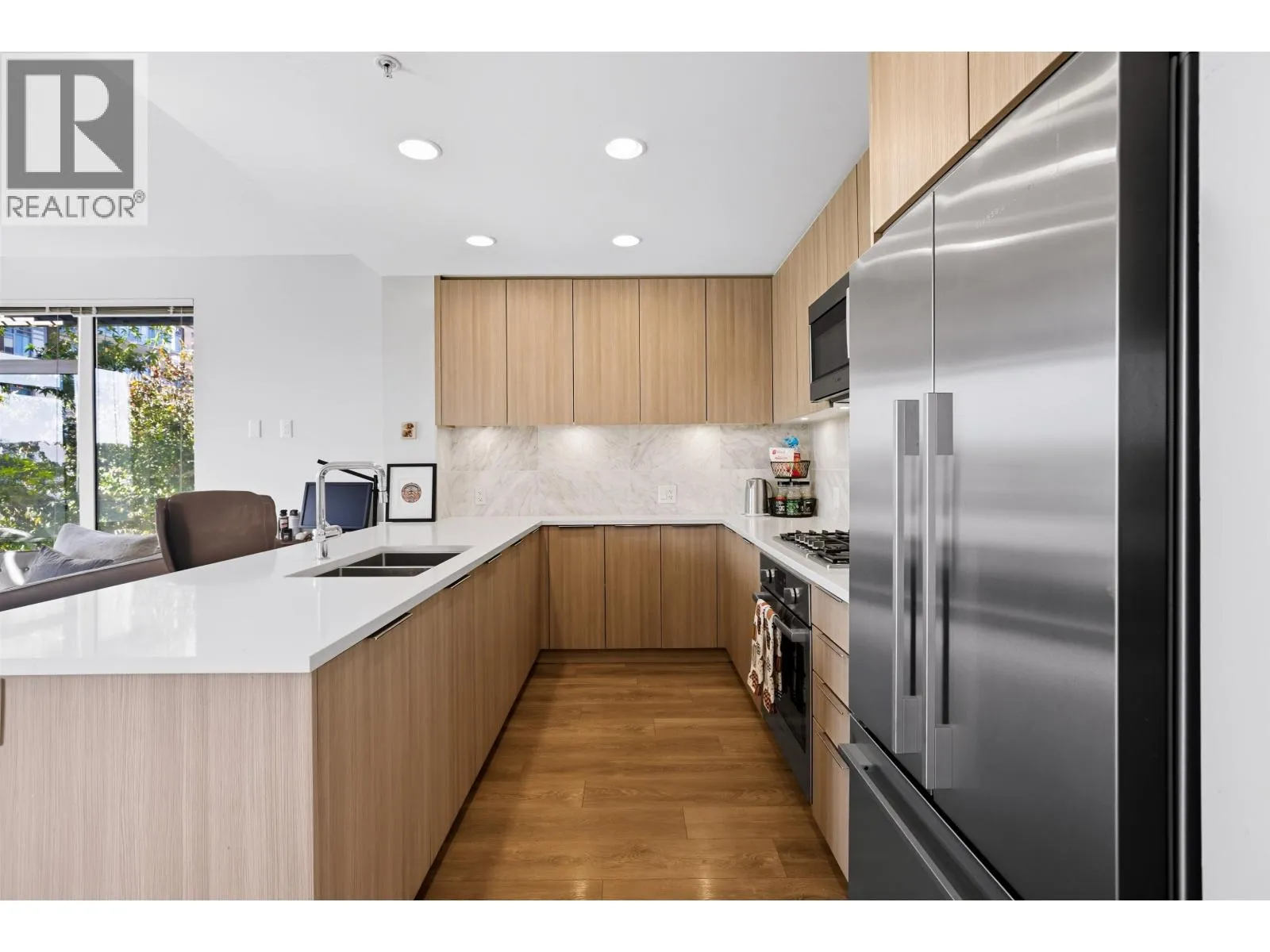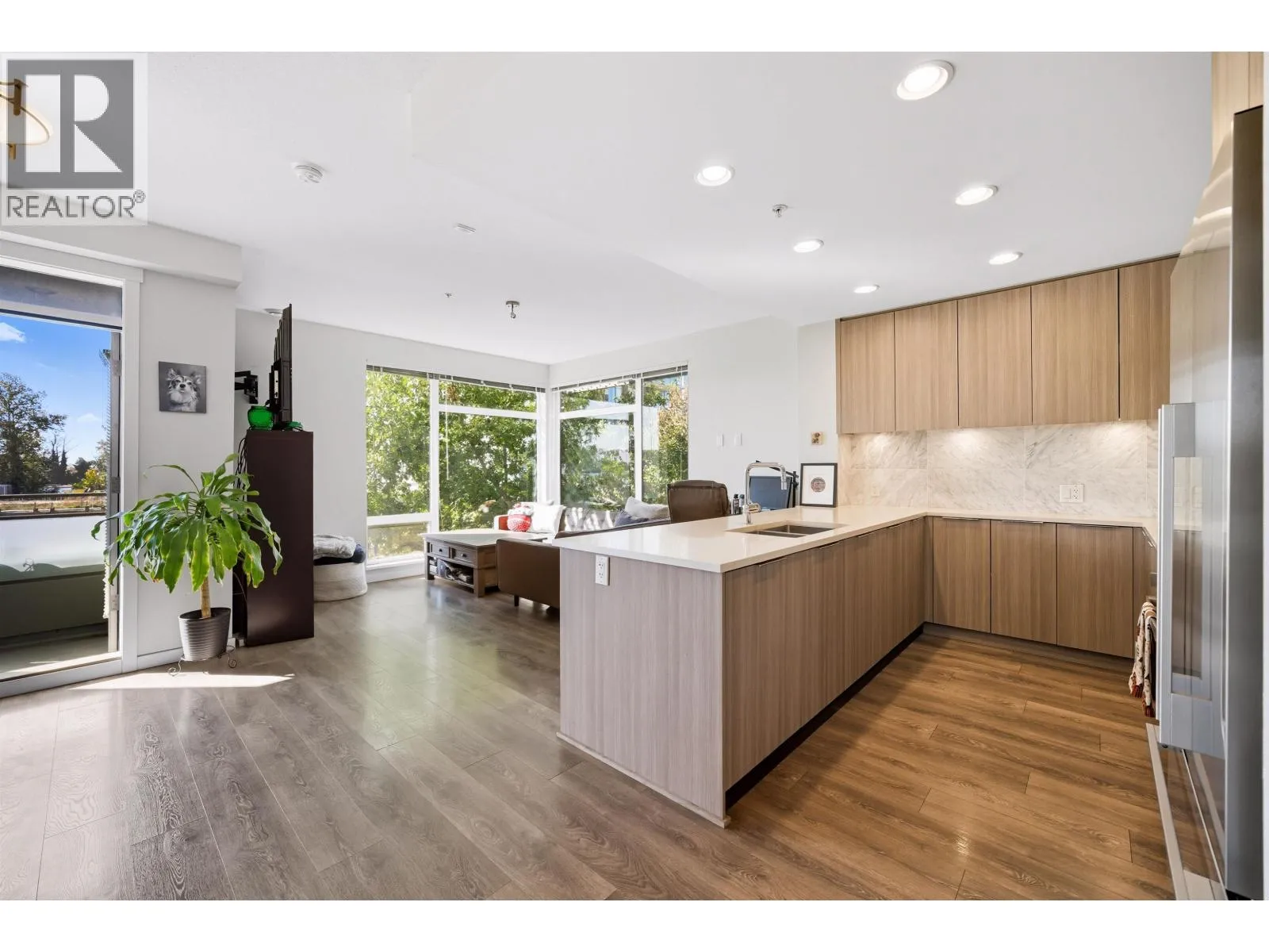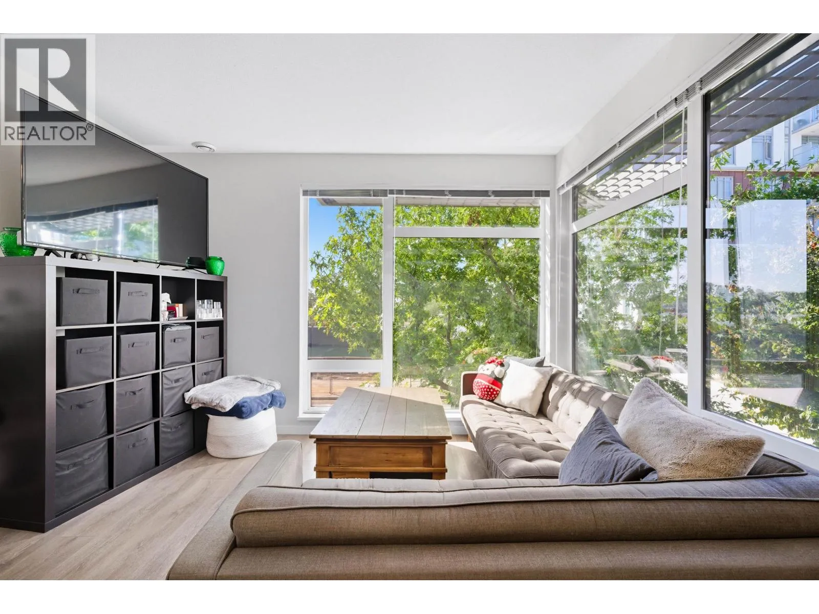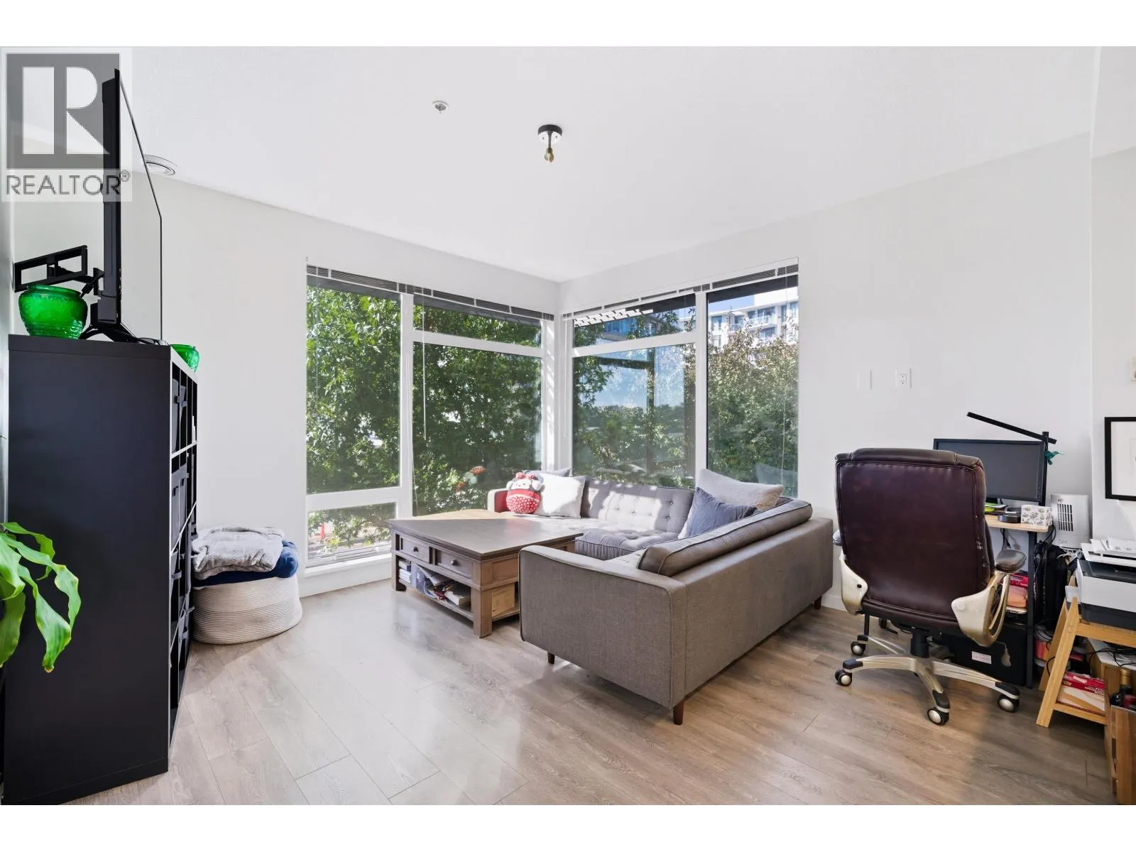 Welcome to R&R by Polygon built in 2018 in the River District. This modern, open concept CORNER UNIT is over 1,000 sqft with 2 bed & 2-bath PLUS a den/flex room/pantry & features floor to ceiling windows. The home has an open layout, in-floor radiant heating, & laminate flooring throughout. The gourmet kitchen features stainless steel appliances, gas range & quartz countertops with an island which is great for entertaining. The primary bedroom fits a king-sized bed & has a walk-in closet & a spa-like ensuite with double vanities. The pet-friendly building offers a fully equipped fitness center & 1 parking stall. It is located within a master-planned community with a future elementary school and community center and is steps from scenic trails, parks, a grocery store, restaurants. (id:27476)