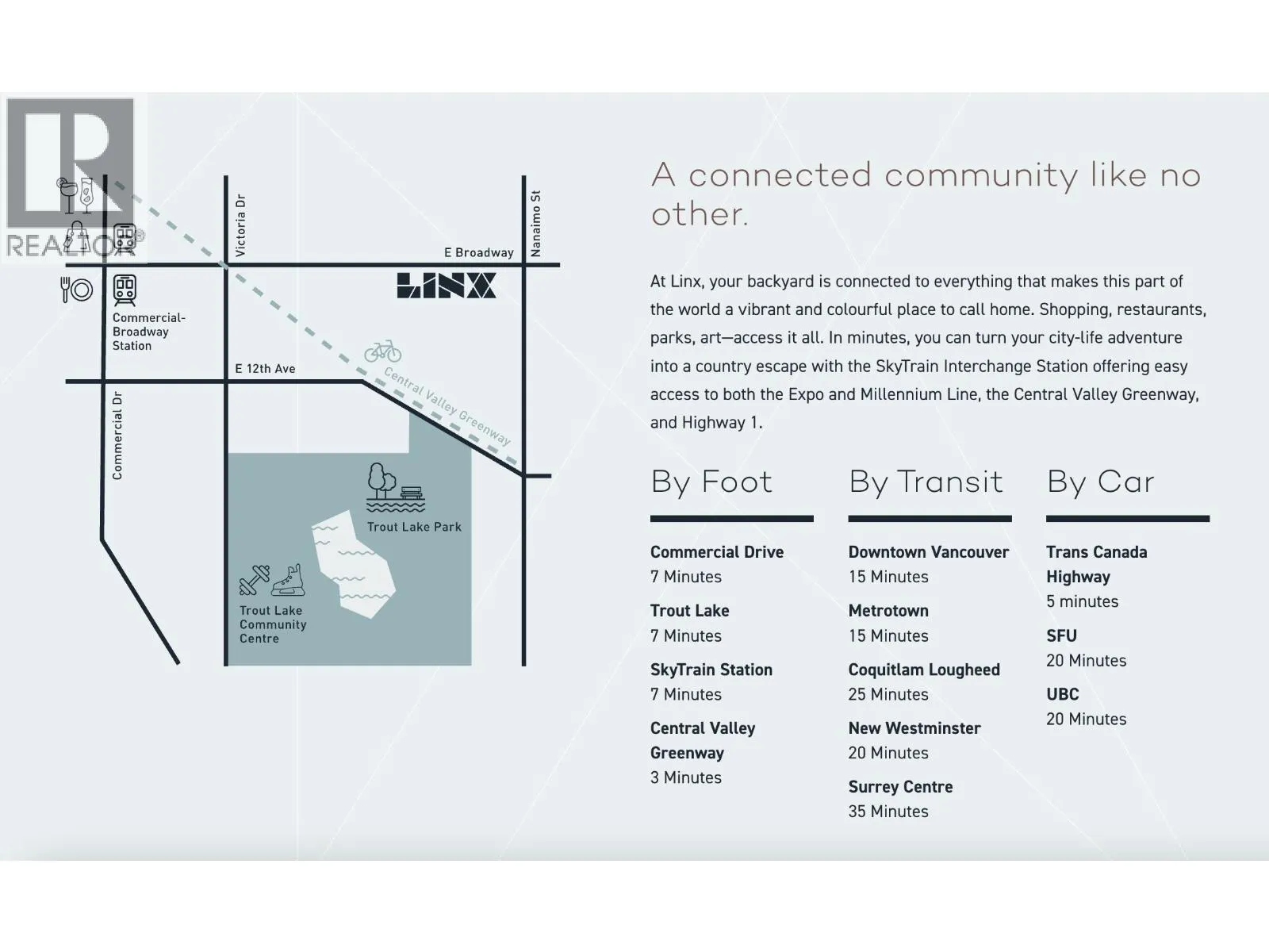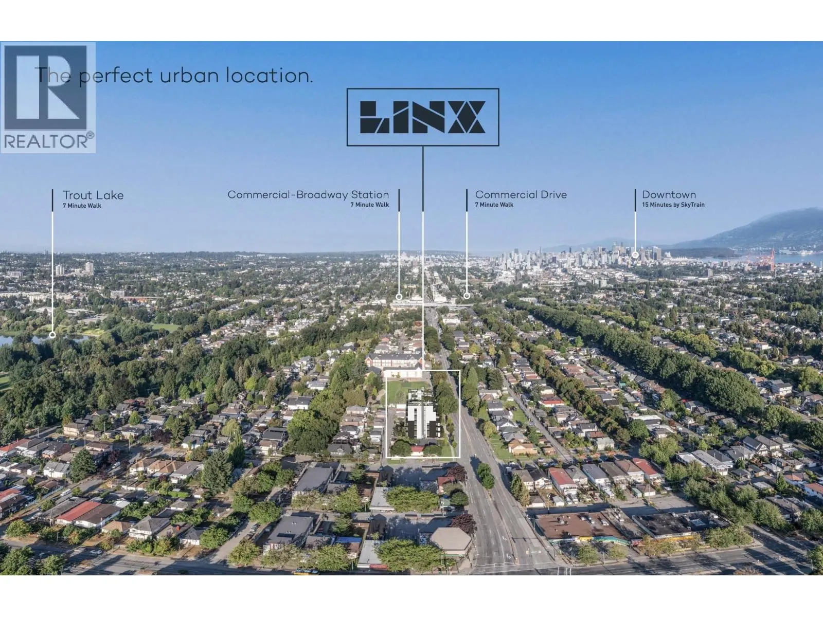 LINX by Lotus Capital in vibrant Grandview-Woodland. This 1 bed + flex home offers 548 square ft of efficient living plus a 100 square ft balcony for indoor-outdoor flow. The modern kitchen features quartz countertops, integrated European appliances and sleek two-tone cabinetry. An awesome layout with floor-to-ceiling windows brings in plenty of light. The flex space is ideal for an office or storage, and the primary bedroom includes a walk-in closet. Added perks include an upgraded bike locker. Located near top hotspots: Trout Lake, Commercial Drive´s shops, cafés and restaurants, plus access to a private park and courtyard. Building amenities feature a rooftop lounge with BBQ and fire pit, co-working space with kitchen, community garden, kids´ play area & secure bike storage. MOTIVATED seller! Estimated completion in November (id:27476)