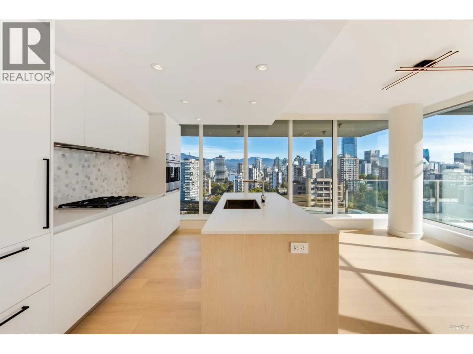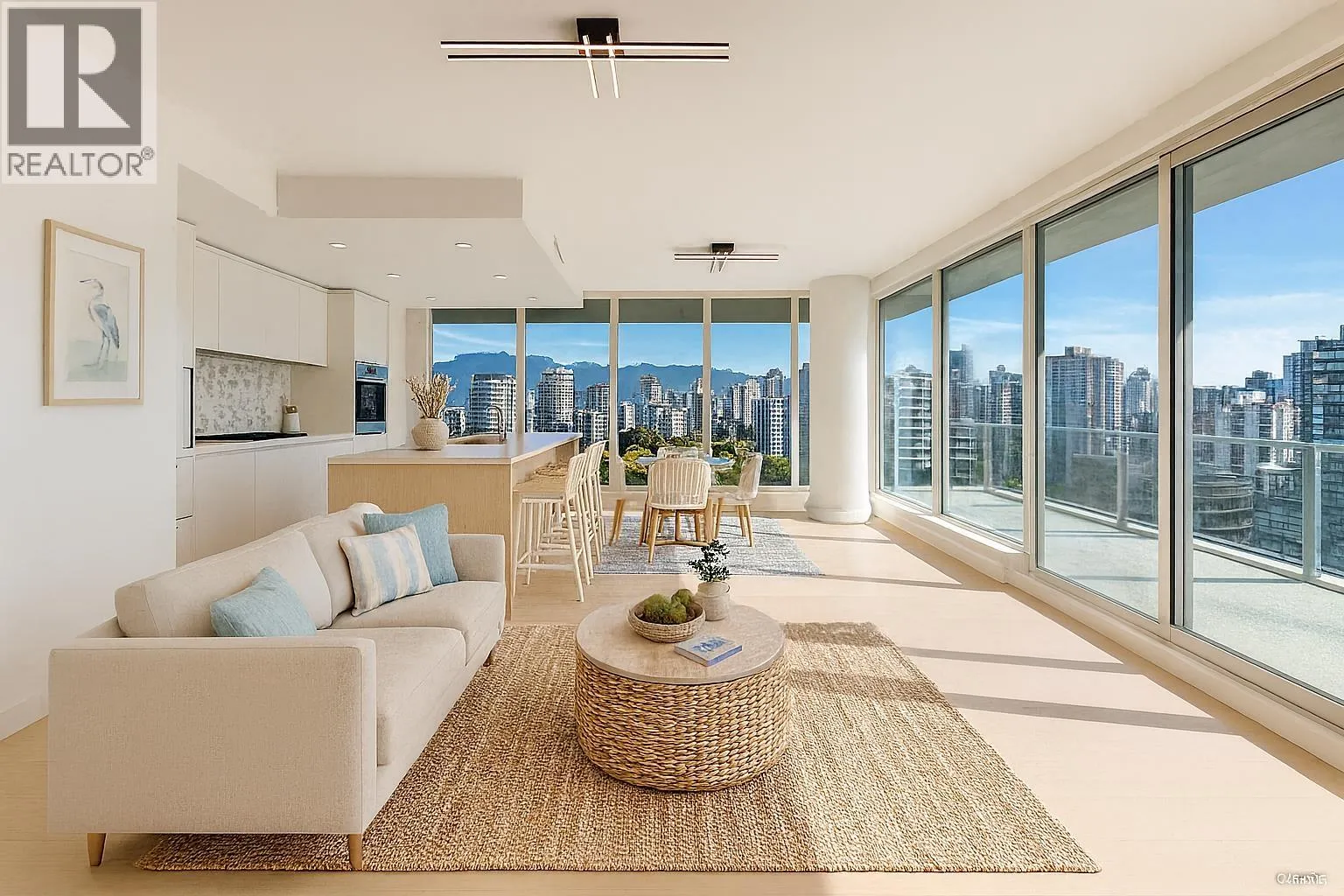 Incredible Views - at Mirabel by Marcon! This 2 bed, 2 bath NE corner home boasts floor-to-ceiling windows with panoramic ocean, city & North Shore mountain views plus a 200sf balcony with gas hookup. Gourmet kitchen features Armony Cucine cabinetry, Wolf gas cooktop + wall oven, and Sub-Zero fridge. Luxurious ensuite with Italian marble & double vanity. A/C, high-efficiency heating, and a versatile 2nd bedroom with custom built-ins, desk & Murphy bed. Comes with 2 side-by-side parking & 1 Locker. Steps to parks, seawall & shops. Unbeatable West End location only steps to shopping, parks & seawall. OPEN HOUSE SUN NOV 9 (2-4PM) (id:27476)