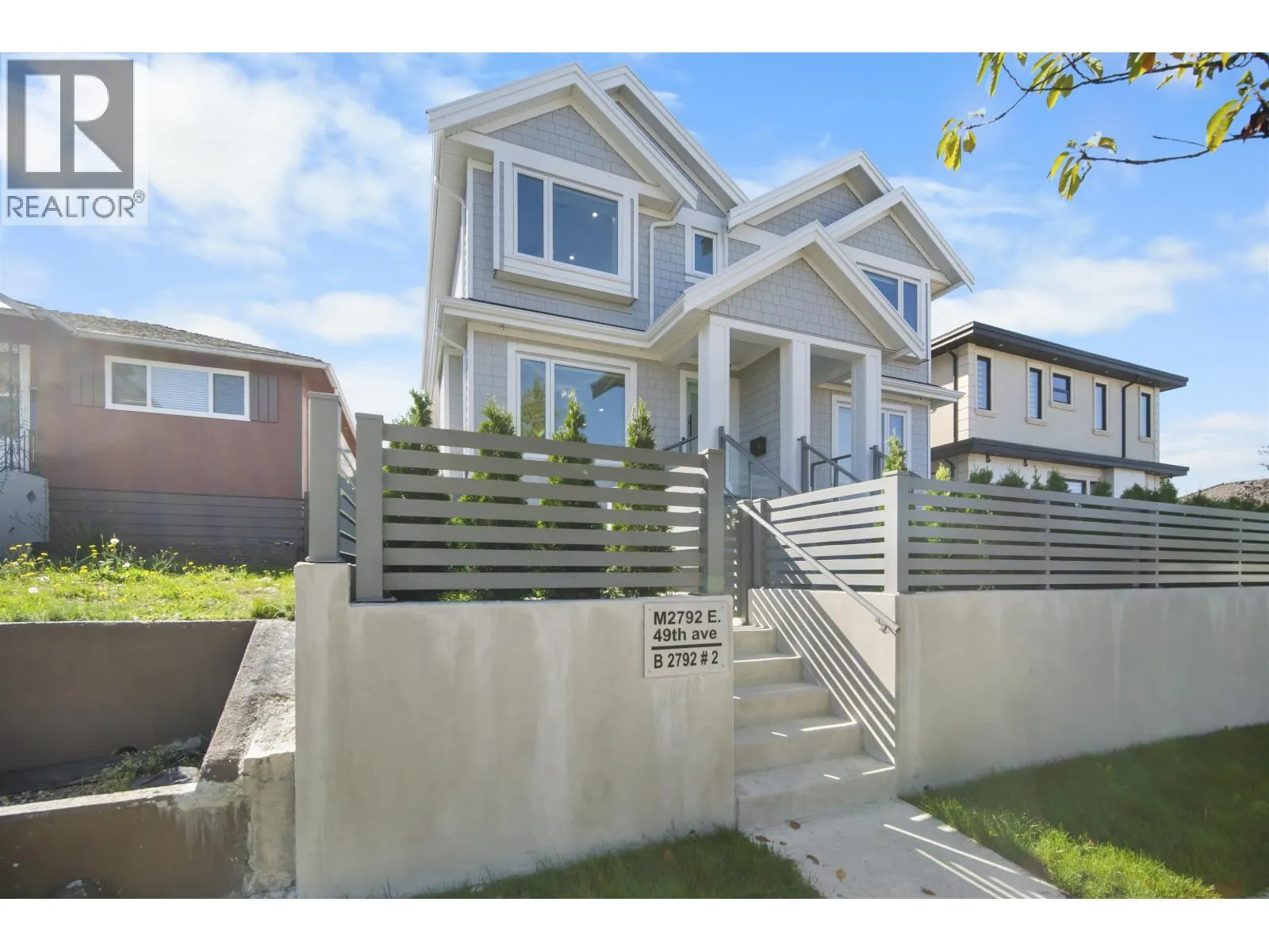 Welcome to 2792 e 49th Ave- A Stunning Brand-New Duplex in the Heart of Killarney! This 1878 + sqft 5 bedrooms & 4 bathrooms family residence offers a bright open concept main floor, 3 spacious bdrms plus a 2 bedroom suite at the basement, a great mortgage helper. Built with quality craftsmanship and attention to detail, this home provides both comfort and peace of mind. Features a chef-inspired kitchen,radiant heating,gleaming floors, HRV, A/C, Triple Glazed Windows, security system. Step outside to a covered deck off the kitchen-great for entertaining and BBQ's. South facing backyard. 2 parking spaces with EV charging.Close to parks, Killarney Community Centre, top-rated schools, shopping along Victoria Dr, and easy access to transit.This home blends style and everyday functionality. (id:27476)
