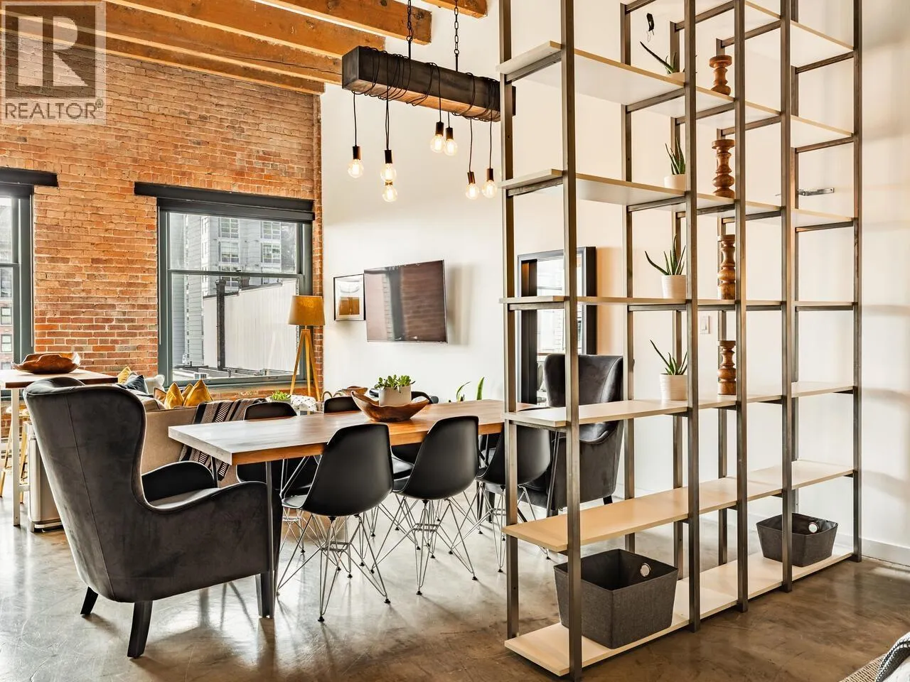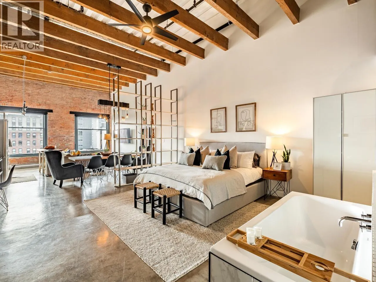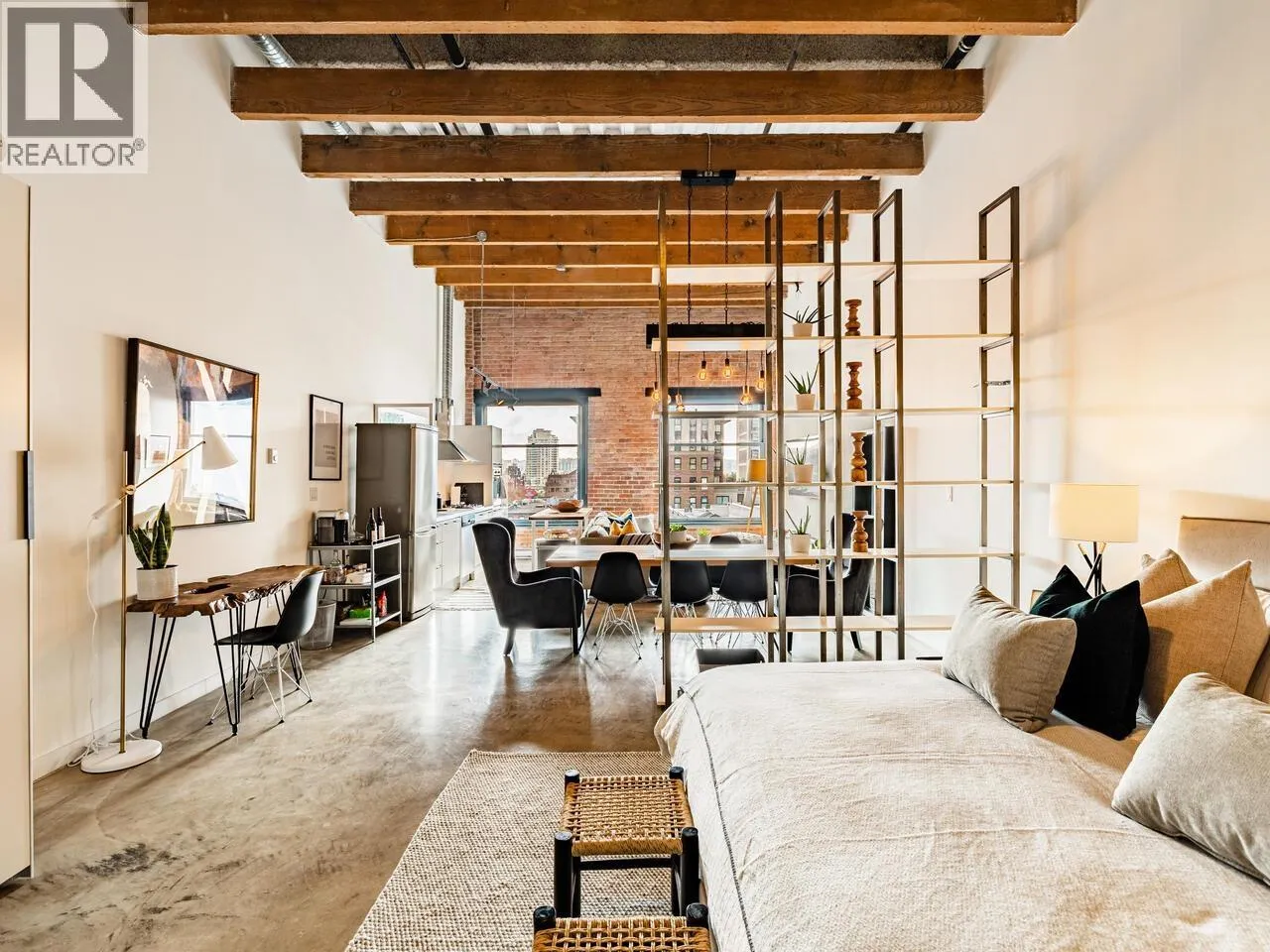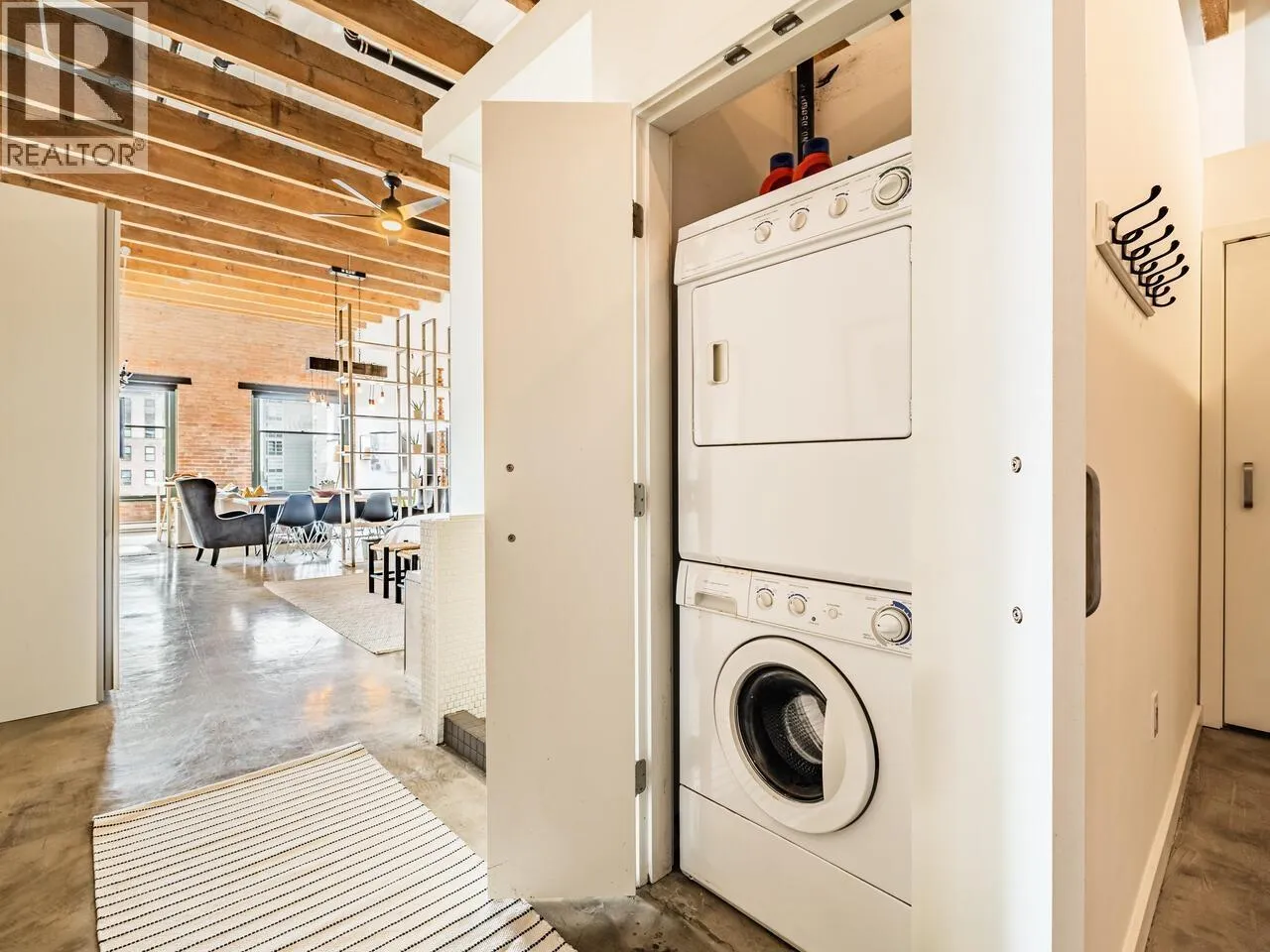 Located in historic Gastown, Koret Lofts offers open plan for New York style loft living. Rarely available 5th floor unit with ultra high ceiling soaring over 15 ft featuring original fir beam and exposed brick wall. This heritage building was converted by Alda Pereira design in 2006, where urban heritage meets modern living with concrete floors, euro kitchen, walk through shower and spa soaker tub. Commercial and residential zoning allows for office/studio/airbnb uses, ideal for home office with live/work space. Gated complex with a beautiful garden courtyard equipped with BBQ..Open House Sun, Oct 19,2025, 2-4pm (id:27476)